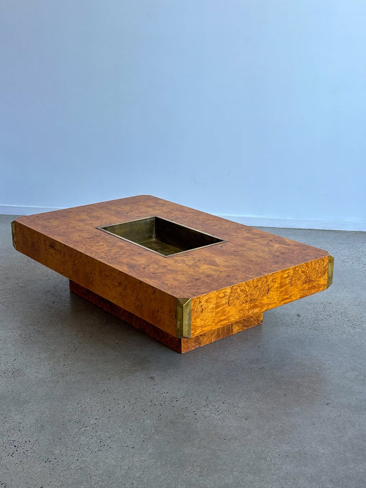 "Alveo" by Willy Rizzo for Mario Sabot Burlwood Brass Coffee Table 1970s