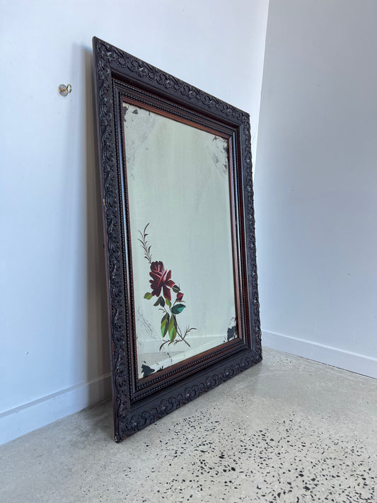Italian Walnut Rectangular Wall Mirror with Floral Artwork, 1950s