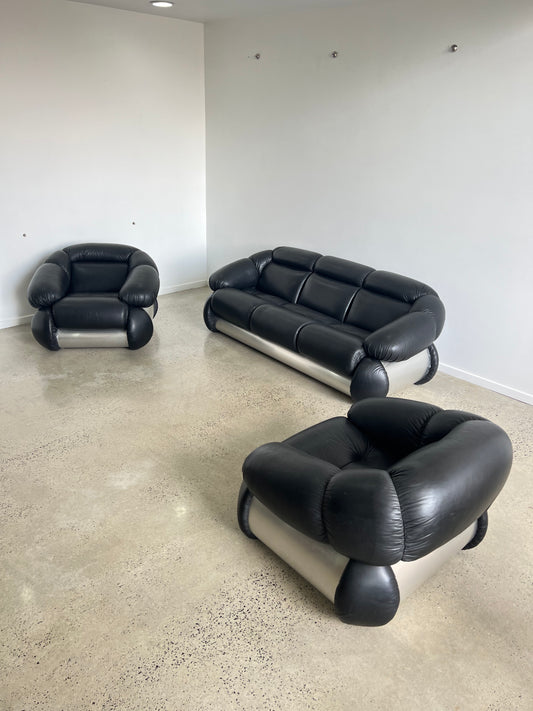 Adriano Piazzesi Black Leather Sofa Set and Armchairs, 1970s