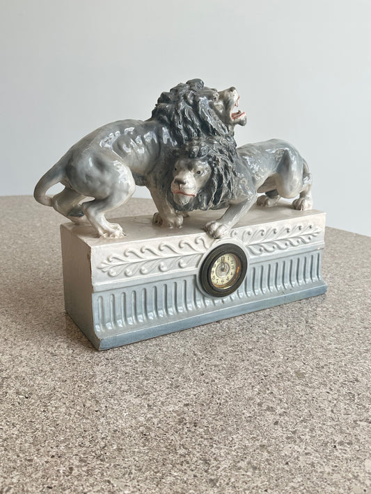 Italian Capodimonte Glazed Porcelain Lions Table Clock Sculpture, 1940s