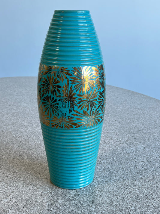 Italian Turquoise and Gold Floral Hand-Painted Ceramic Vase, 1960s