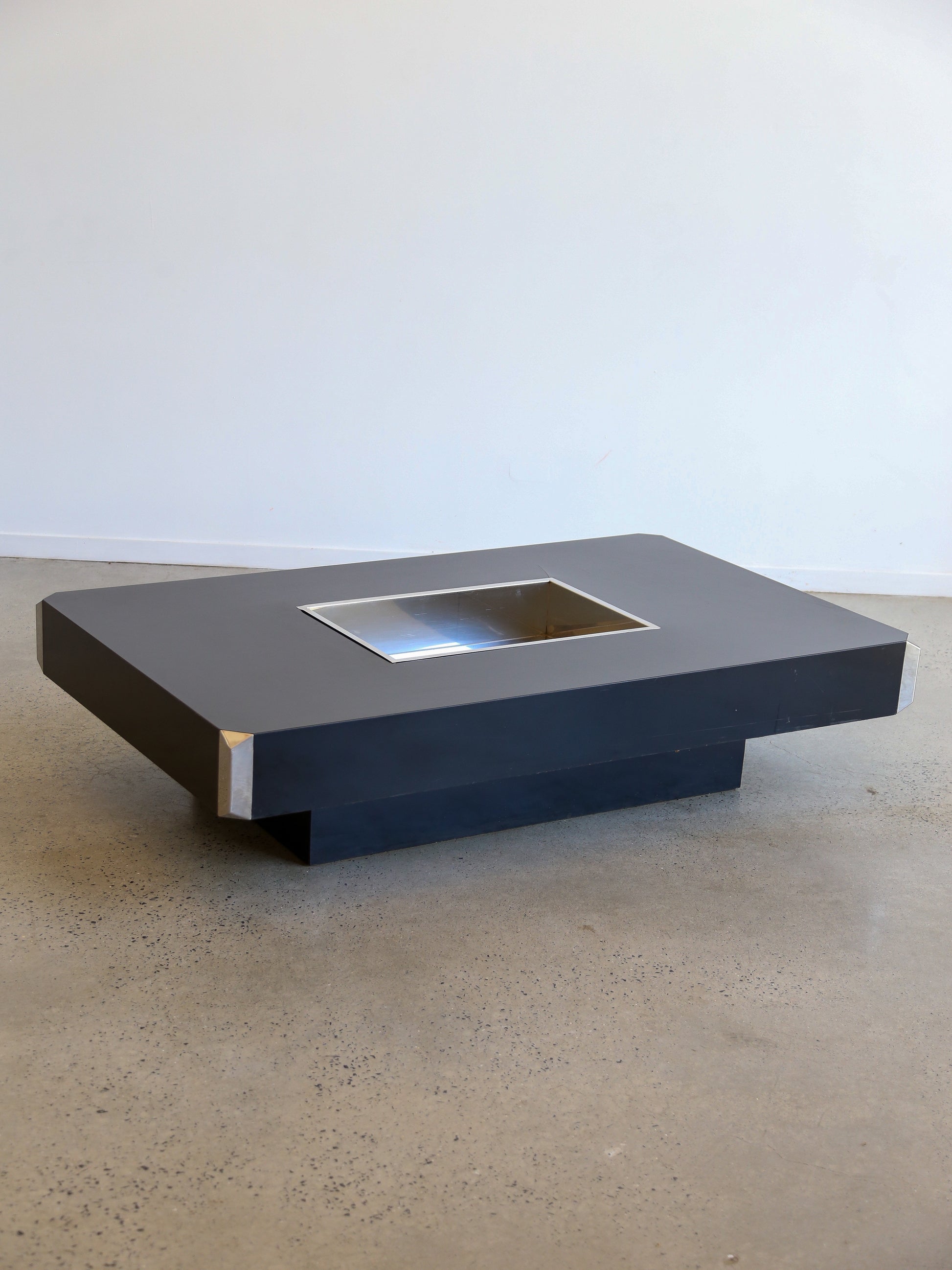 The recessed base creates the impression that the table is floating and lightens the aesthetic. One of the distinctive features of this table is the removable, chrome box which fits into the central inset, a compartment that was intended as a bar, a wine cooler or storing magazines.