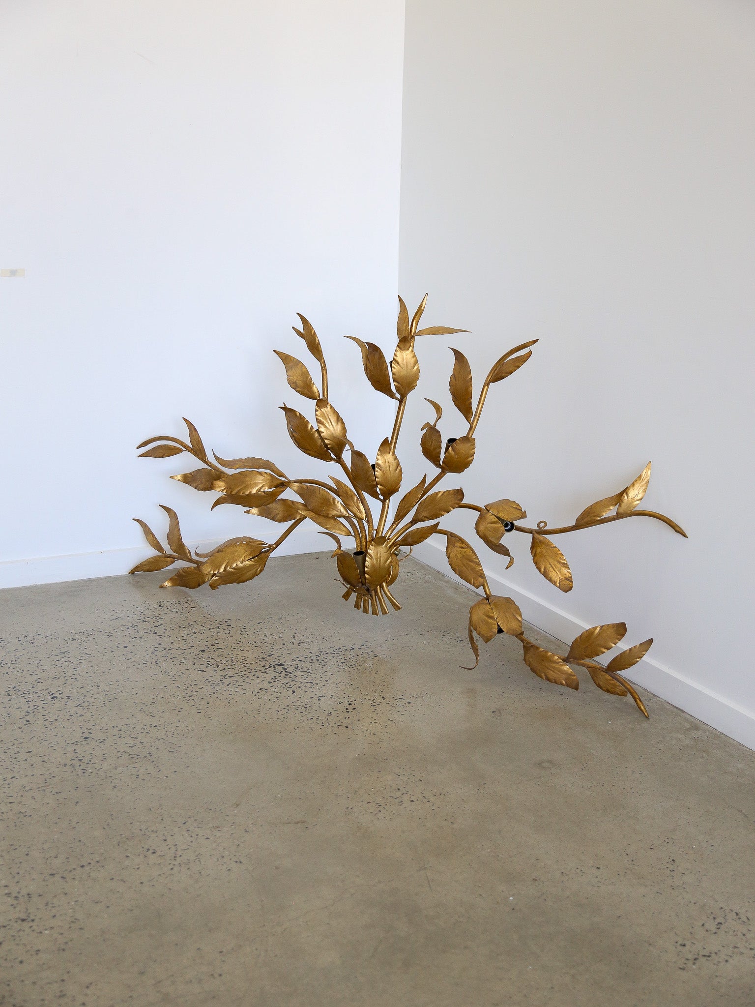 This sculptural wall light embodies Italian vintage design, crafted in gilt metal and arranged as an organic spray of leaves and stems. Featuring nine bulbs, it creates both dramatic illumination and decorative presence, ideal for feature walls in refined interiors.