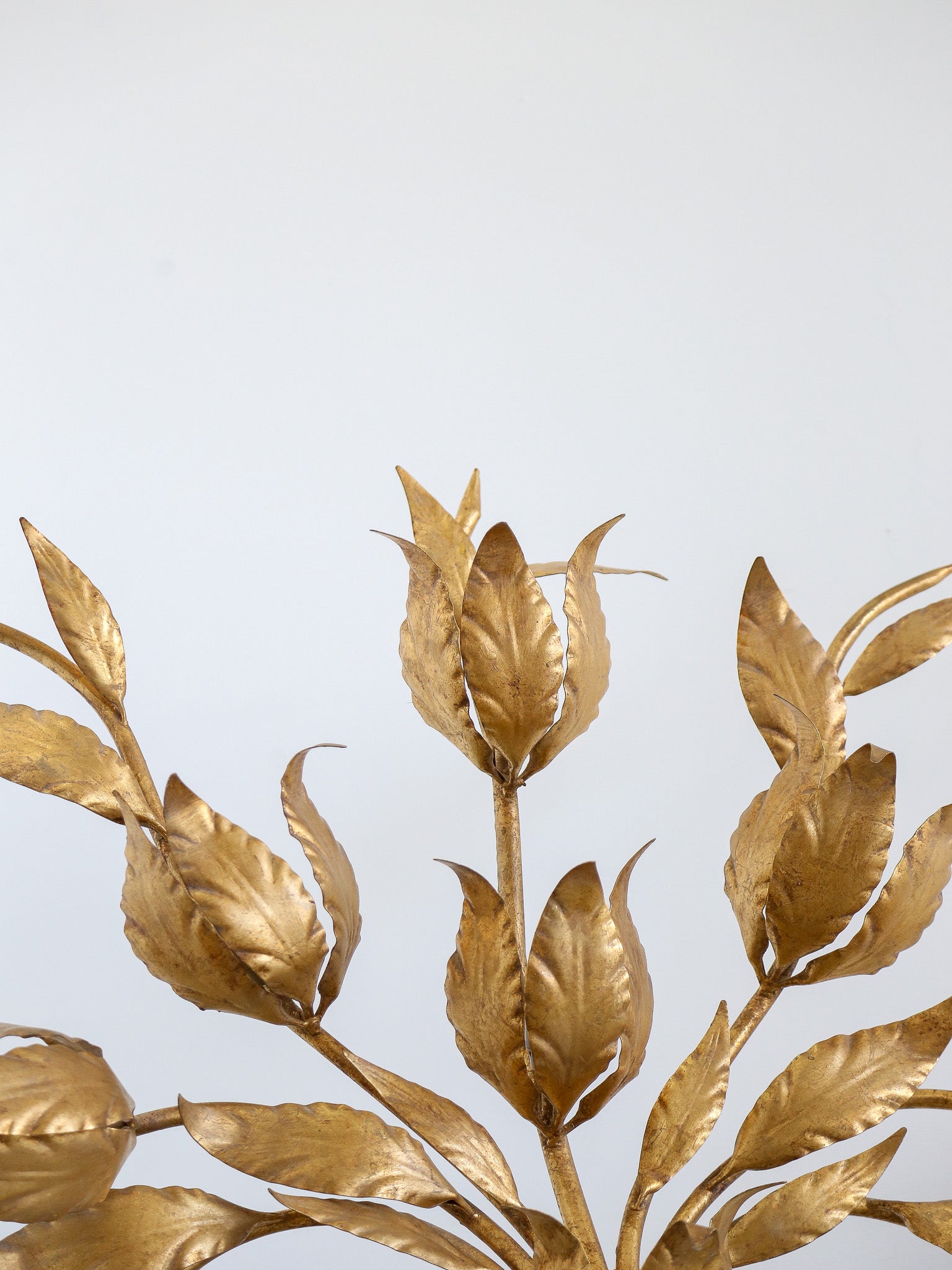 The textured leaves showcase artisanal workmanship, with detailed veining and sculpted edges. The original gilt finish has developed a soft patina over time, adding depth and authenticity to the piece.