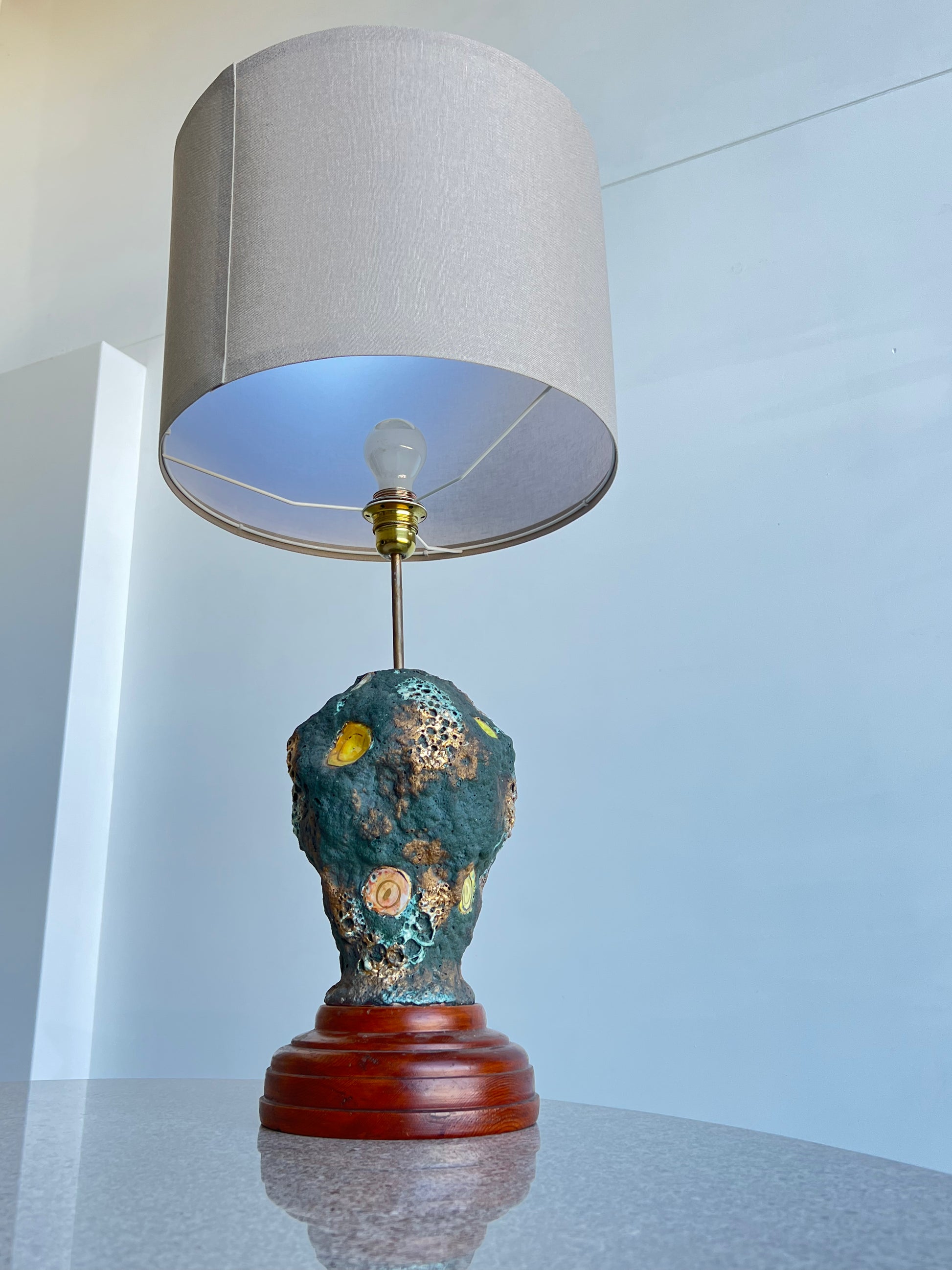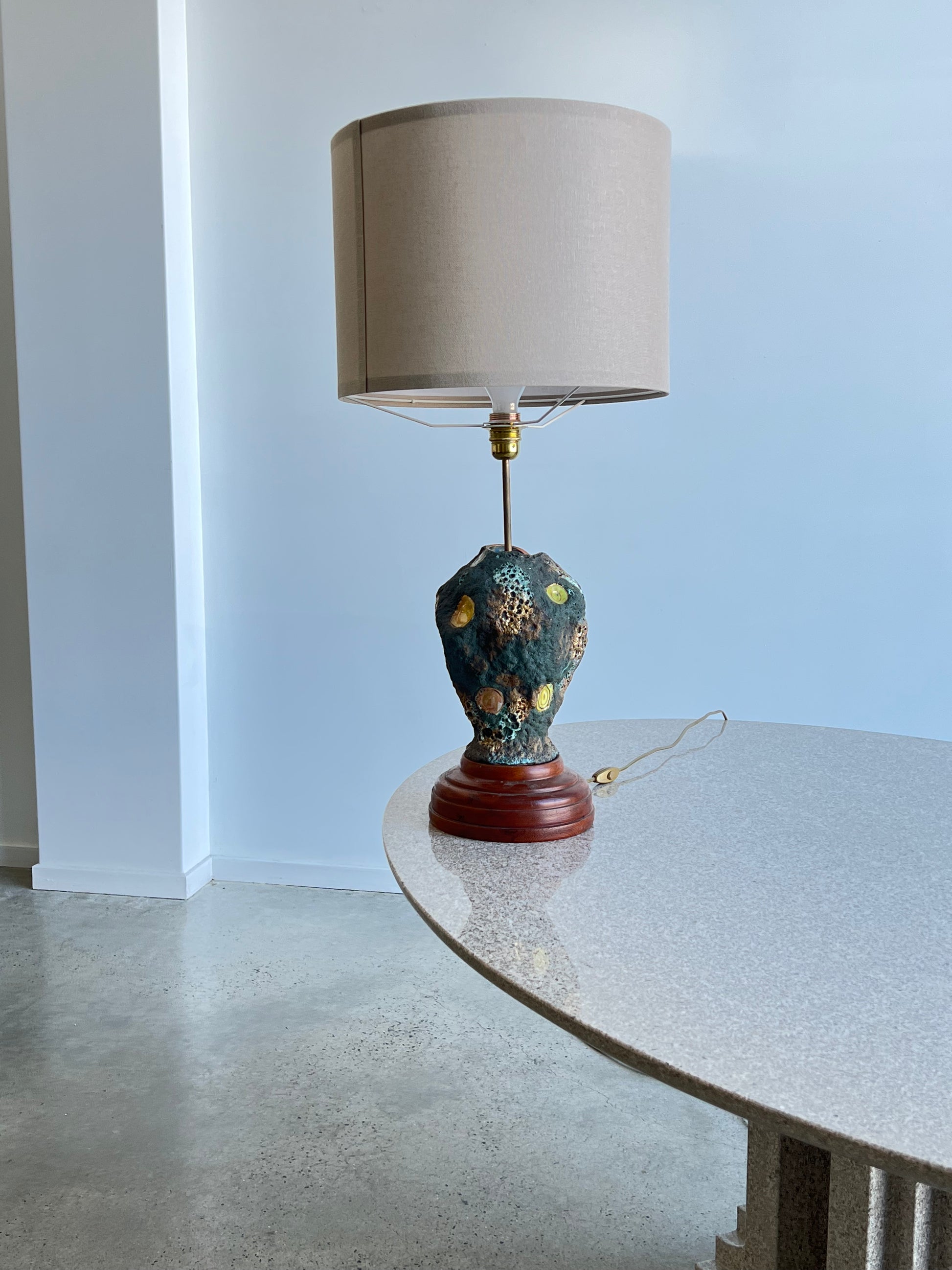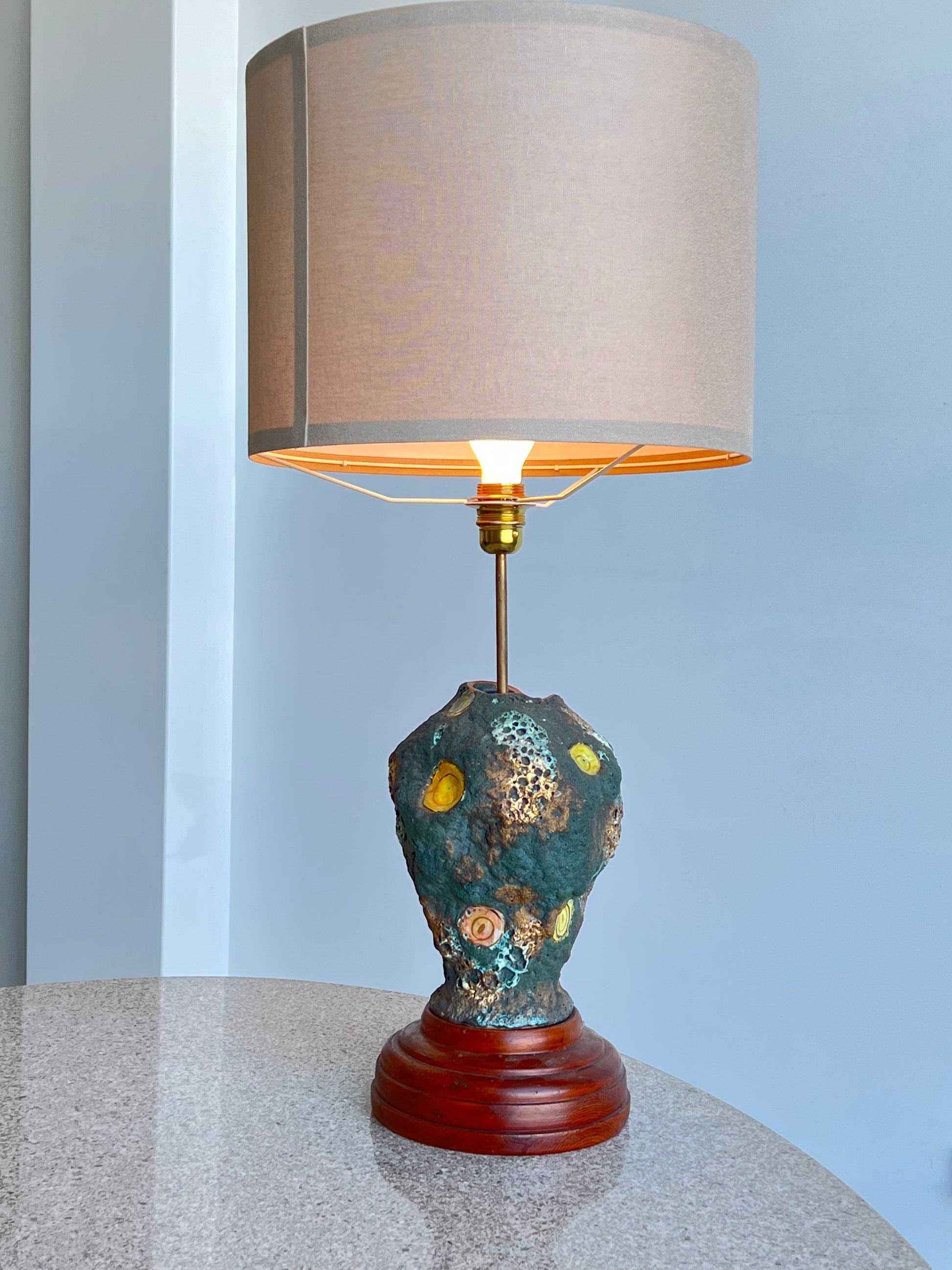 This Italian table lamp by Italo Casini from the 1950s features a striking lava glaze ceramic body with bold volcanic textures and colorful inclusions. Mounted on a dark wood base with a brass stem, it balances sculptural artistry with functionality. The replaced cream fabric shade softens the lamp’s dramatic form, casting a warm and inviting glow.