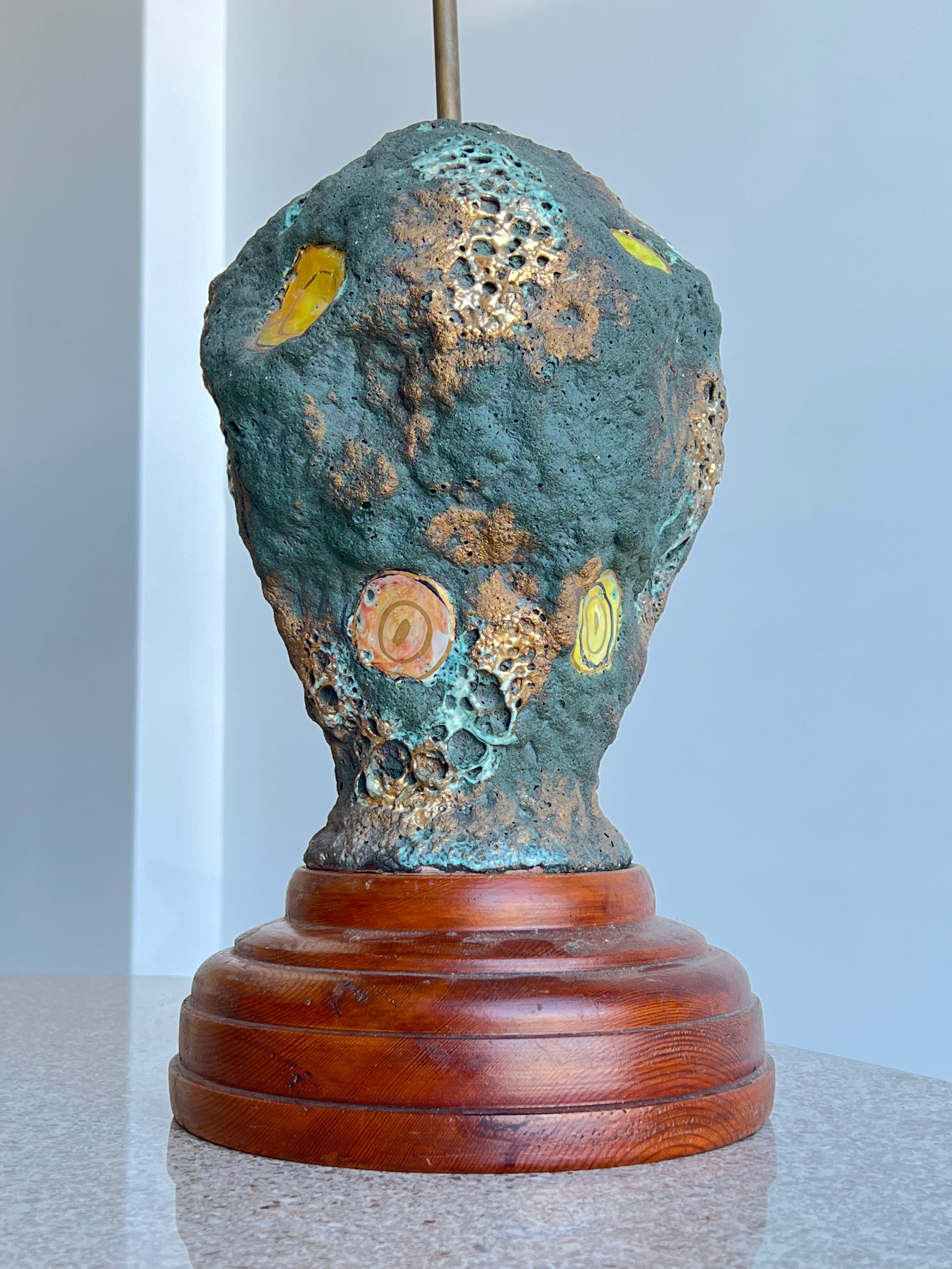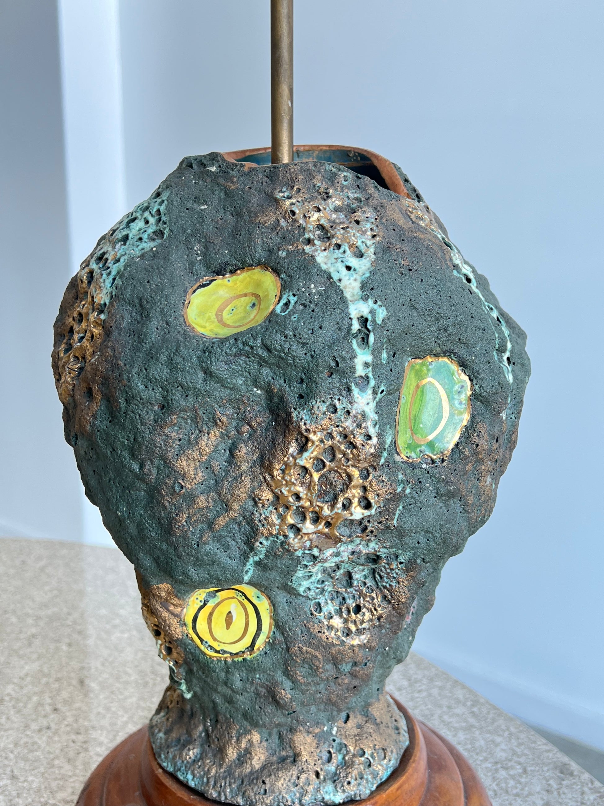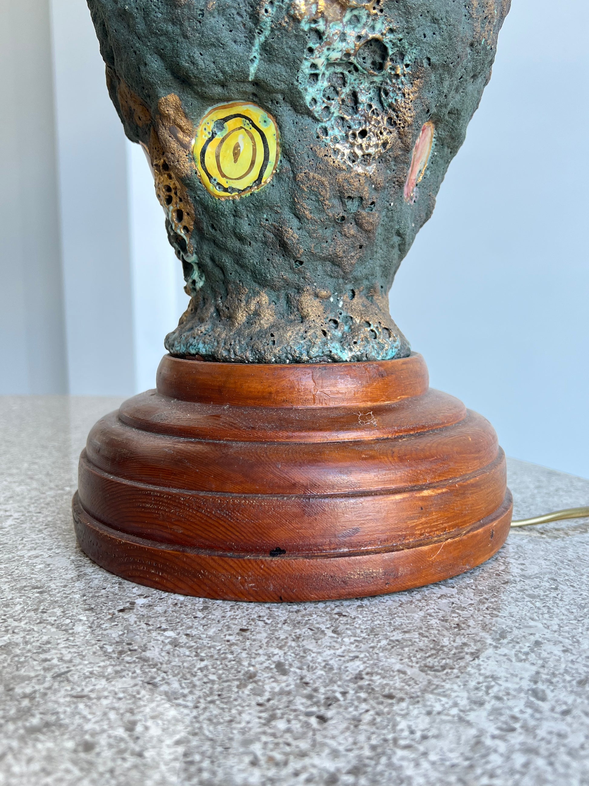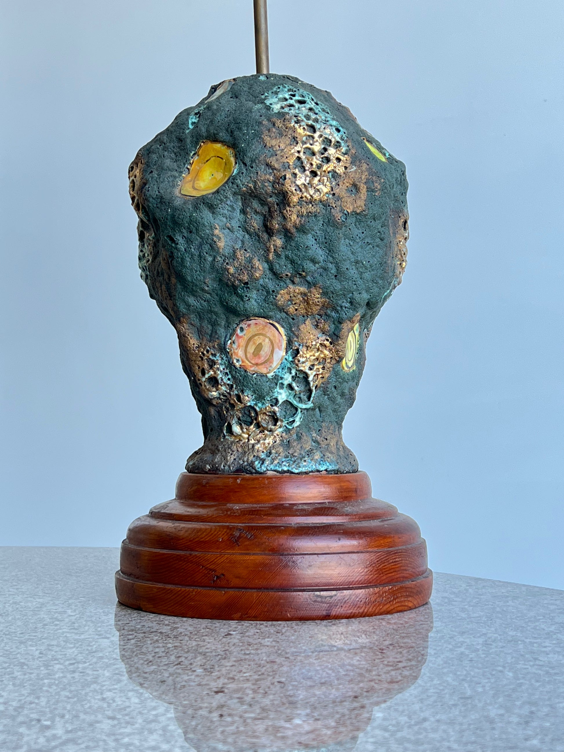 This Italian table lamp by Italo Casini from the 1950s features a striking lava glaze ceramic body with bold volcanic textures and colorful inclusions. Mounted on a dark wood base with a brass stem, it balances sculptural artistry with functionality. The replaced cream fabric shade softens the lamp’s dramatic form, casting a warm and inviting glow.