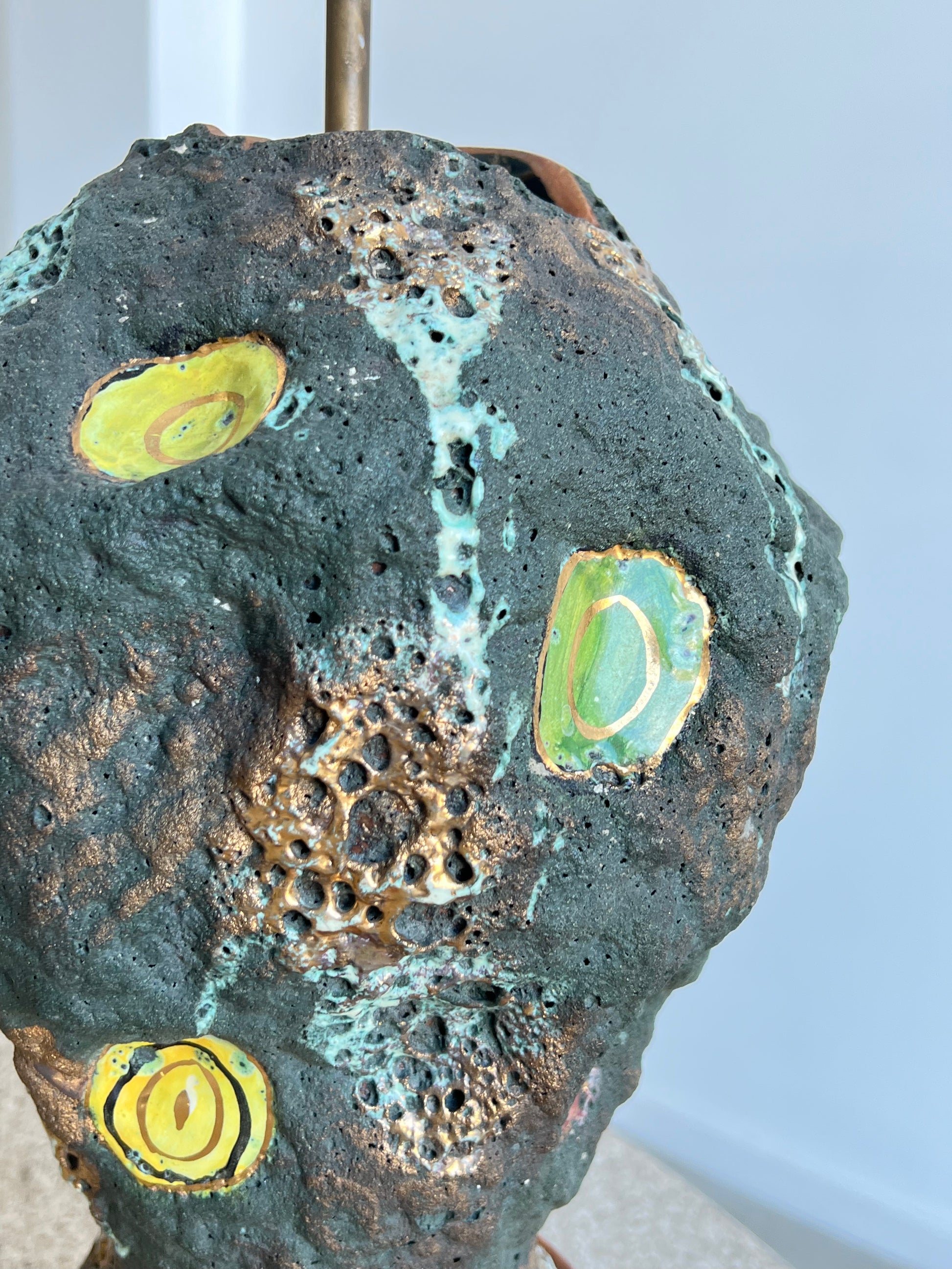 The heavily textured surface highlights Casini’s experimental approach to ceramics, where molten glazes create organic craters and vibrant patches of color. Each angle reveals new visual depth, making this lamp as much a sculptural statement as a lighting piece.