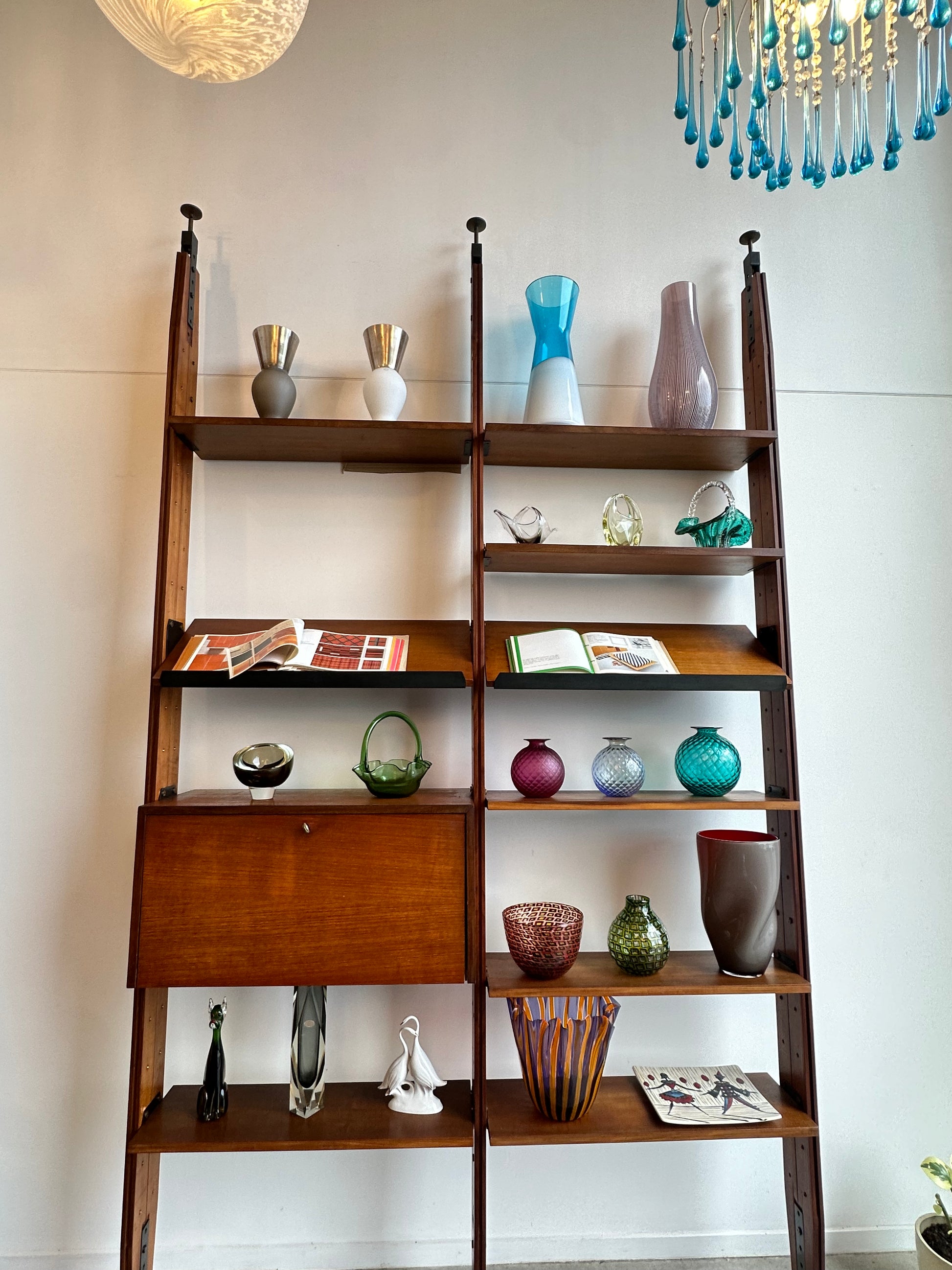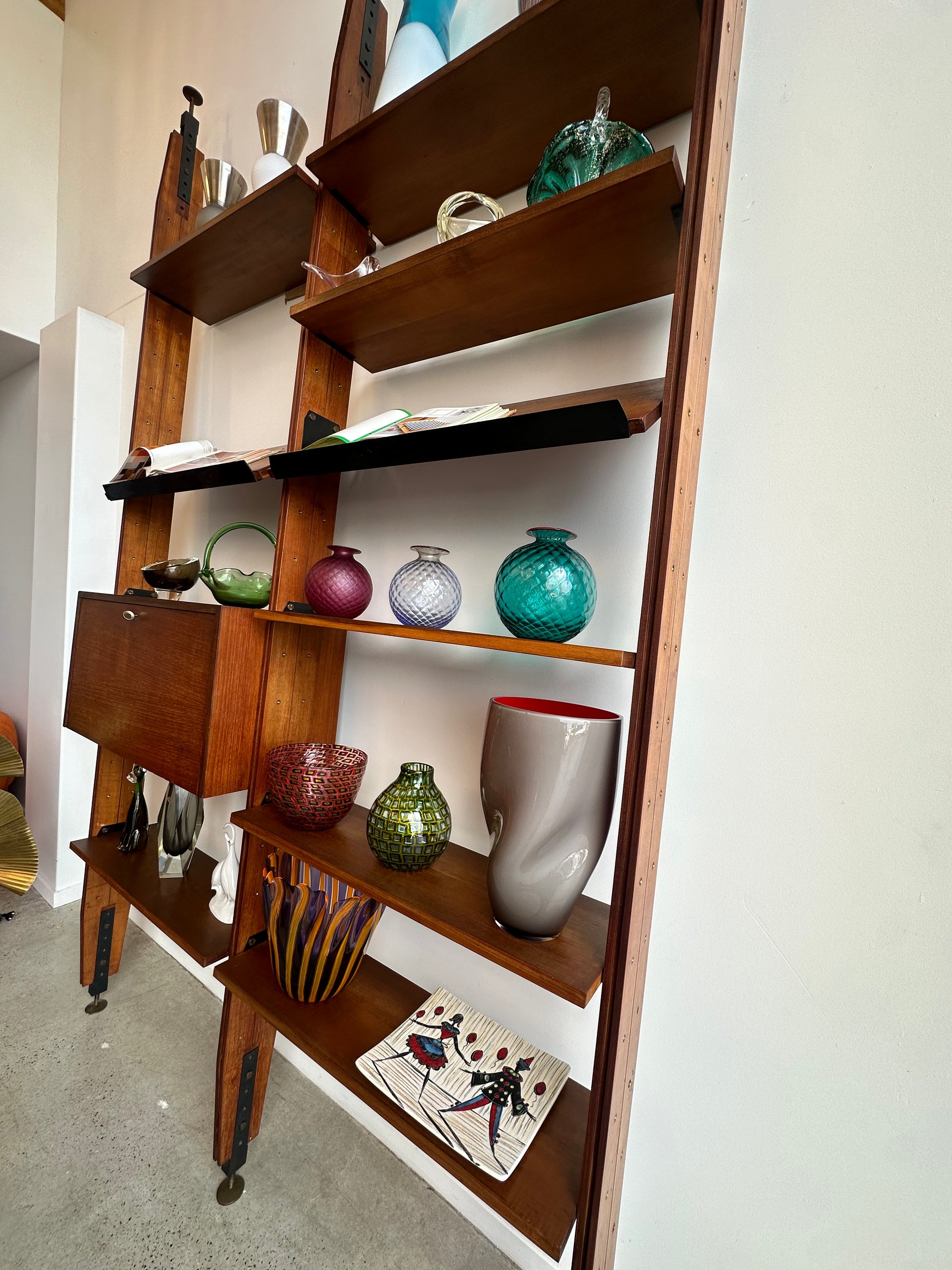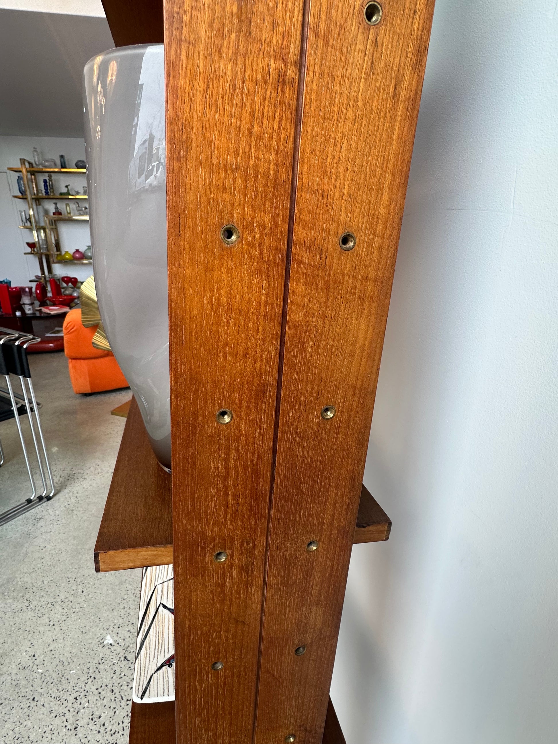The clean vertical lines and customisable shelving reflect the era’s focus on proportion, material honesty, and modular flexibility. Brass accents highlight the craftsmanship while the walnut wood adds warmth and elegance. This balance of function and sculptural form is typical of Spadolini’s design philosophy.