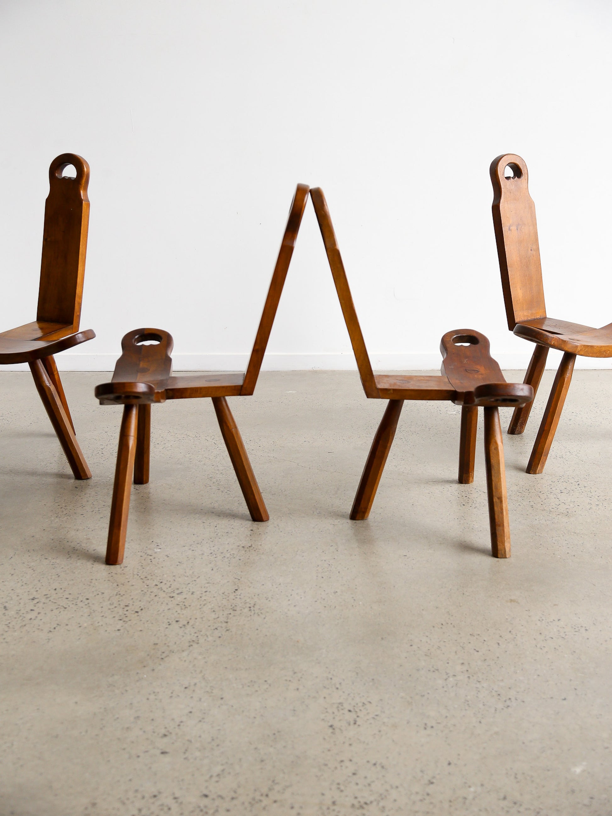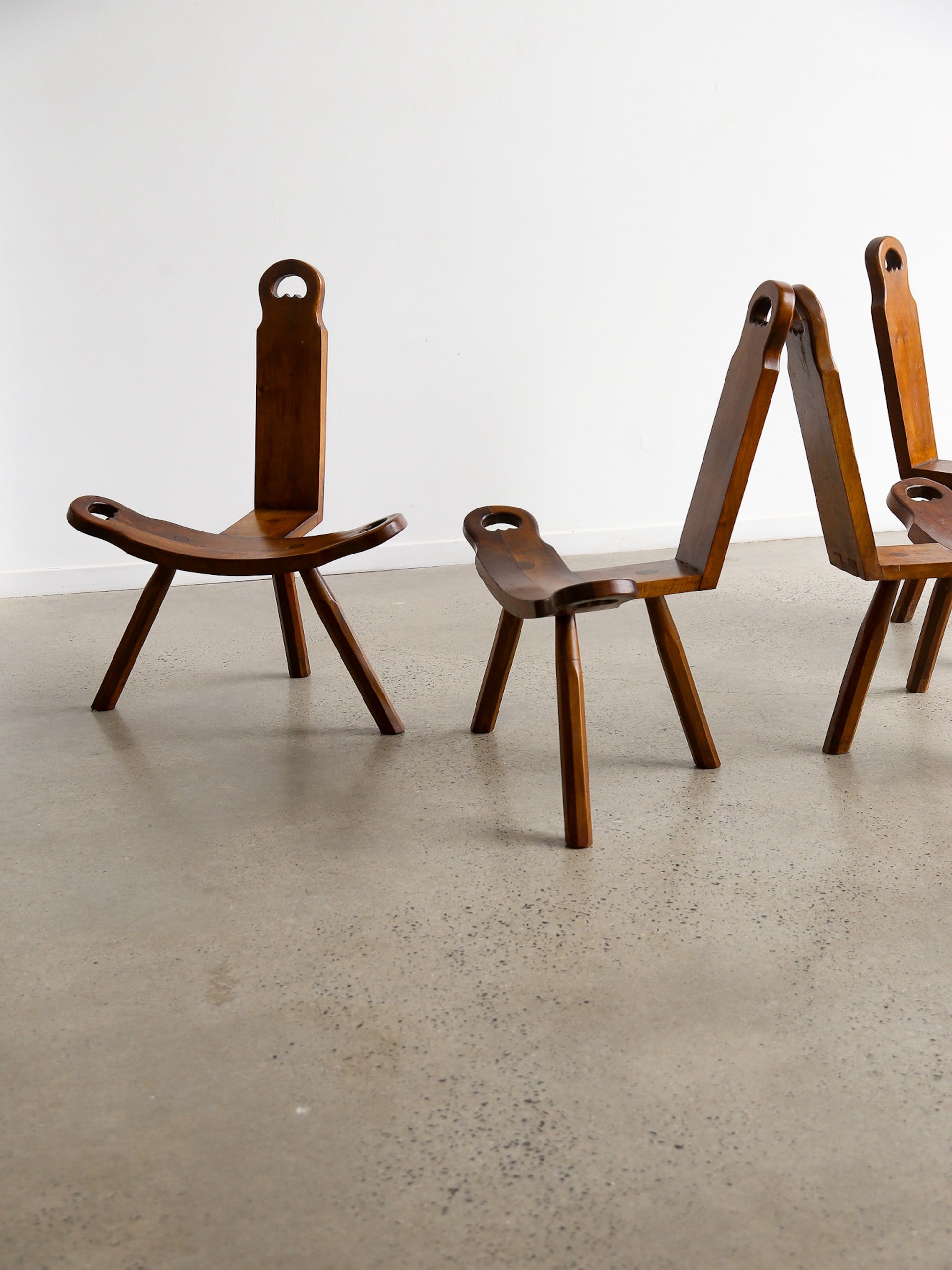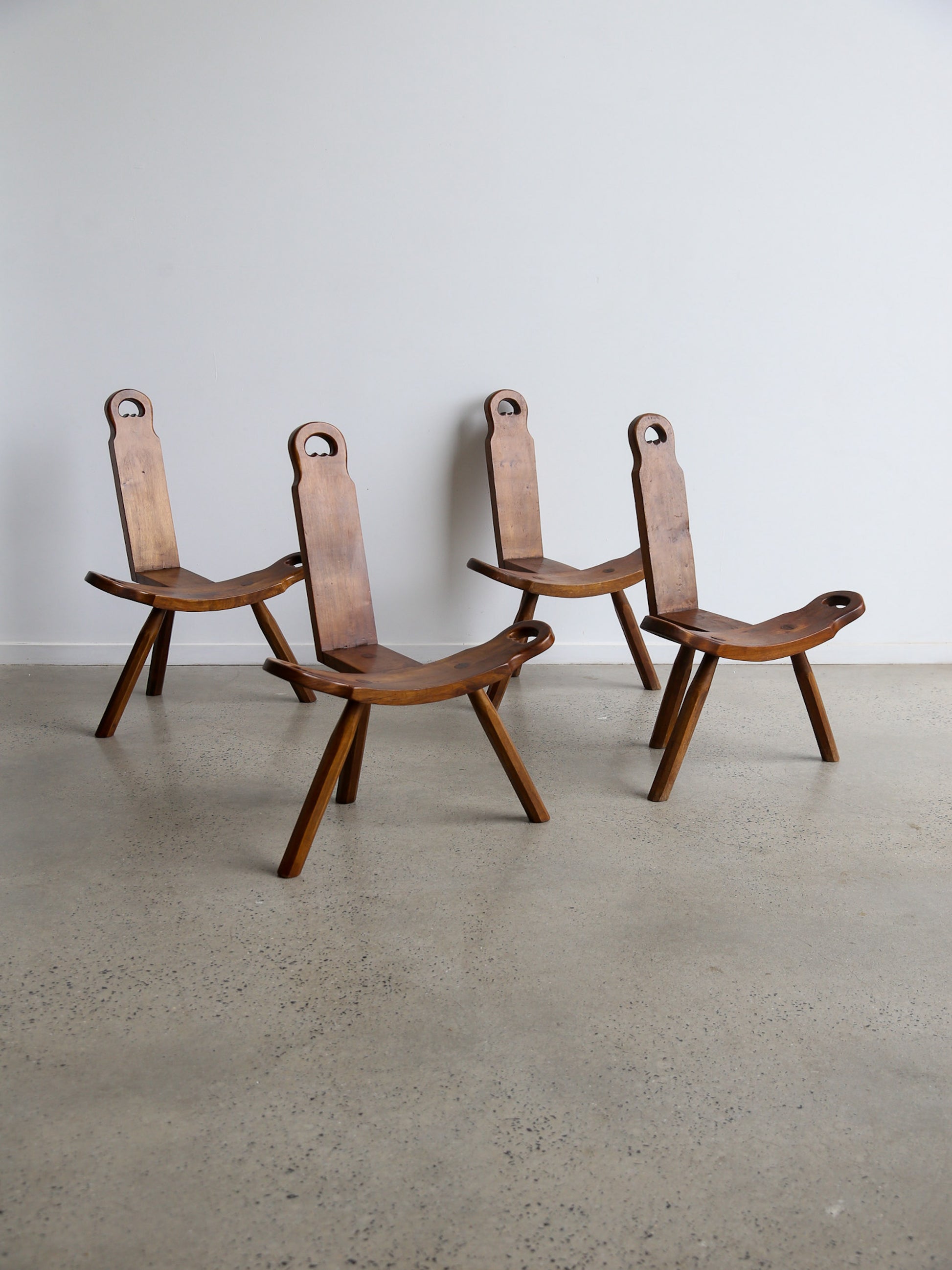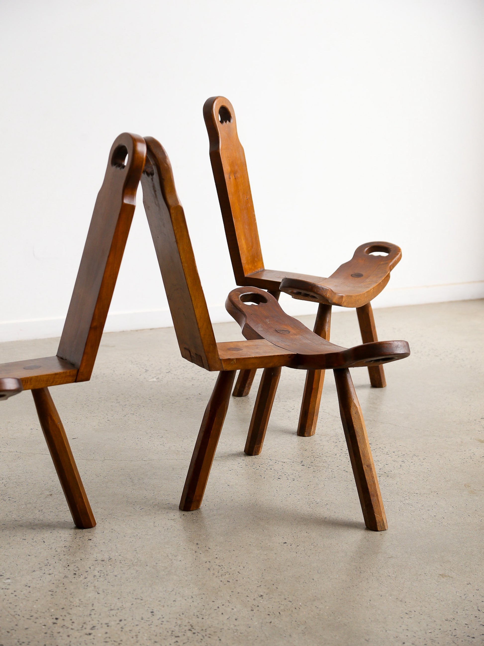 These Brutalist Spanish tripod chairs, handcrafted in the 1950s, embody the expressive and raw aesthetic of mid-century modern design. Constructed entirely from solid wood, the chairs showcase a striking sculptural form with tall, narrow backs, subtly curved seats, and tripod-style bases. Their minimalist yet bold geometry makes them unique statement pieces in any interior.