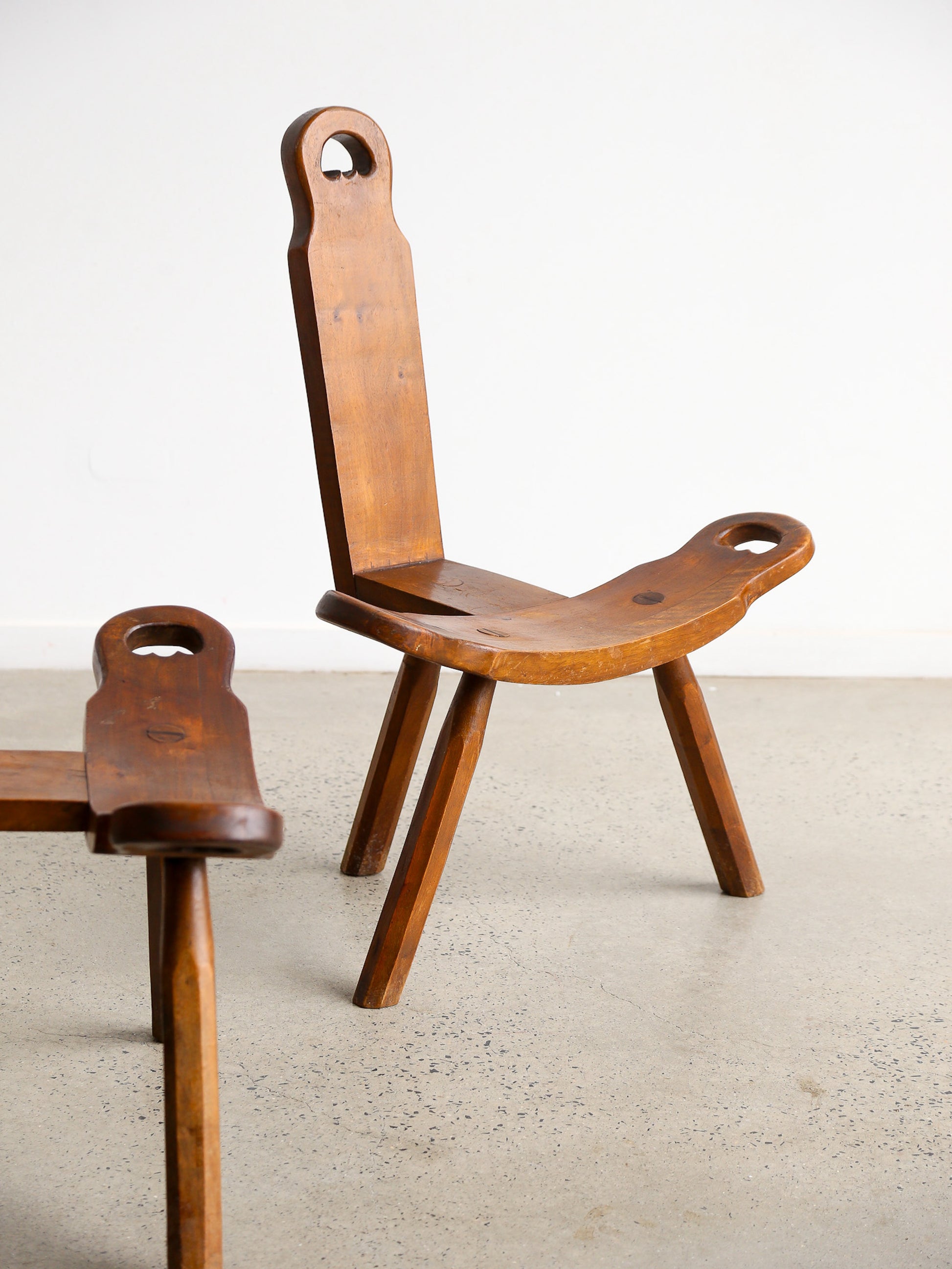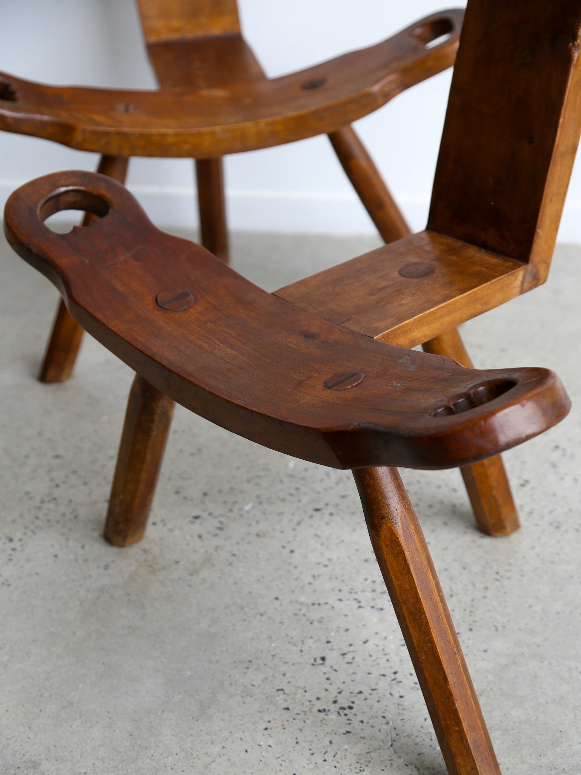 The chairs’ organic curves and cut-out detailing on the backrest reflect both functional ingenuity and decorative craftsmanship. Historically, this type of tripod form is associated with birthing chairs, lending these pieces symbolic depth as well as design interest. Their Brutalist character highlights the honesty of material and structure, combining rustic strength with mid-century sophistication.