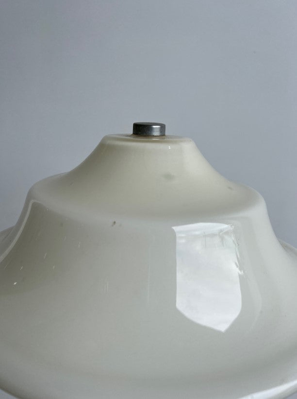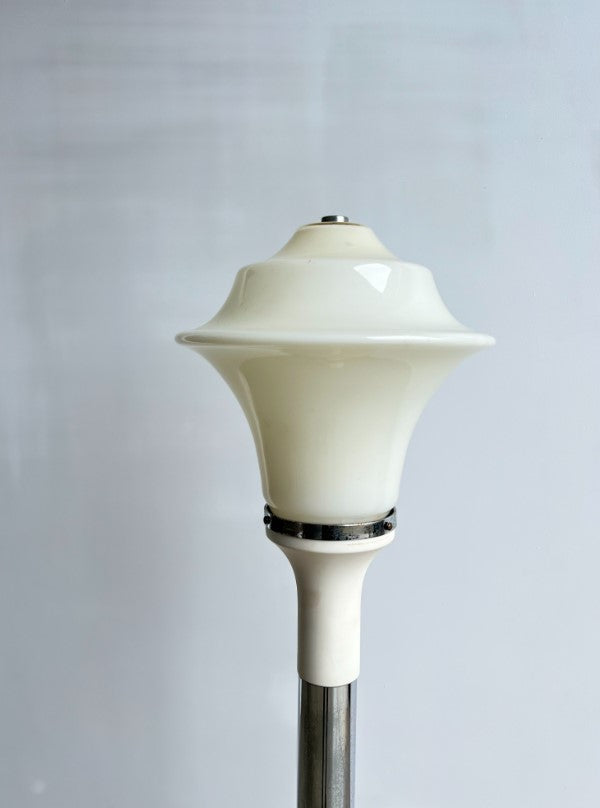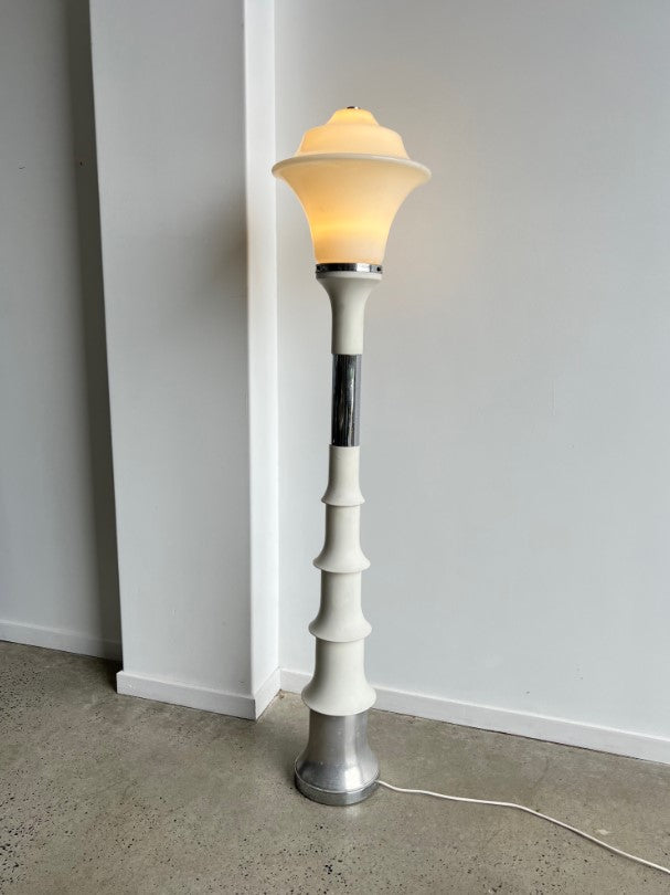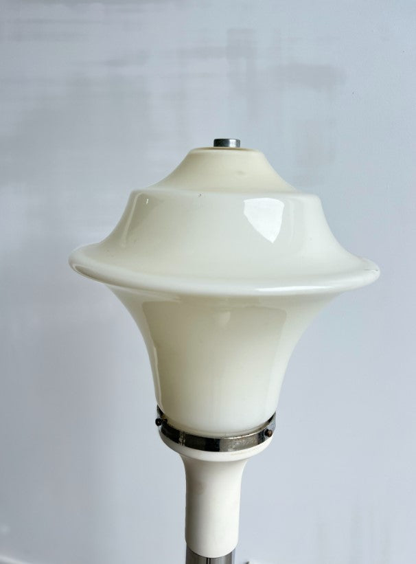 The lamp’s tall, tiered silhouette is complemented by a polished chrome column and base. The distinctive opaline glass diffuser casts a warm atmospheric glow, highlighting the craftsmanship of Italian glassmaking. Both functional and sculptural, this piece adds elegance and architectural presence to any setting.