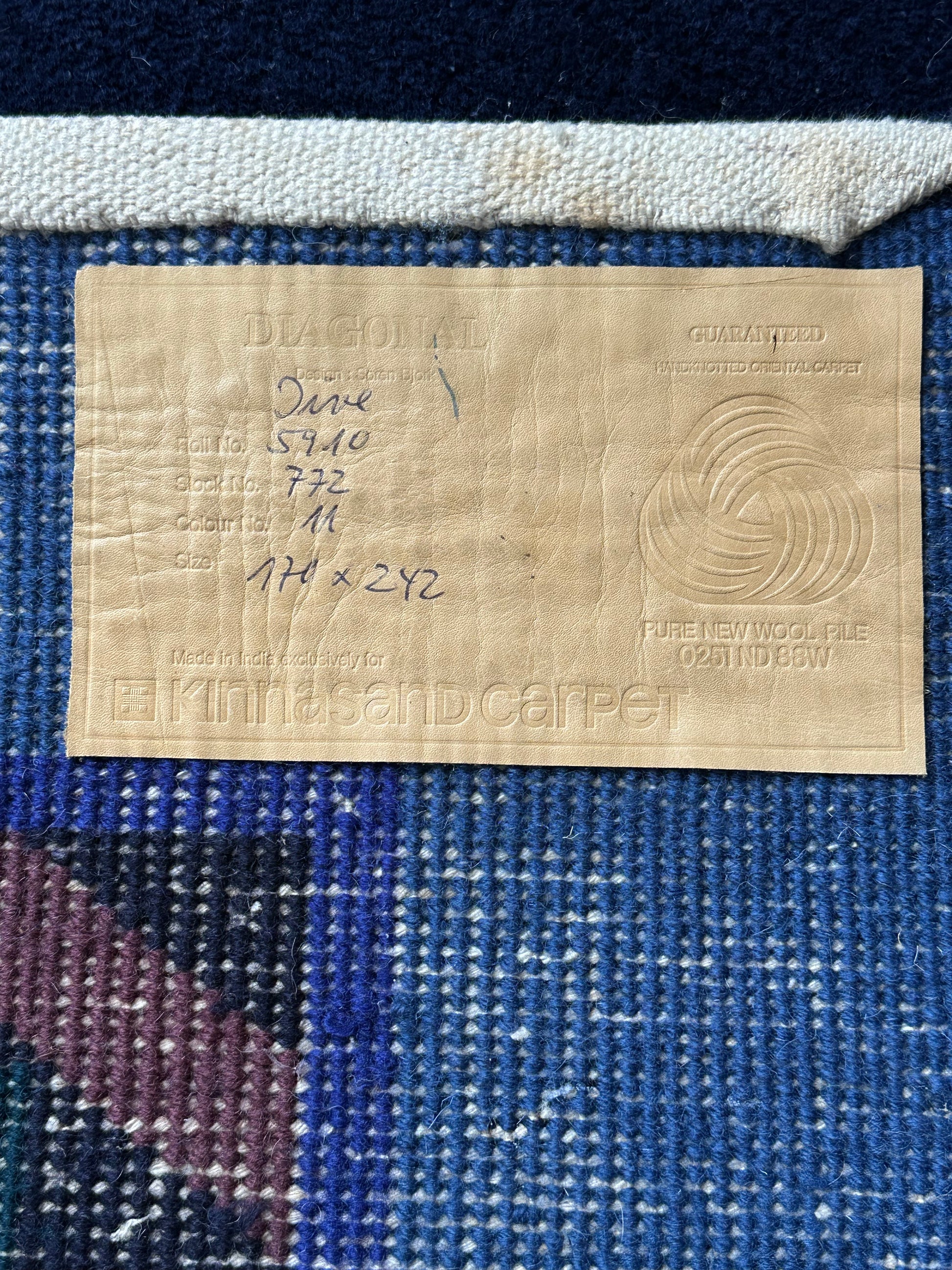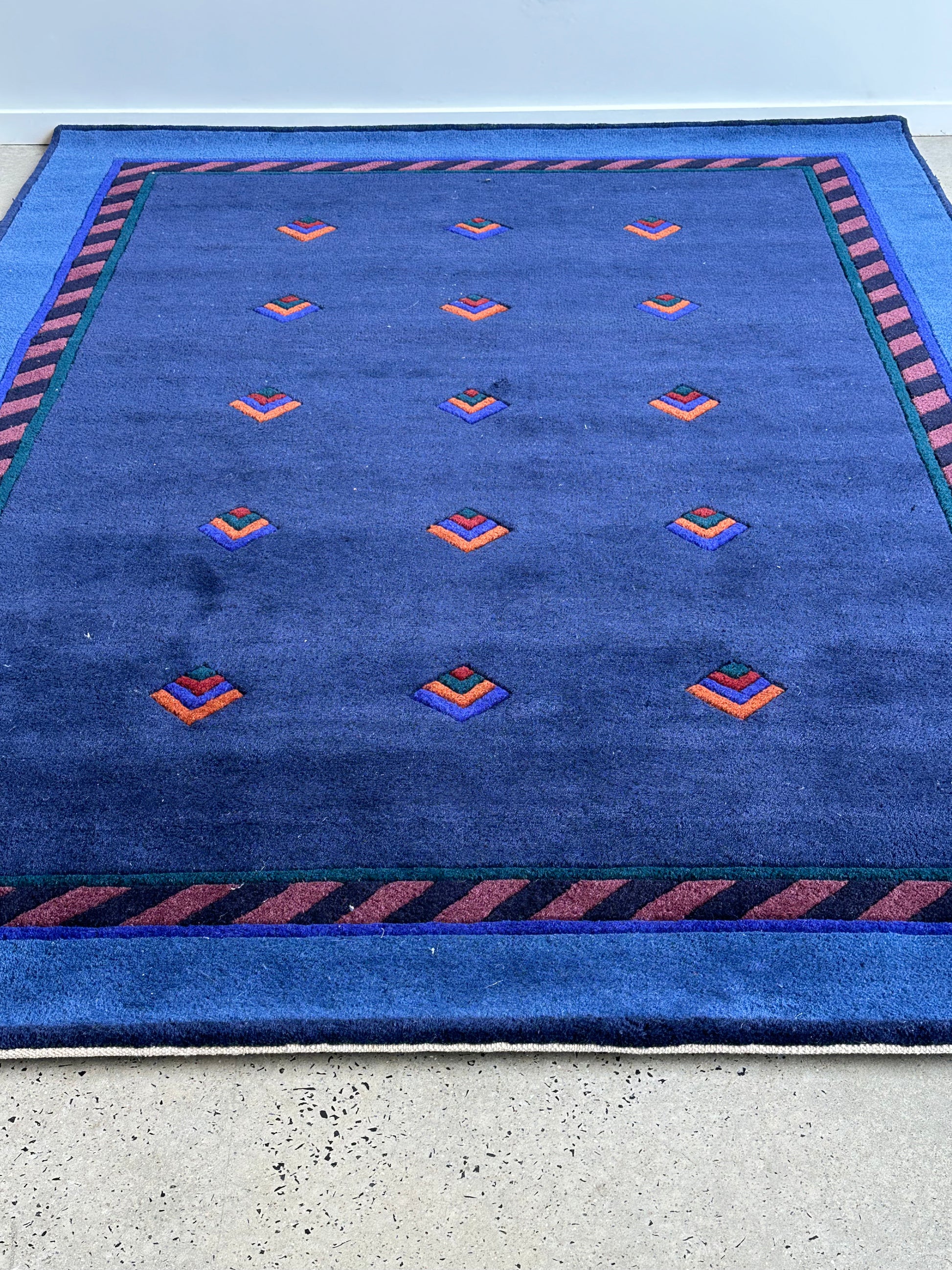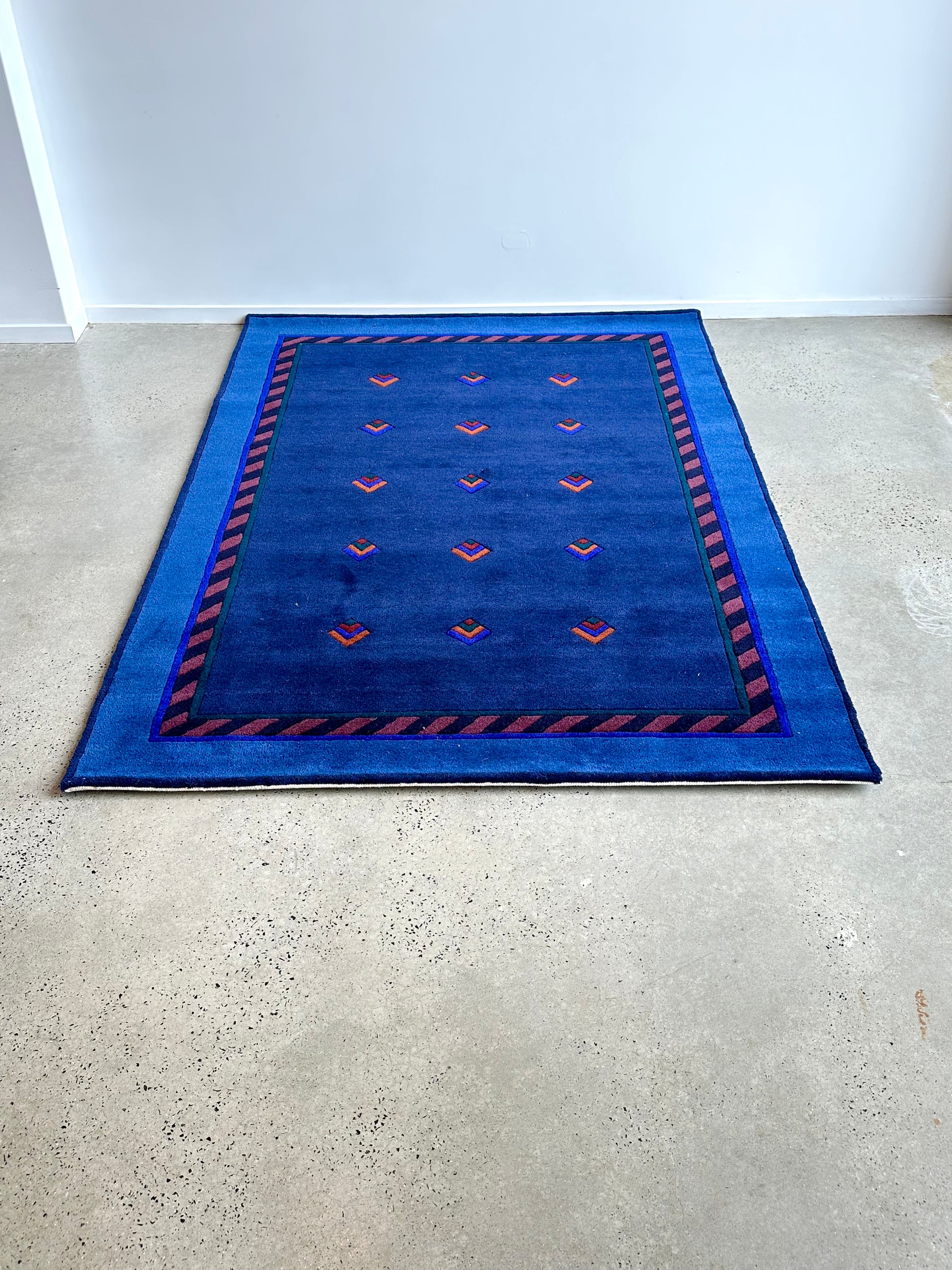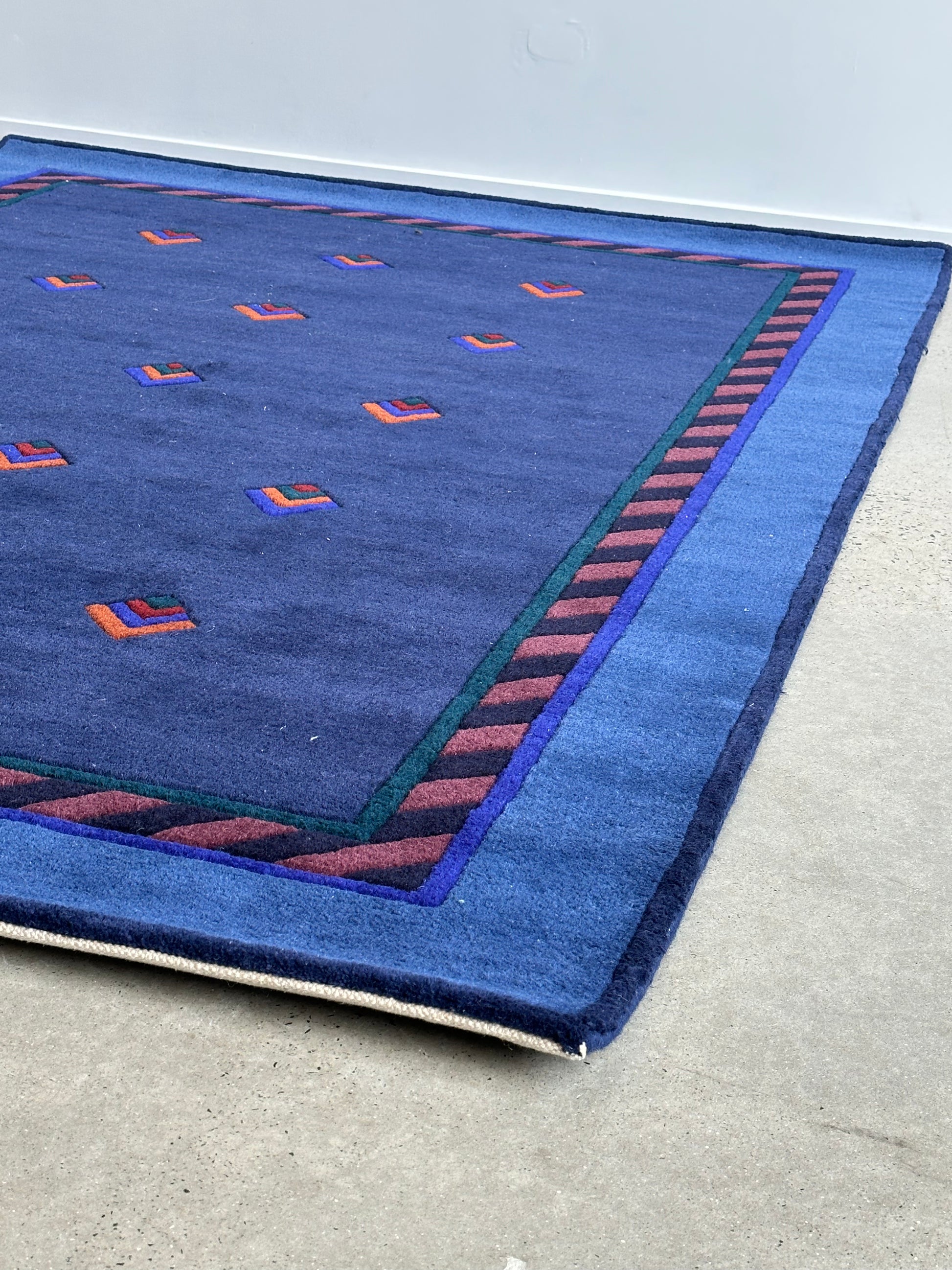 This modern wool rug designed by Catharina Dramborg for Kinnasand in the 1990s is a refined example of Scandinavian postmodern textile design. Crafted from pure wool, the rug combines simplicity and depth through its geometric composition and rich blue palette accented with subtle red and violet tones.