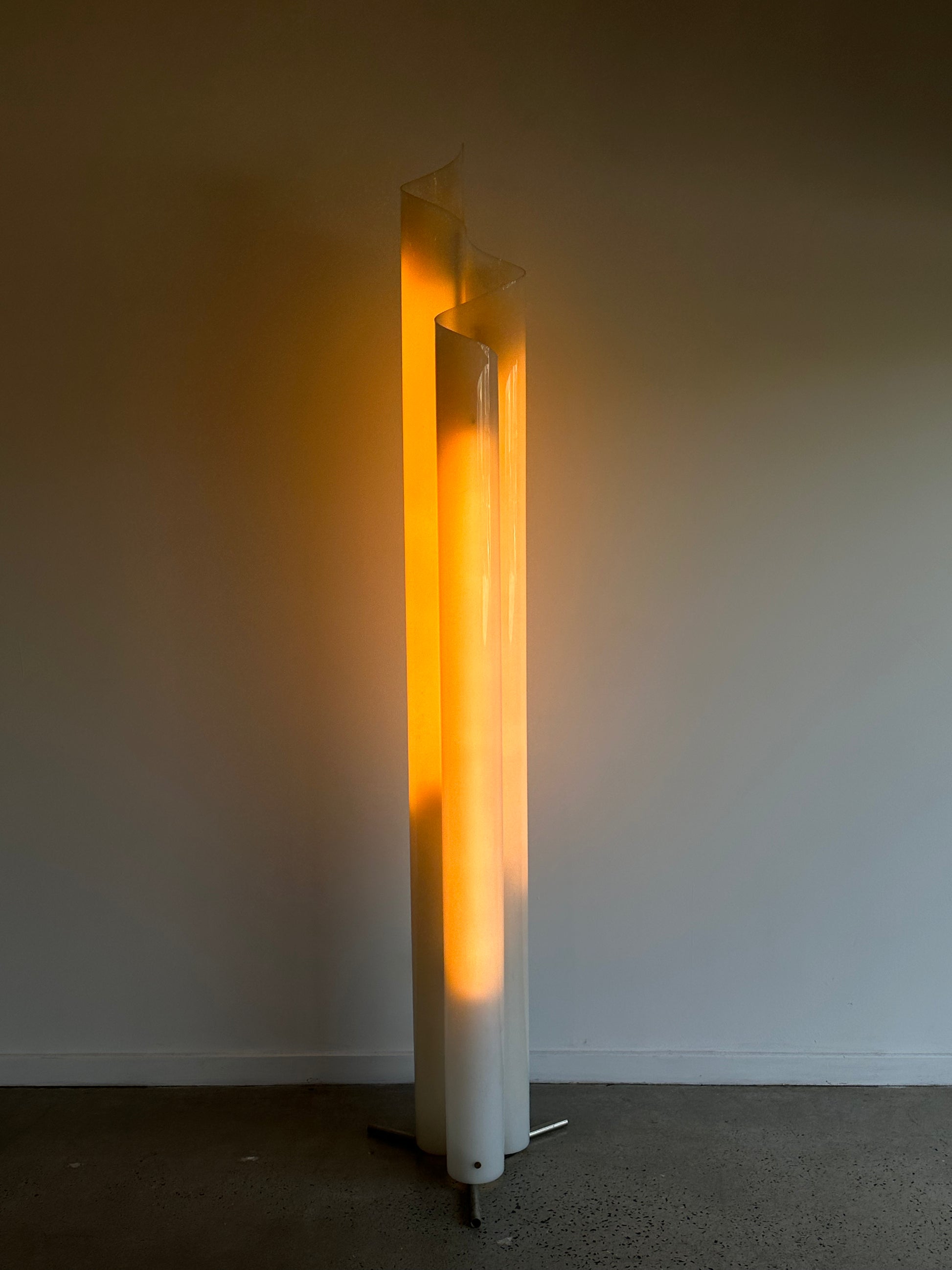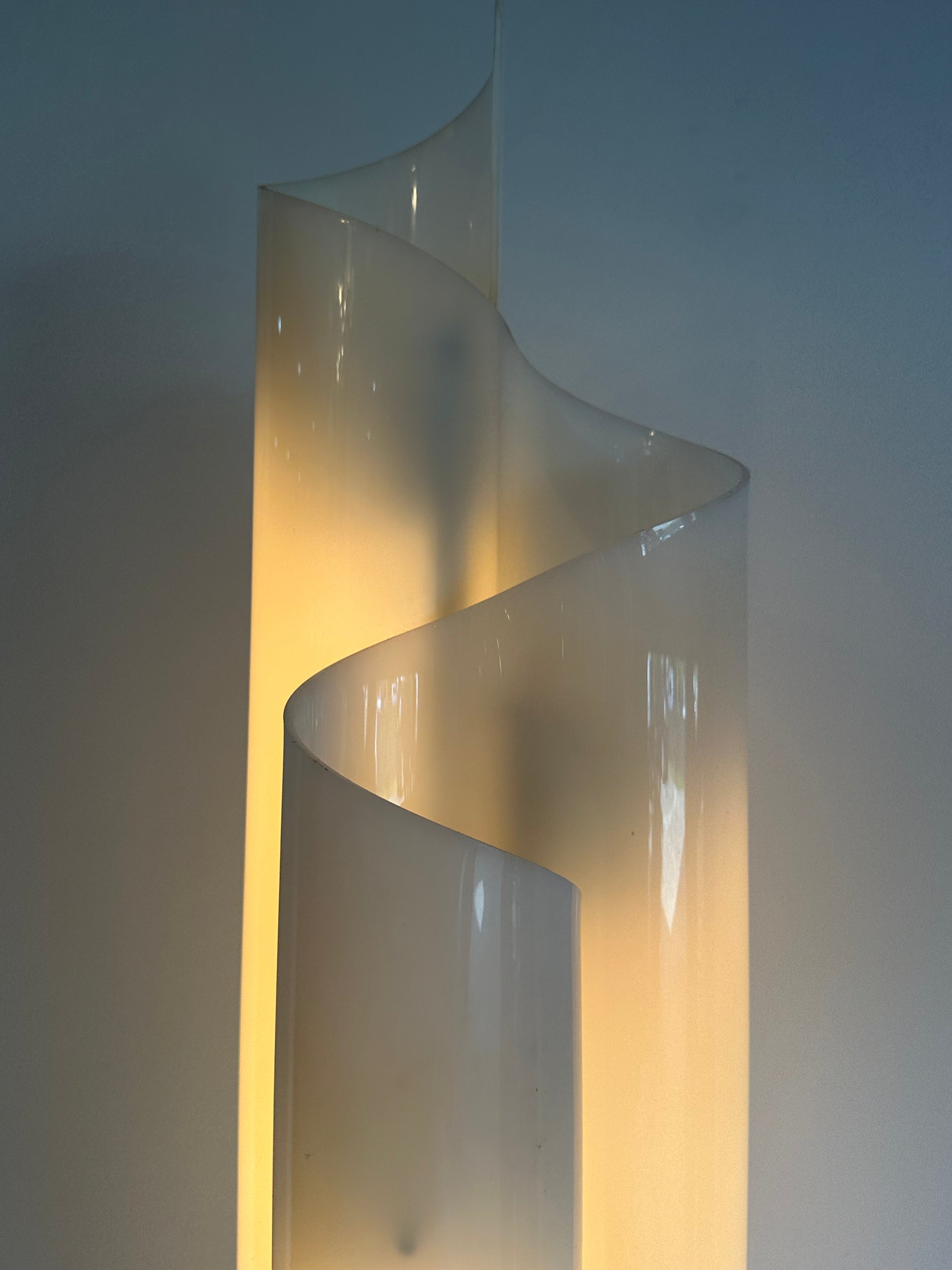 Crafted from curved white plexiglass, the Chimera lamp rises in a fluid, wave-like form, diffusing light with a warm, atmospheric glow. The biomorphic silhouette exemplifies Magistretti’s exploration of organic and architectural forms, making the lamp as much a sculptural artwork as a functional light.