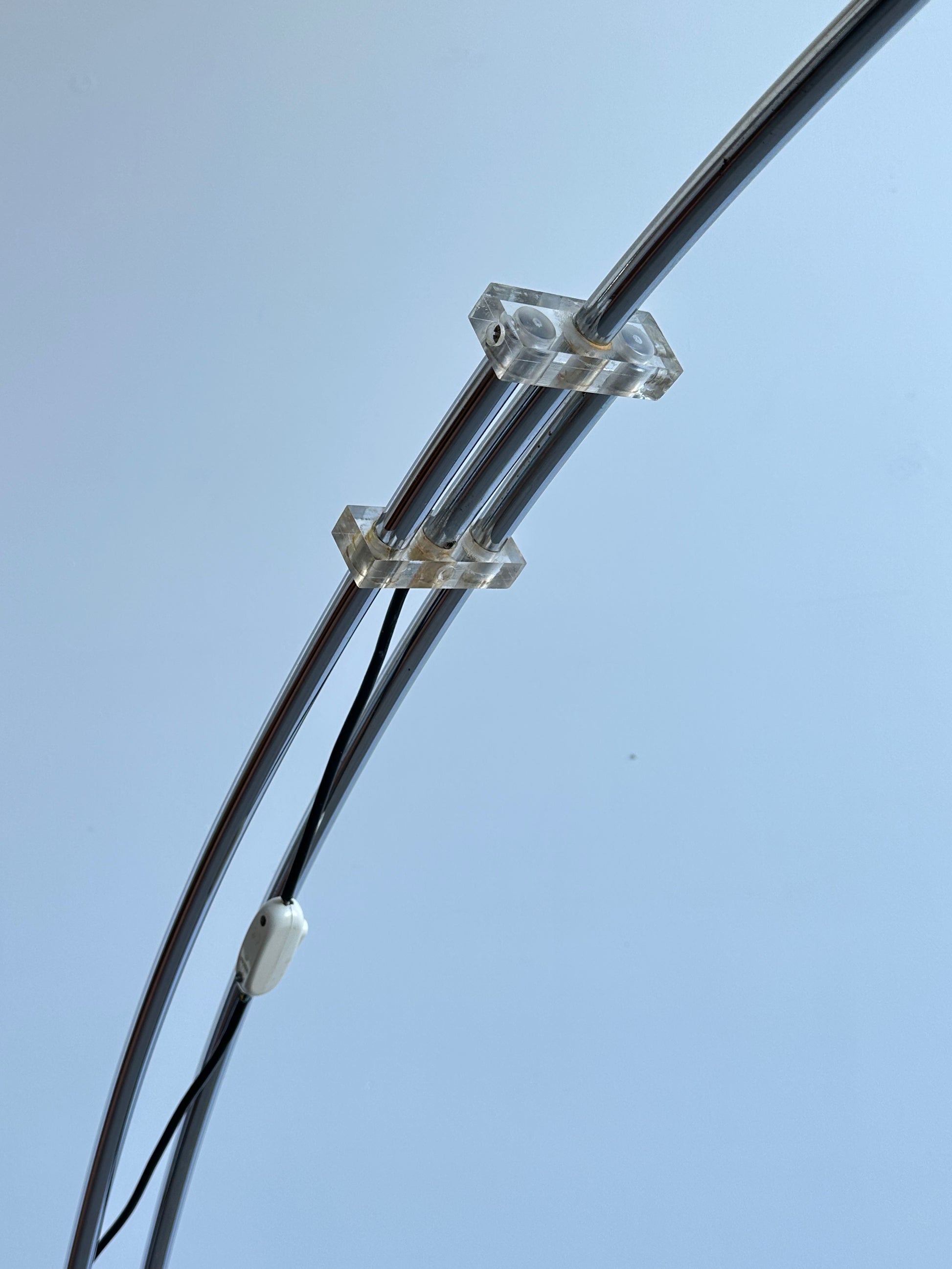 This sculptural arc floor lamp by Goffredo Reggiani is a striking example of Italian mid-century modern design. Produced in the 1970s, it combines a refined chrome steel structure with a solid marble base, achieving both elegance and stability.