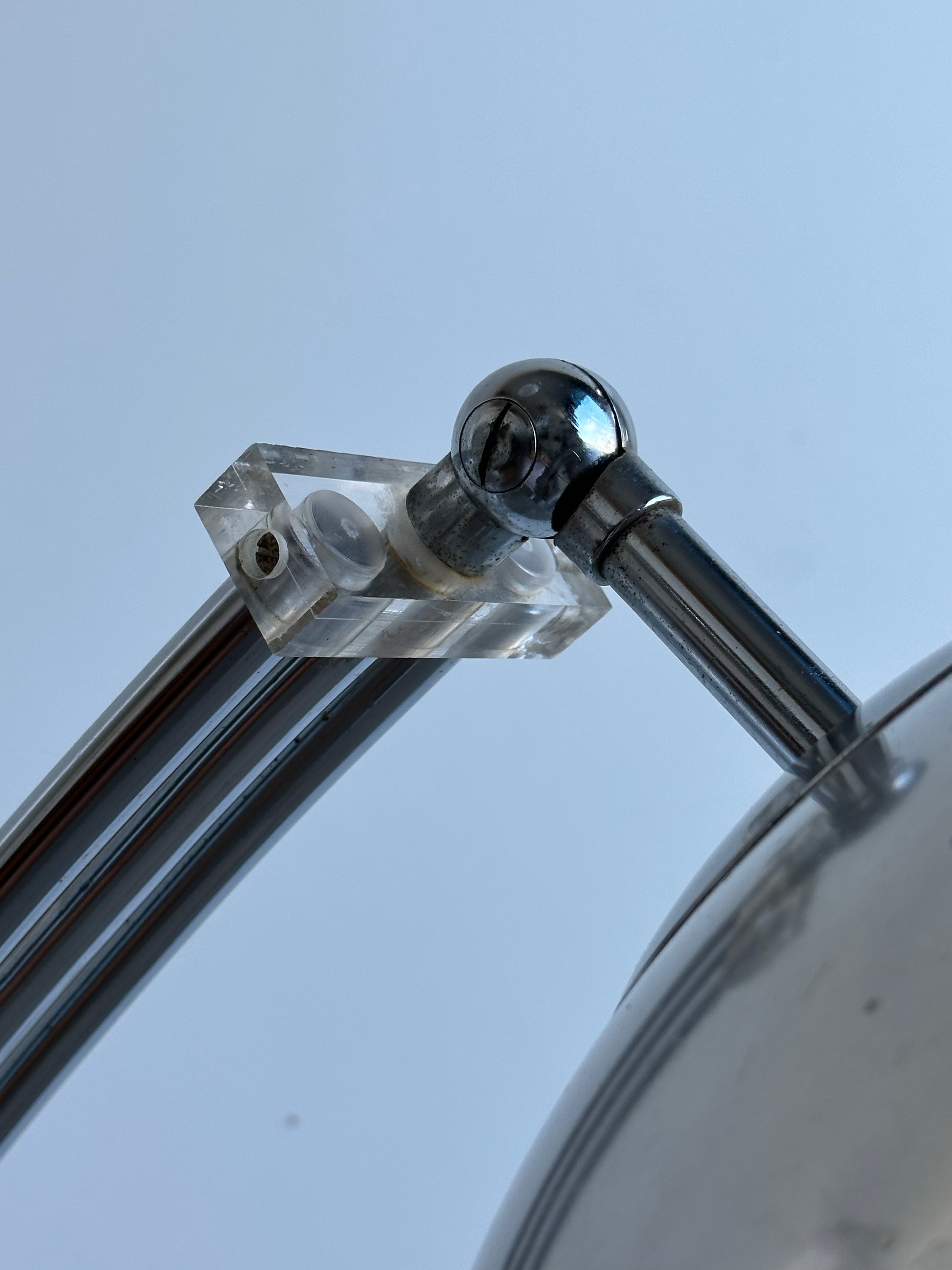 The lamp’s sweeping adjustable arc allows for versatile positioning, while the large chrome dome shade provides a focused yet ambient light. Its geometric balance between the polished marble base and the suspended reflector demonstrates Reggiani’s mastery in creating functional pieces with architectural presence.