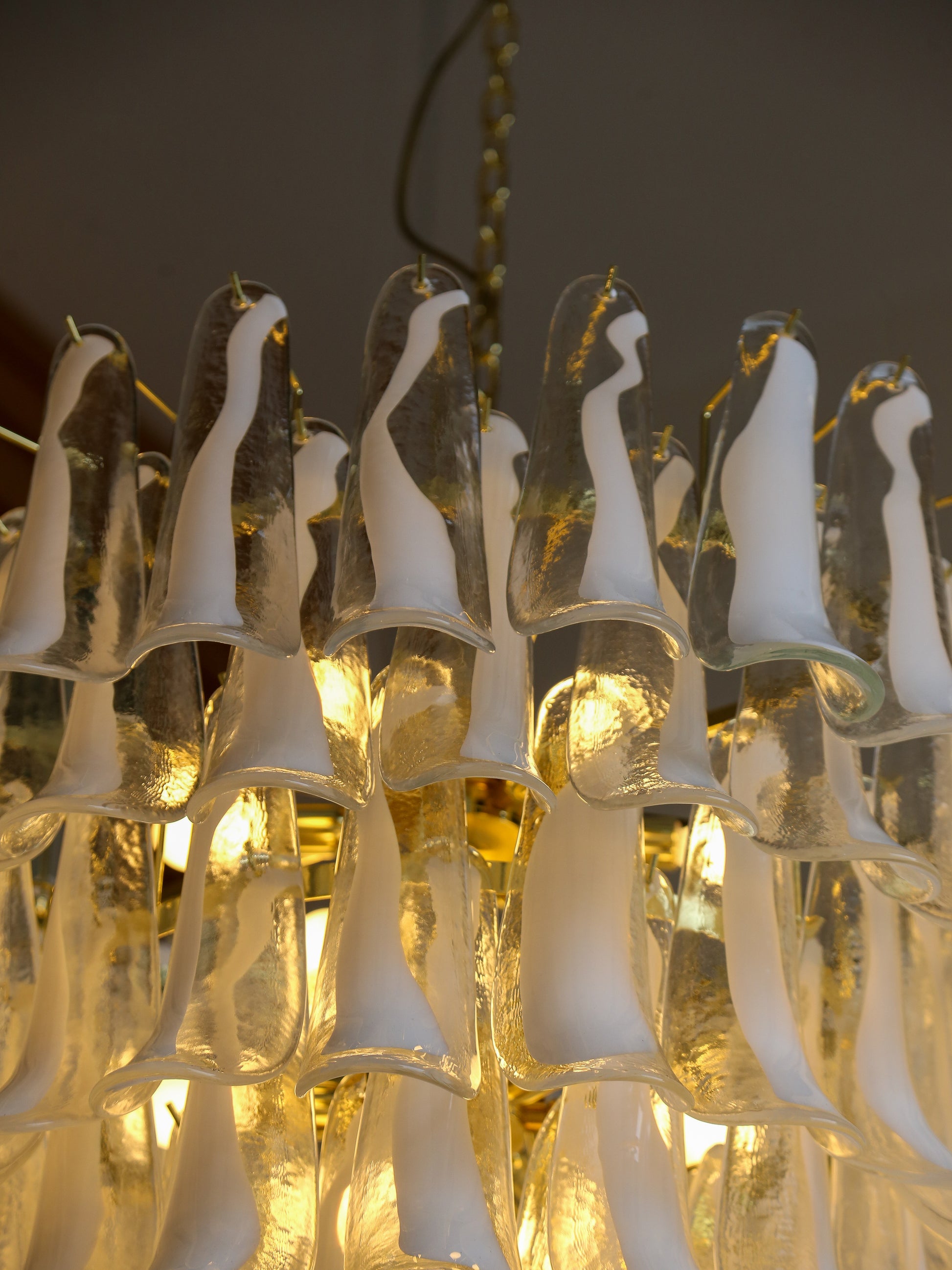 Each white glass saddle is mouth-blown and sculpted by Murano artisans, with subtle texture and fluid curves that capture and reflect the light. The multi-tiered design and gold-coated brass structure give the chandelier a sense of depth, movement, and refinement.