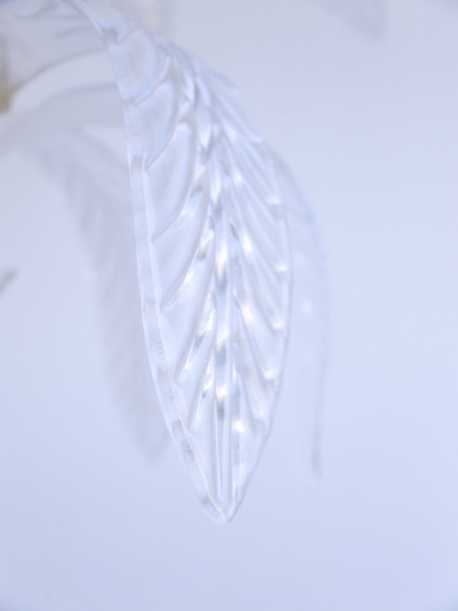 Every element of this lamp has been entirely handcrafted in blown glass by master artisans in Murano. The leaves are individually shaped, textured, and mounted onto a brass frame, creating a remarkable interplay of light and shadow when illuminated. Four lights are discreetly set within the upper section, casting a glowing halo through the translucent glass.