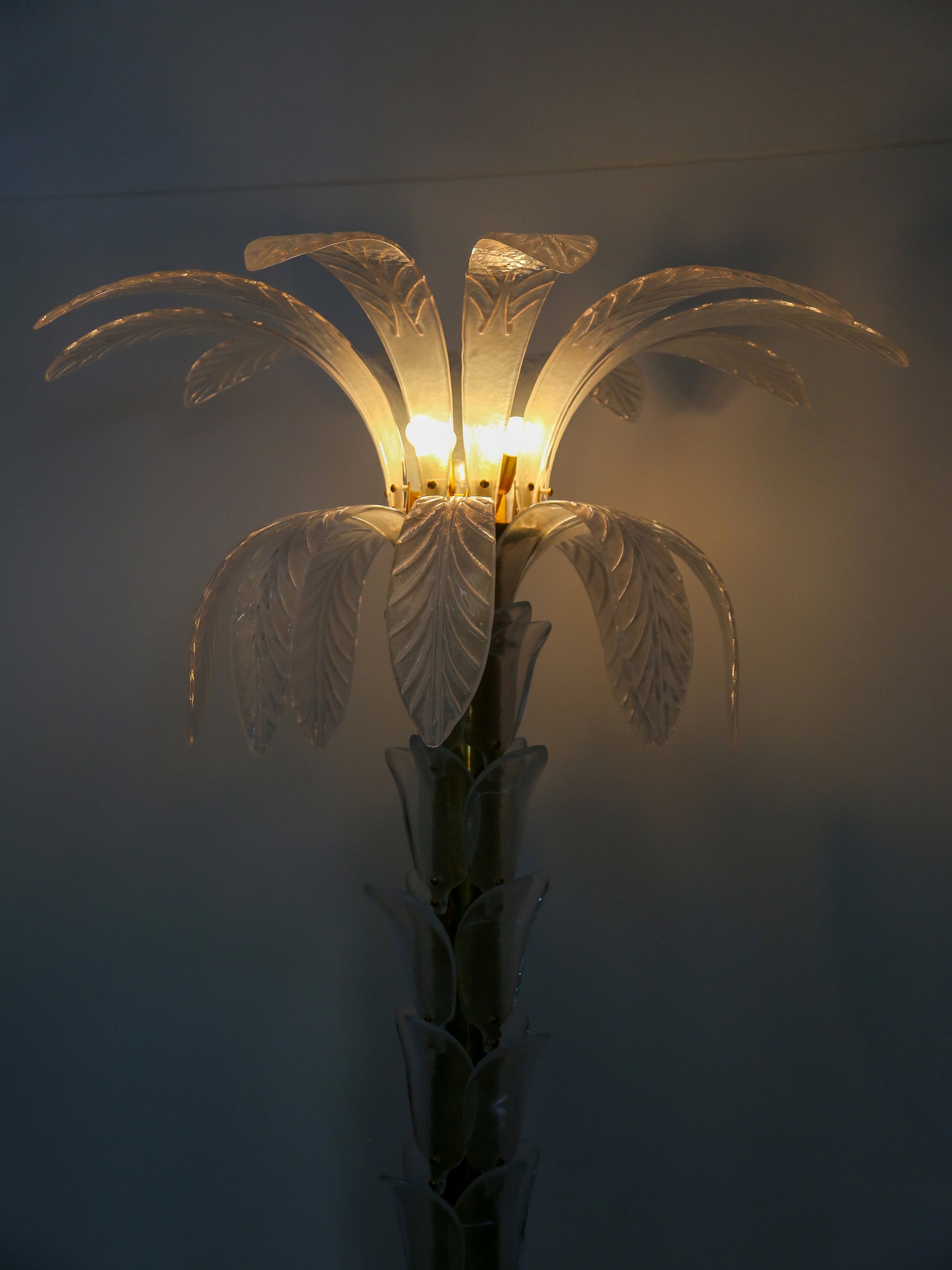 This extraordinary Murano glass palm tree floor lamp is a striking decorative statement, combining hand-blown Venetian glass artistry with a brass sculptural frame. Designed in the form of a palm, it features a tall central trunk covered in iridescent Murano glass leaves, rising to a canopy of large, finely detailed leaves that crown the composition.