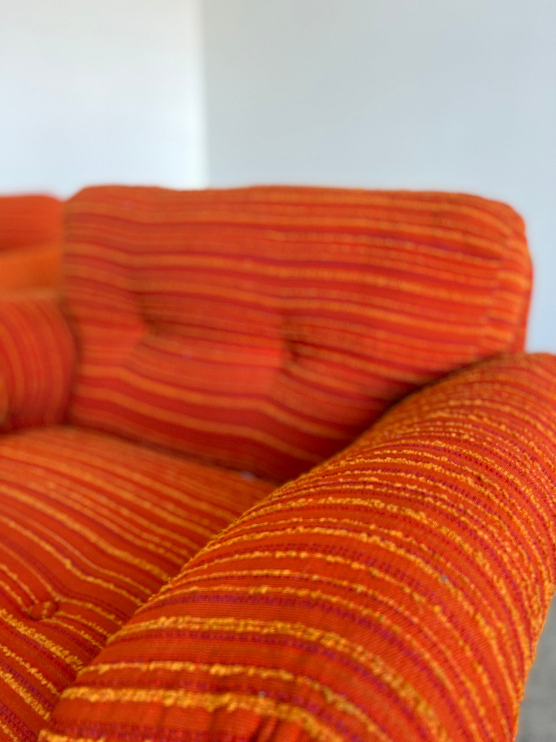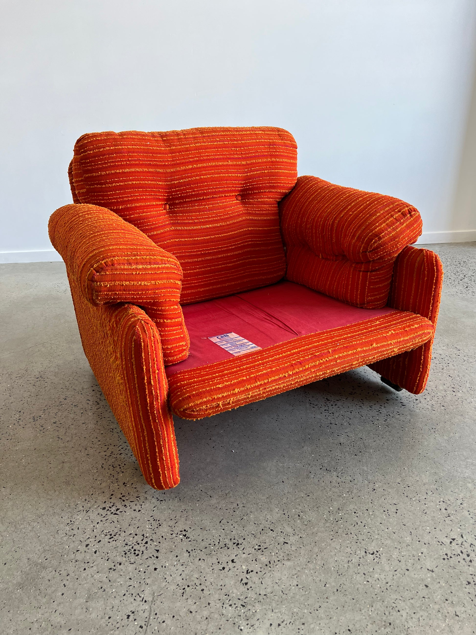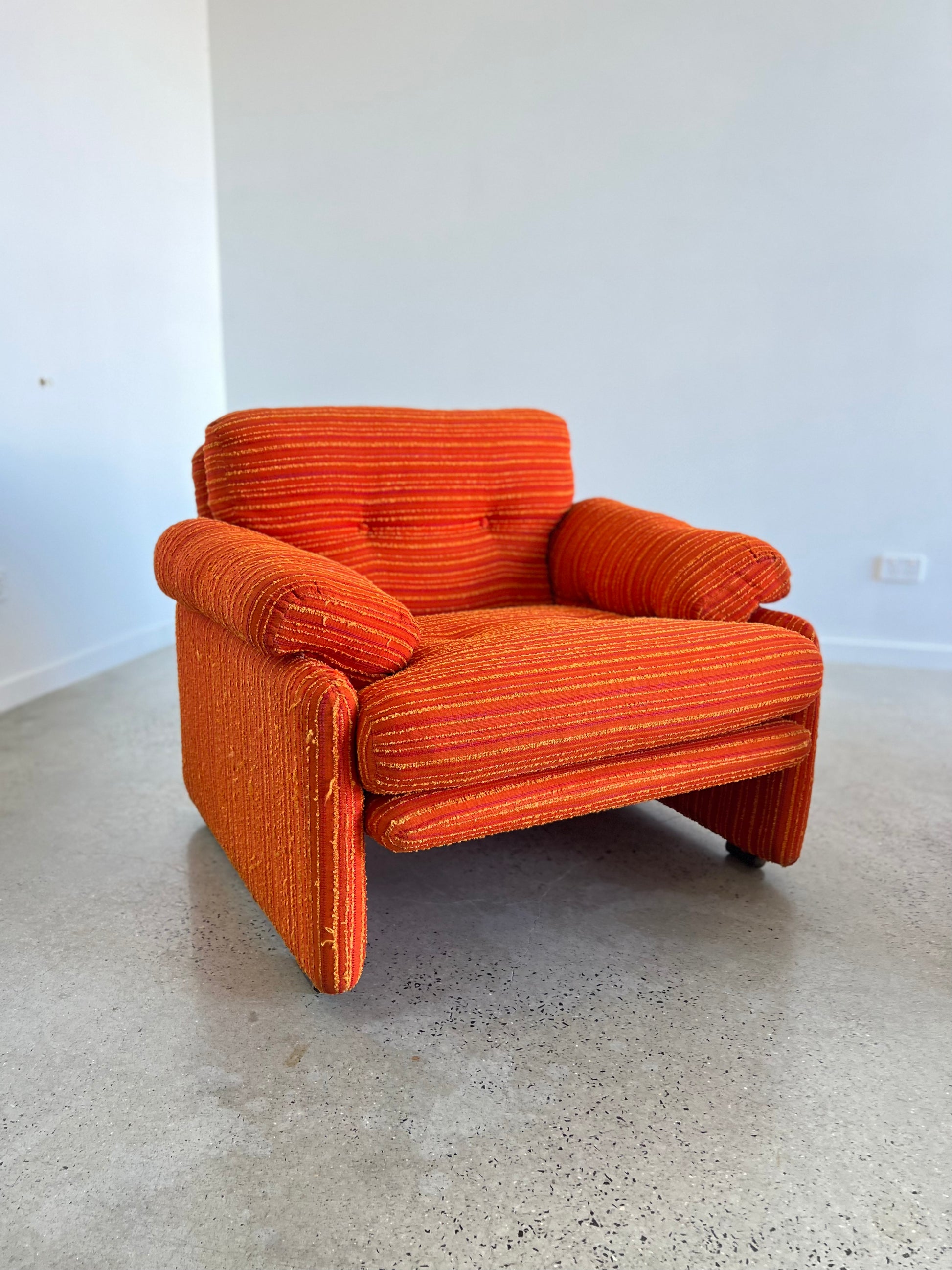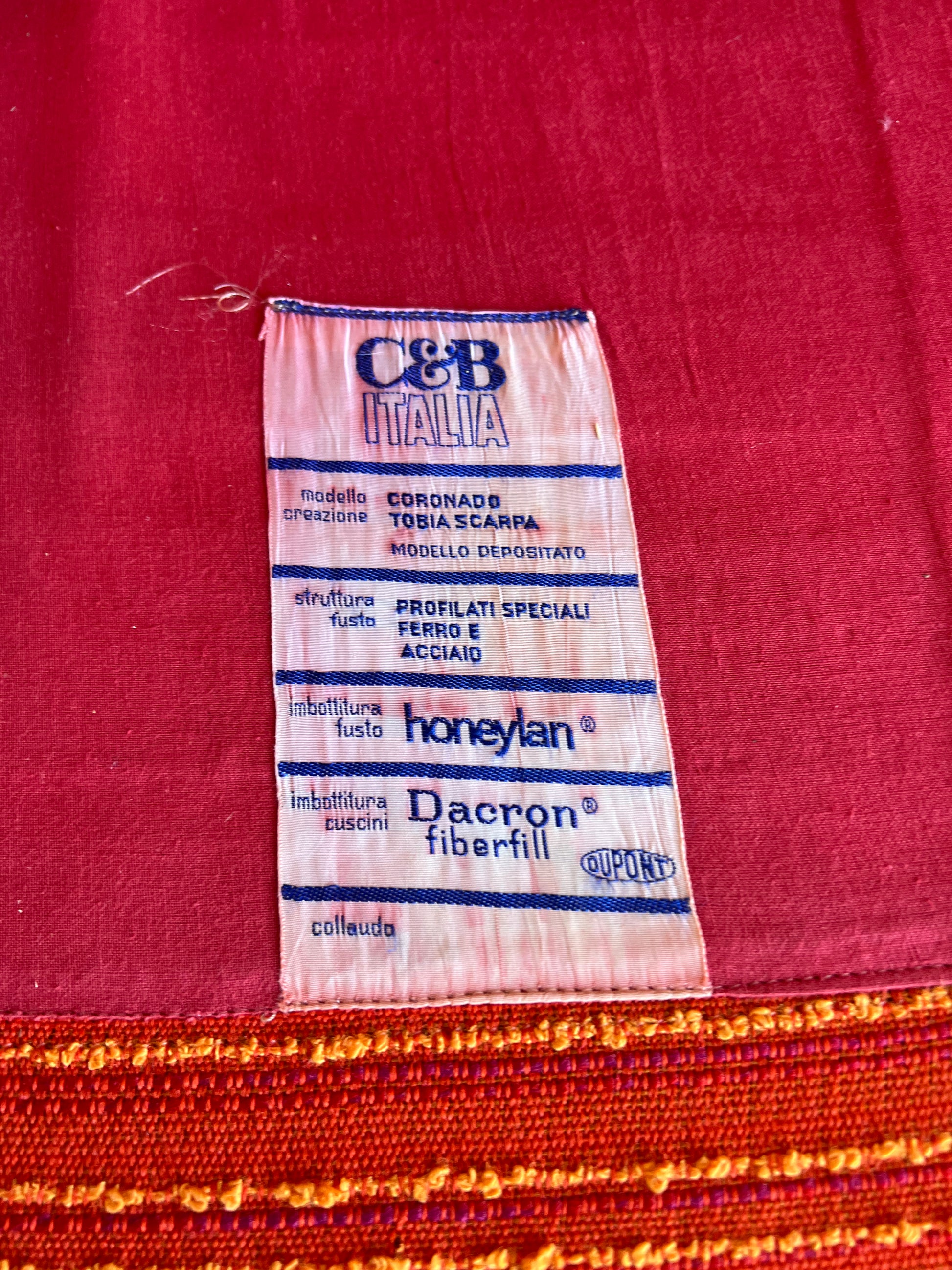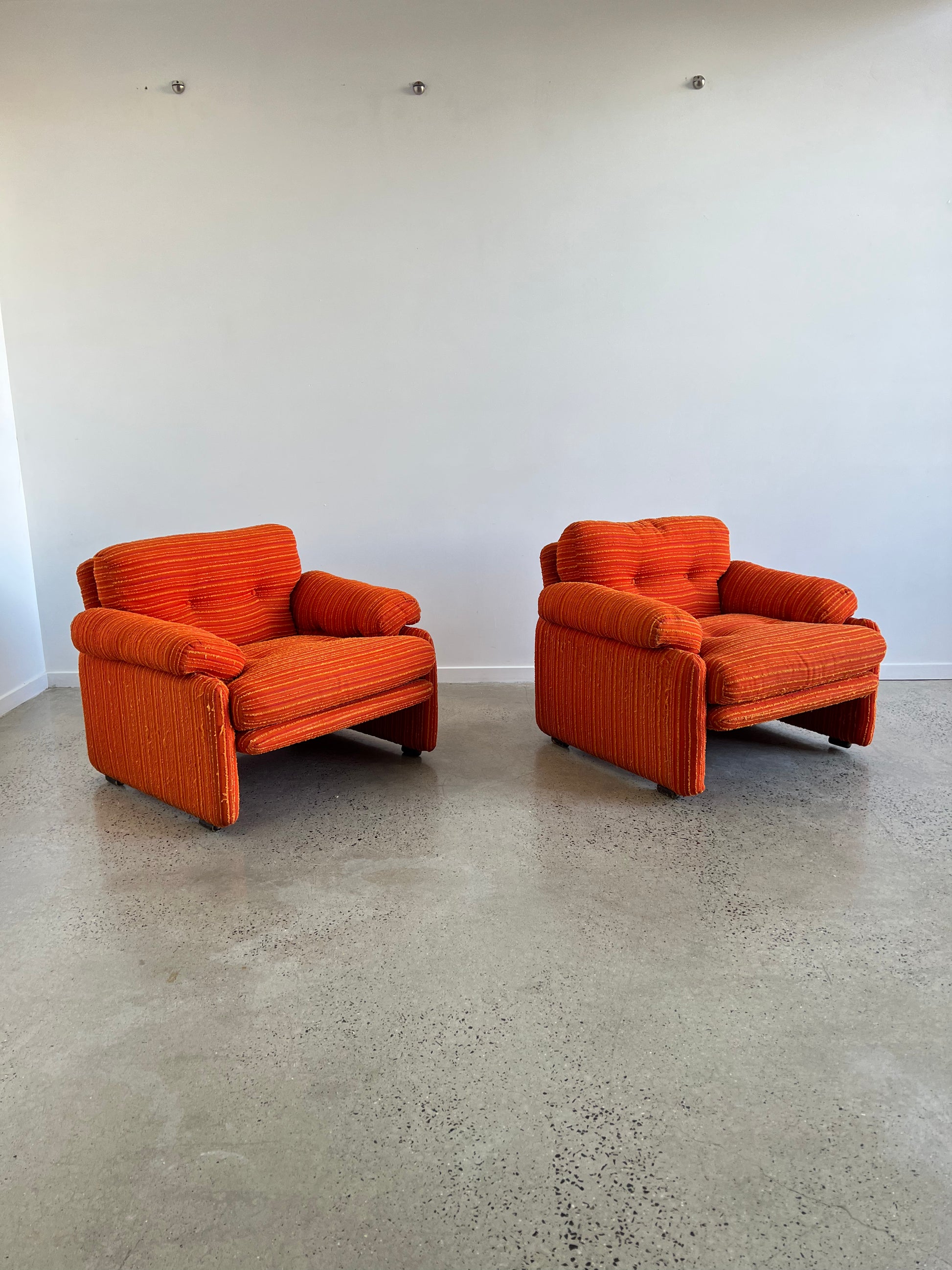 Add a touch of vintage sophistication to your living space with the Coronado lounge armchairs by Tobia Scarpa for C_B Italia (first edition) modello Depositato. These lounge armchairs are a true masterpiece of 1970s design, featuring their original vintage upholstery that is still in excellent condition.