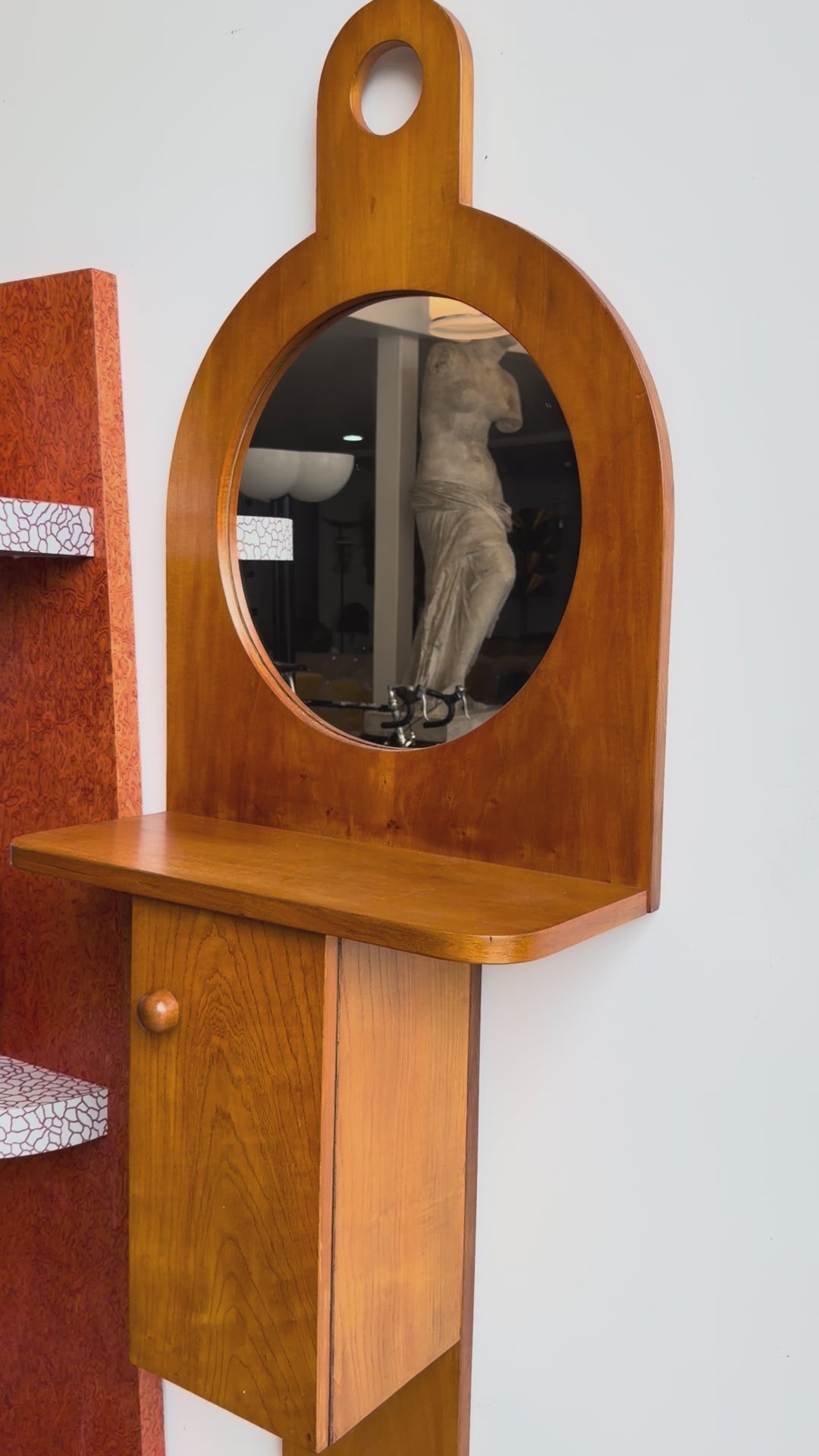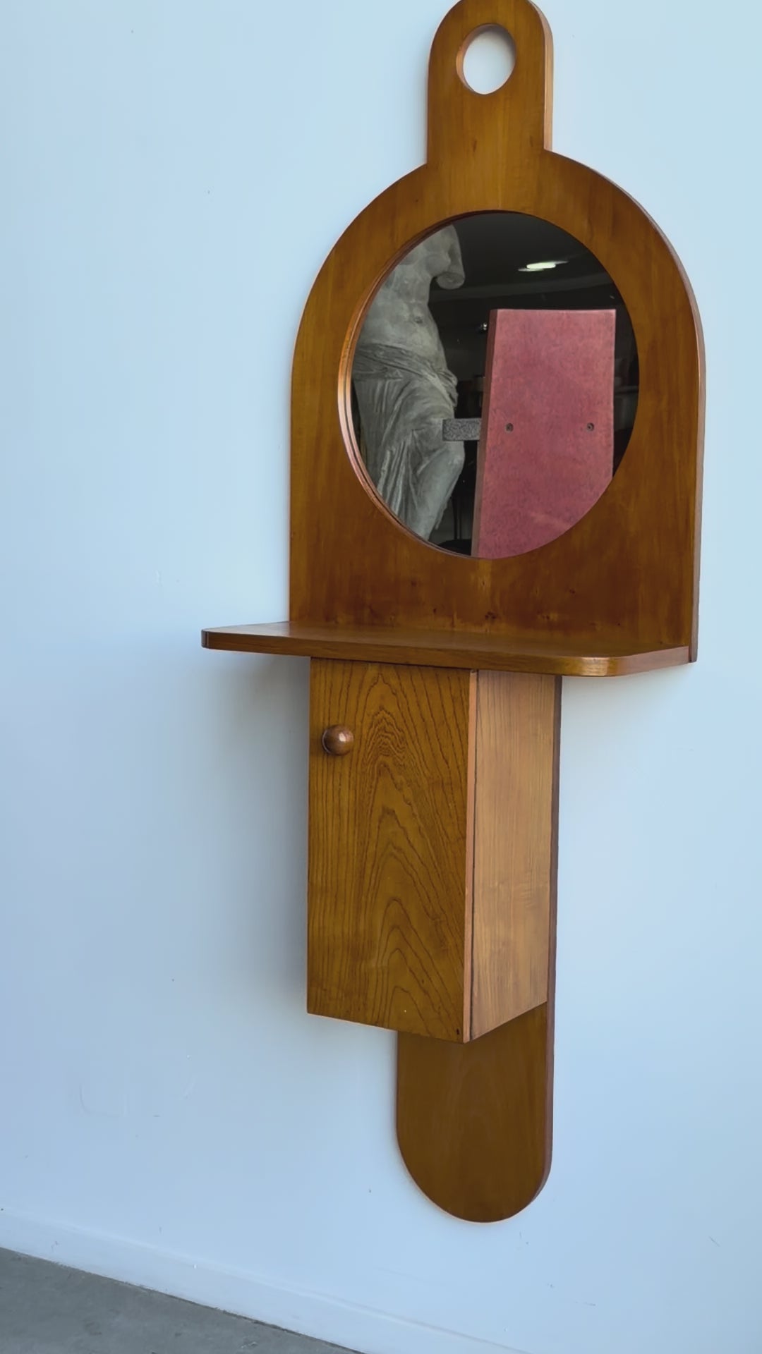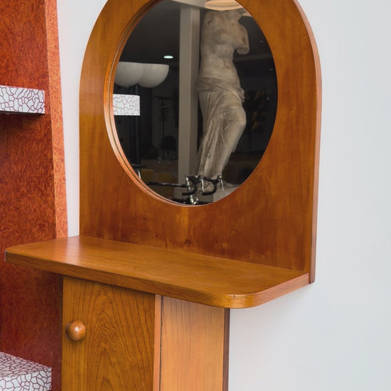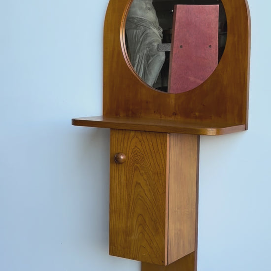 The Tempus Mid-Century mirror cabinet is both utilitarian and poetic. Its round mirror is framed above a minimalist shelf, while the hinged cabinet provides discreet storage. The sculptural cut-out top detail evokes both architectural arches and domestic forms, elevating the piece from everyday furniture into a collectible statement. Perfect as a hallway console, bedroom vanity, or bathroom accent, this cabinet demonstrates Sottsass’s unique ability to combine art, architecture, and design.