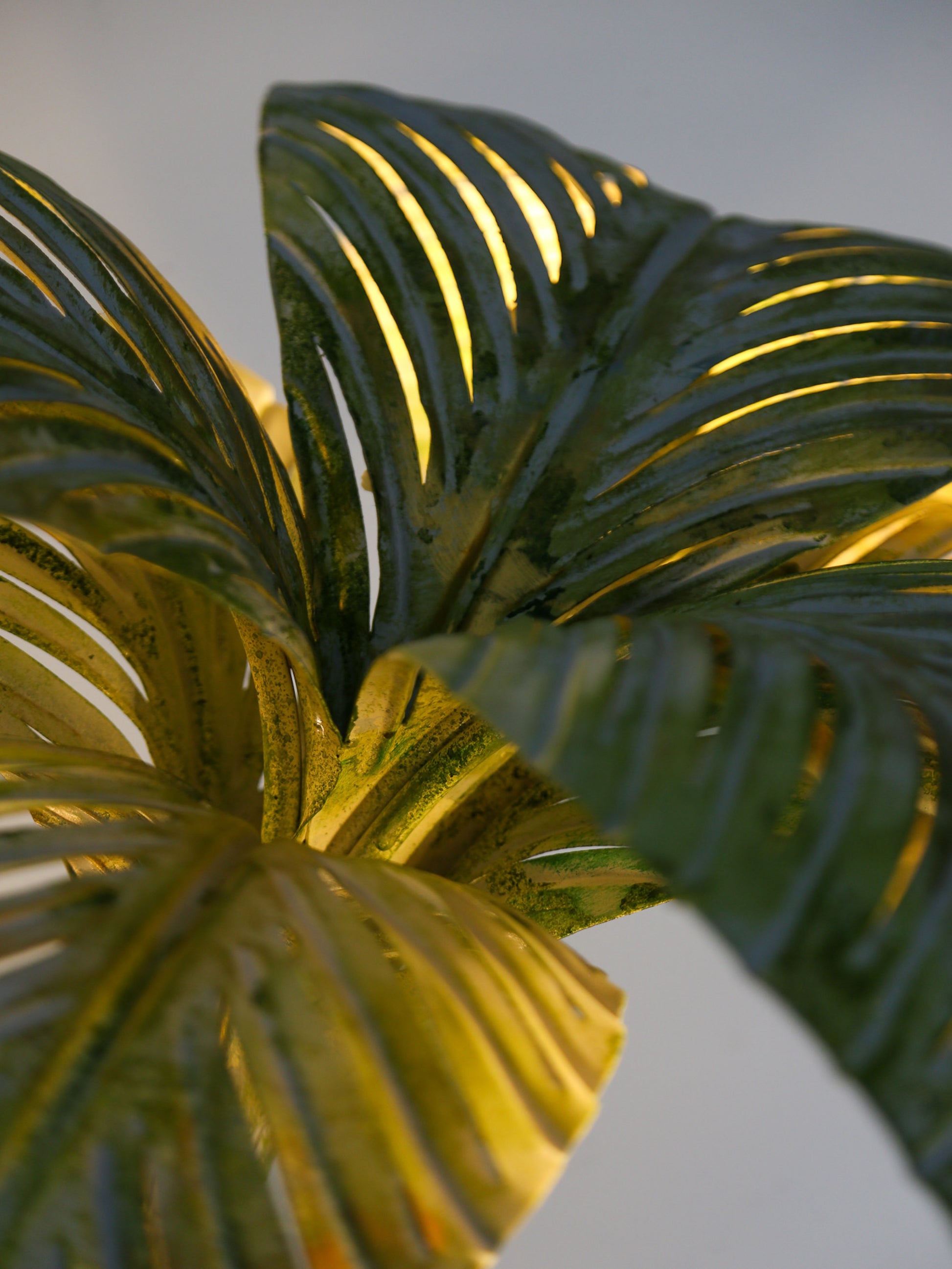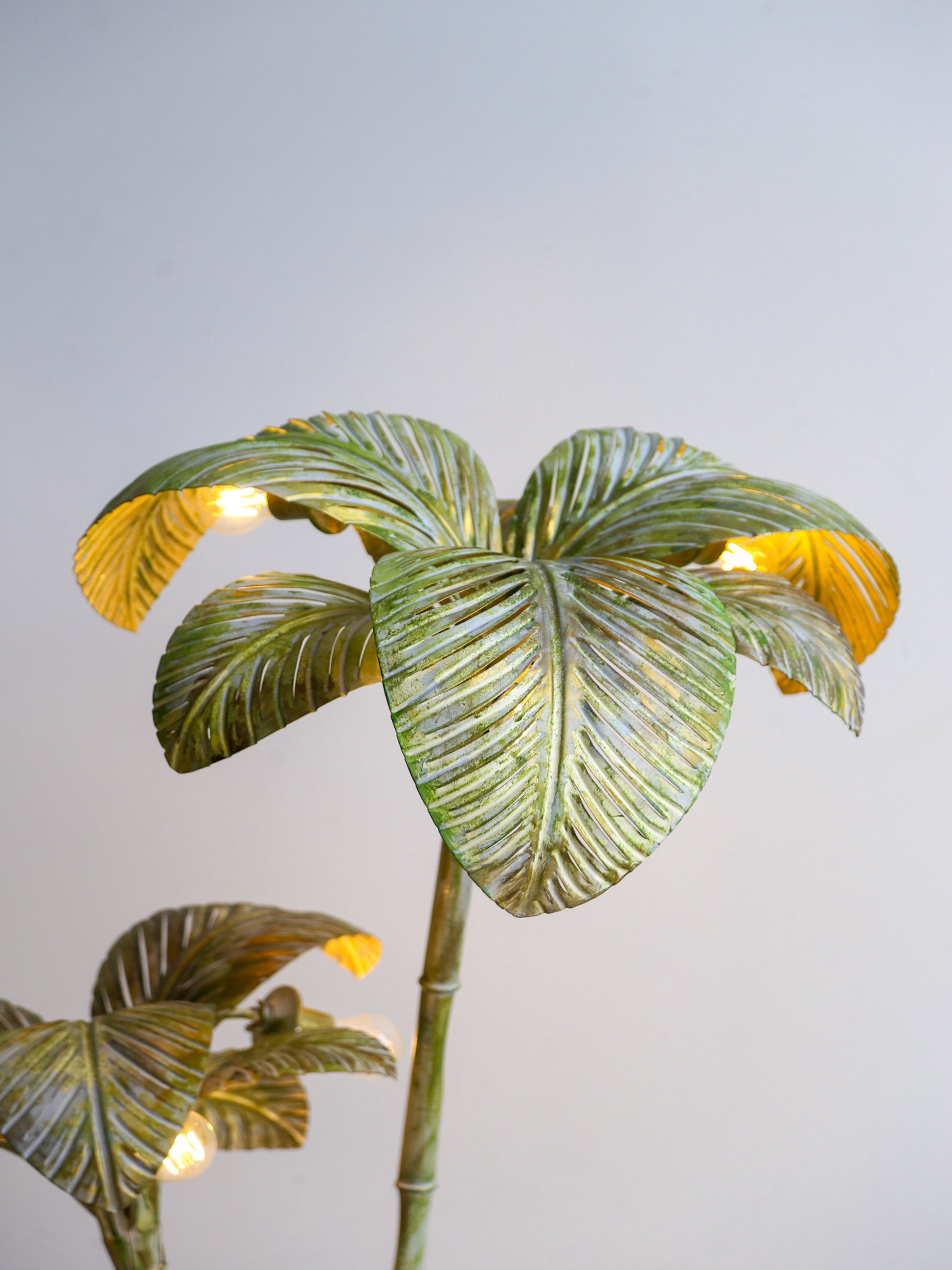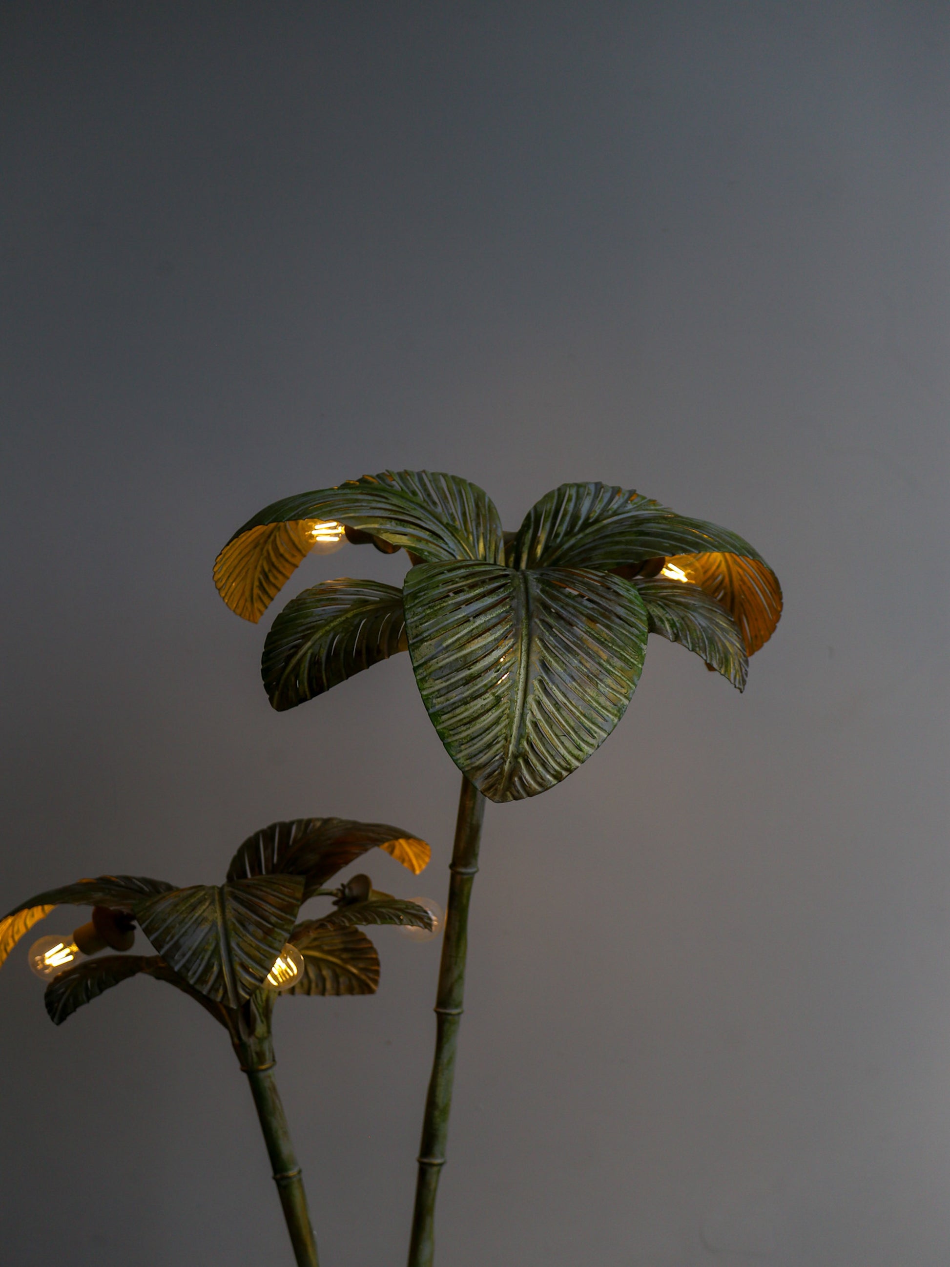 Standing on a circular base, the lamp features tall palm stems that branch into wide, hand-formed leaves. Each leaf conceals light fittings beneath, producing a warm, theatrical glow when illuminated. The patinated brass surface enhances the naturalistic detailing, while the upward lighting effect evokes a luxurious and atmospheric ambiance.