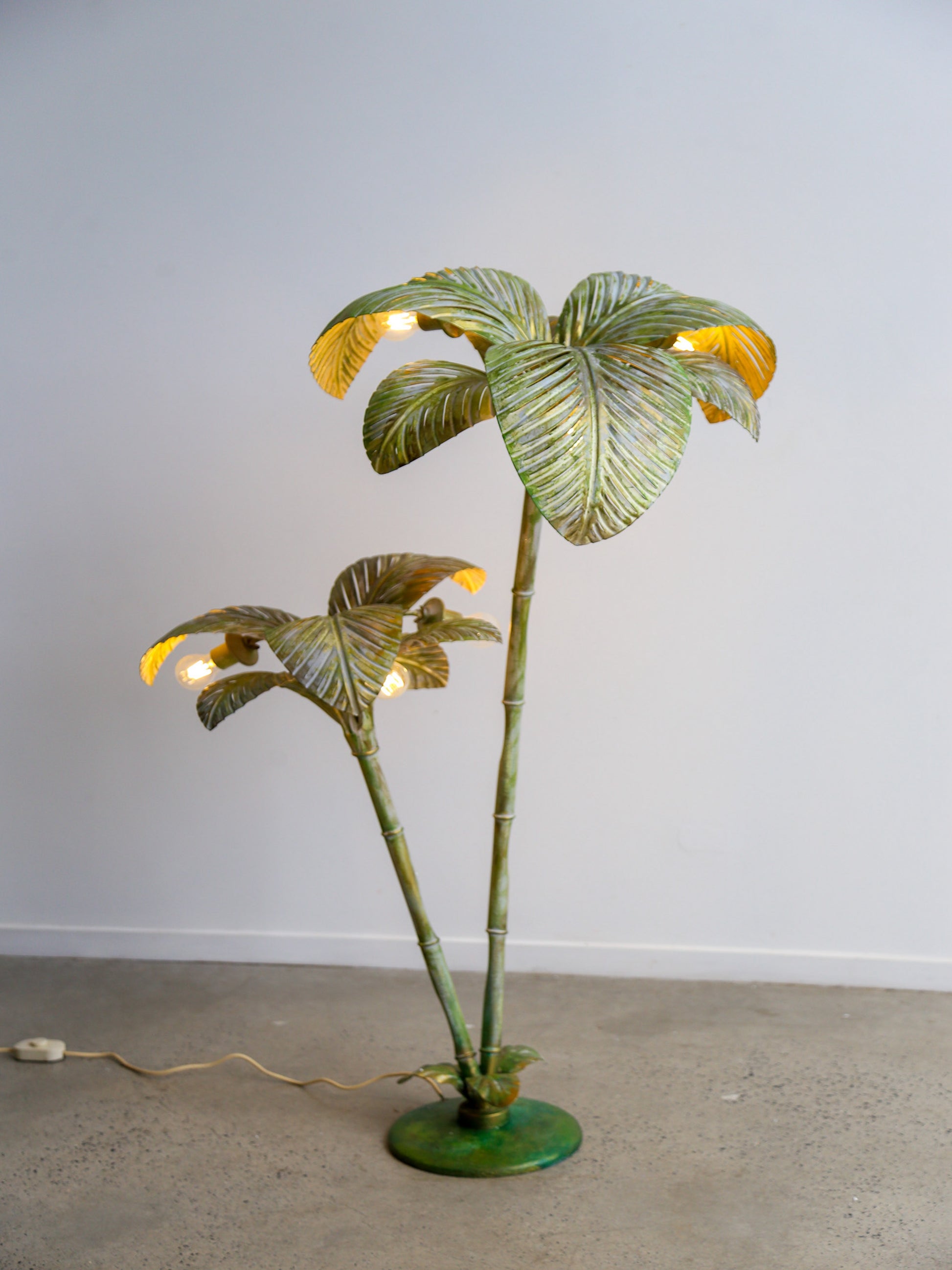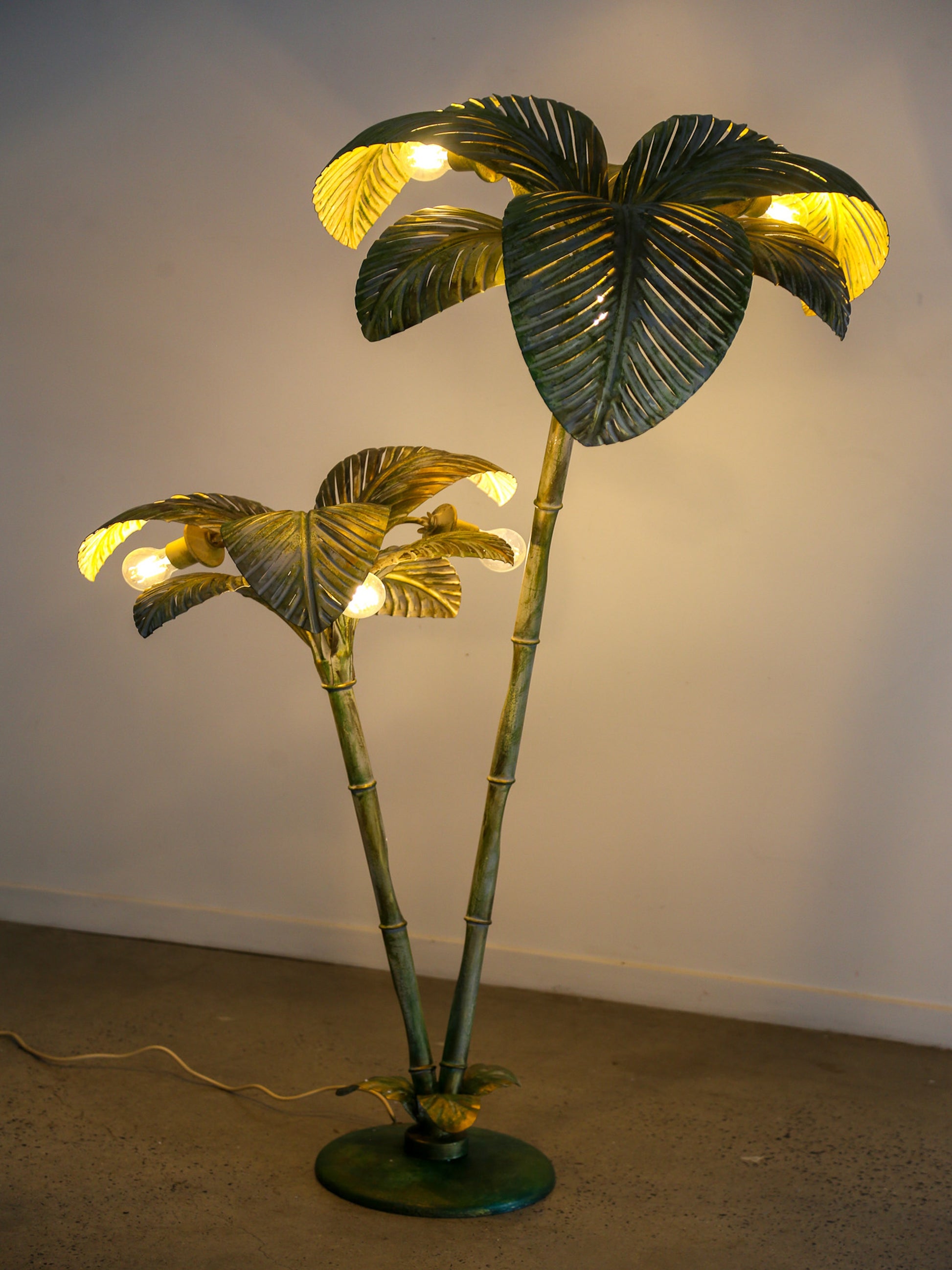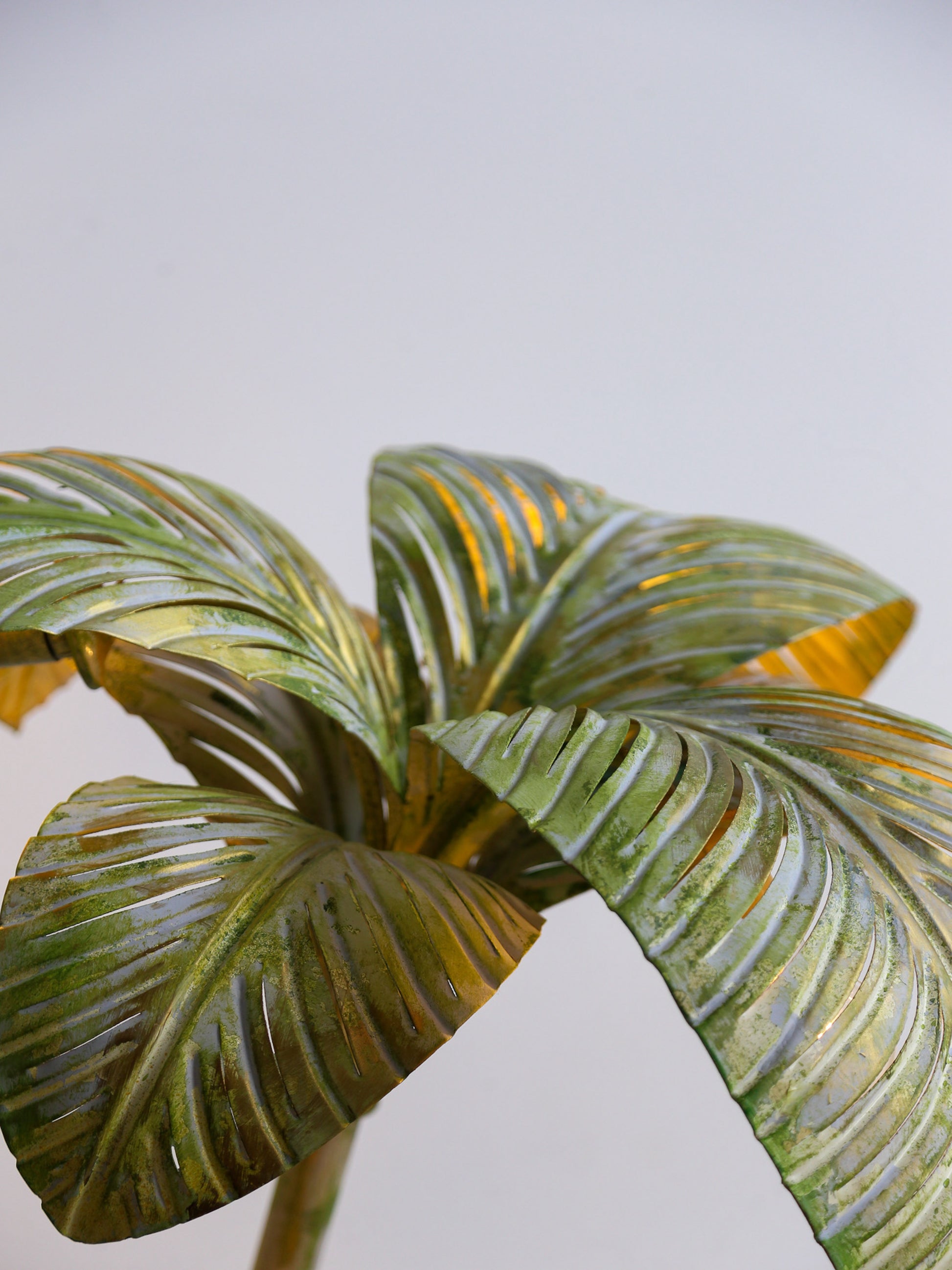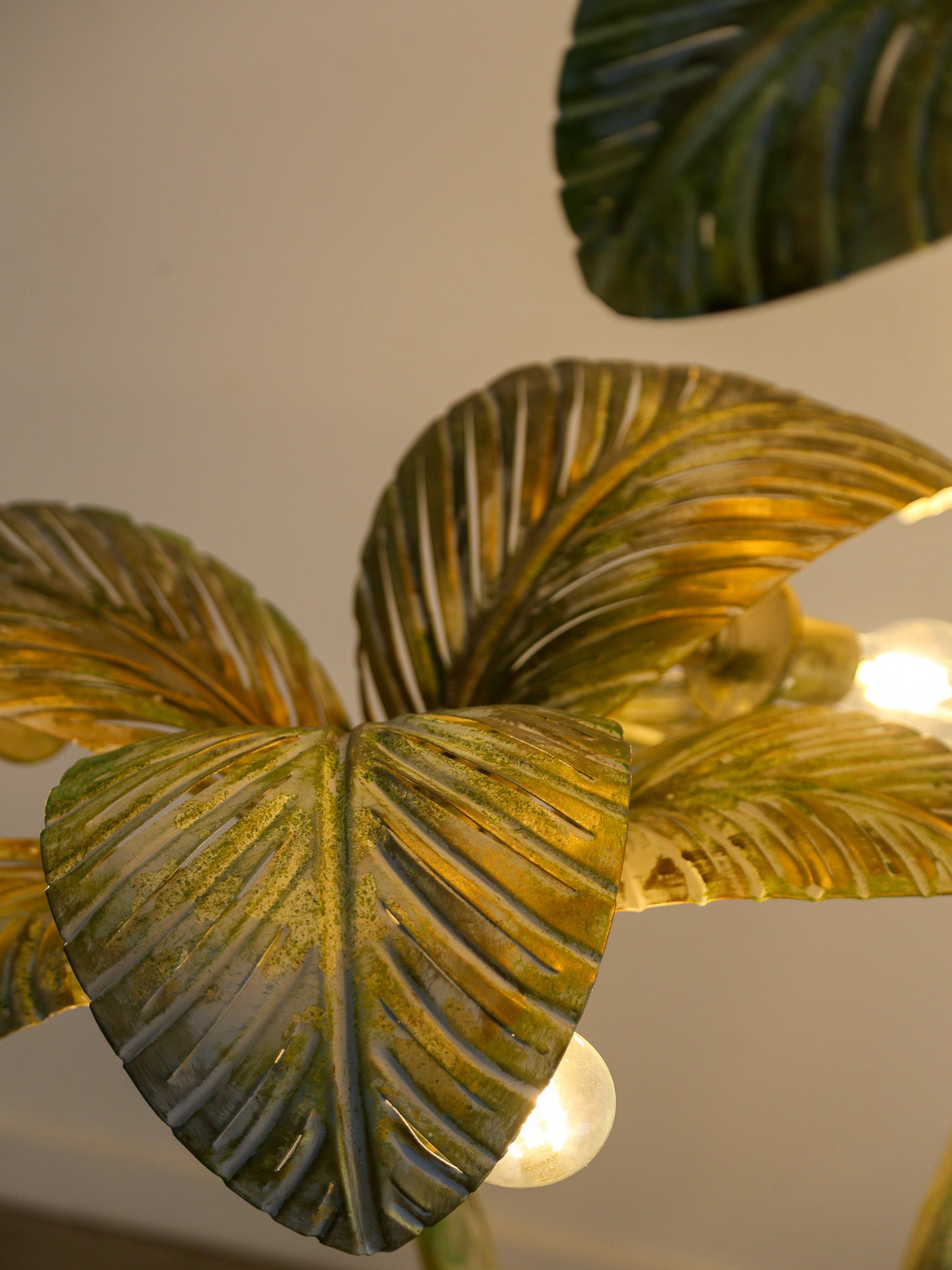 Standing on a circular base, the lamp features tall palm stems that branch into wide, hand-formed leaves. Each leaf conceals light fittings beneath, producing a warm, theatrical glow when illuminated. The patinated brass surface enhances the naturalistic detailing, while the upward lighting effect evokes a luxurious and atmospheric ambiance.