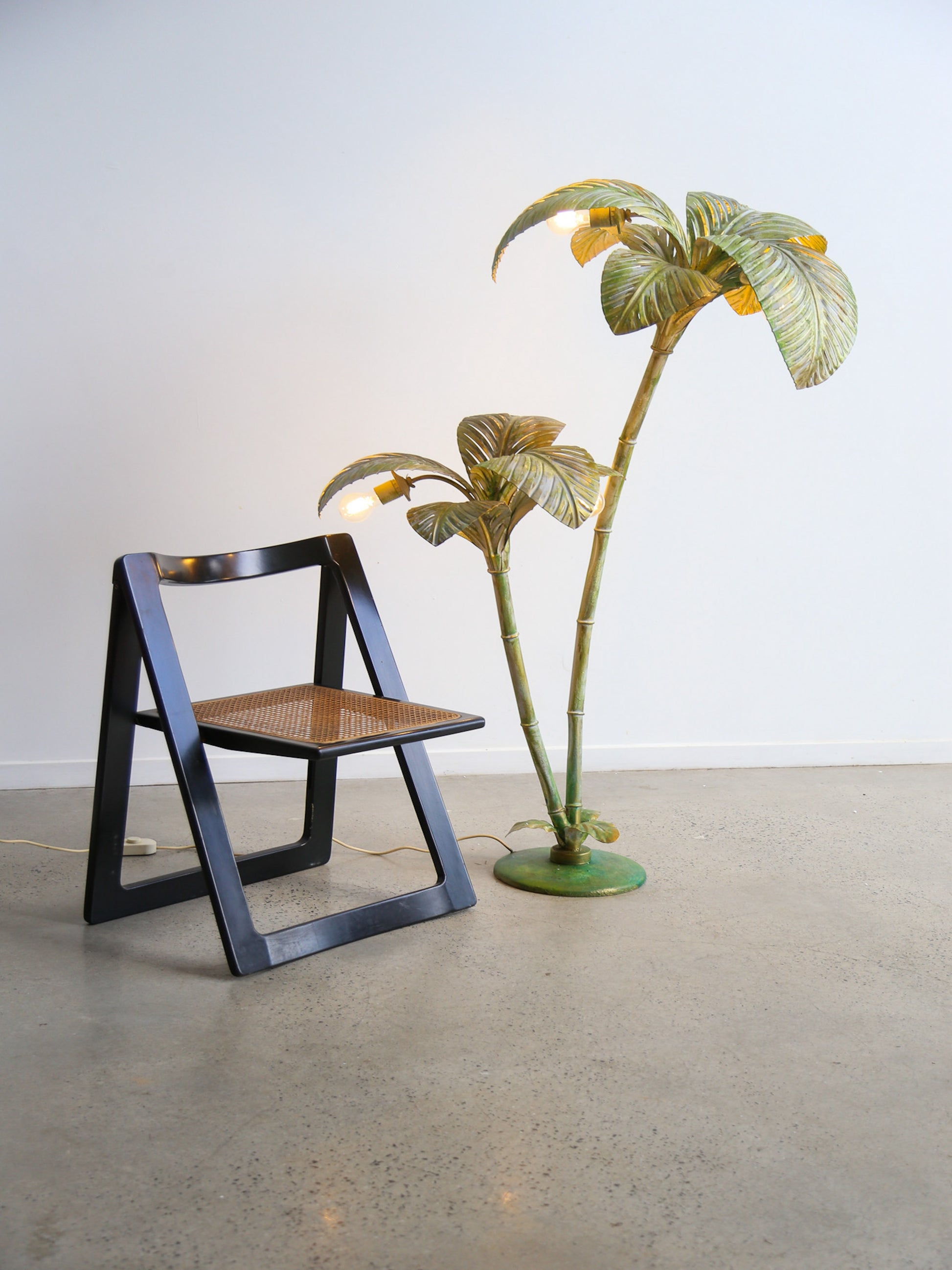 This brass palm tree floor lamp designed by Sergio Terzani in the 1970s is a striking example of Italian mid-century decorative lighting. Entirely handcrafted, the piece was created using the repoussé and chasing techniques, giving the brass leaves their finely detailed, sculptural quality. With its dramatic scale and tropical motif, the lamp doubles as both functional lighting and a sculptural statement piece.
