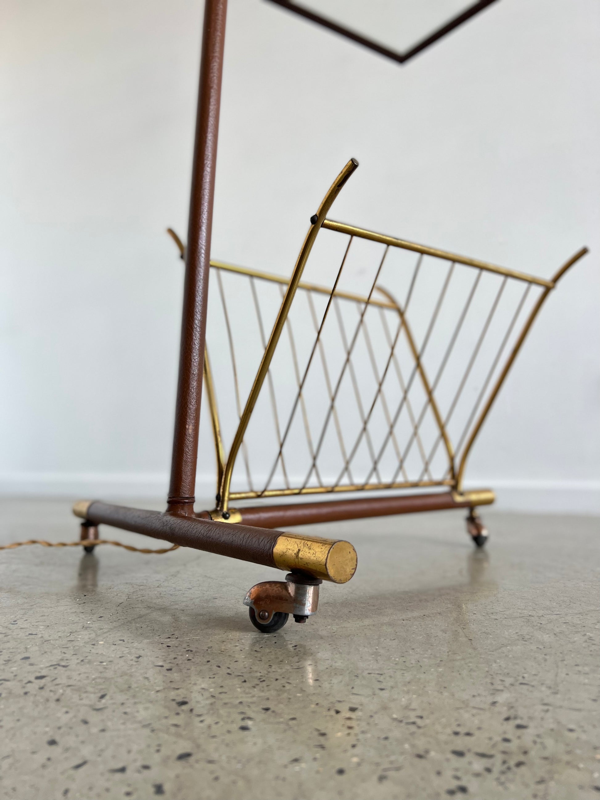 This rare and iconic floor lamp by Angelo Lelli for Stilnovo combines sculptural design with everyday functionality. Featuring adjustable dual-cone lights, a glass table tray, and an integrated magazine holder, it exemplifies the elegance and innovation of Italian mid-century modern lighting.