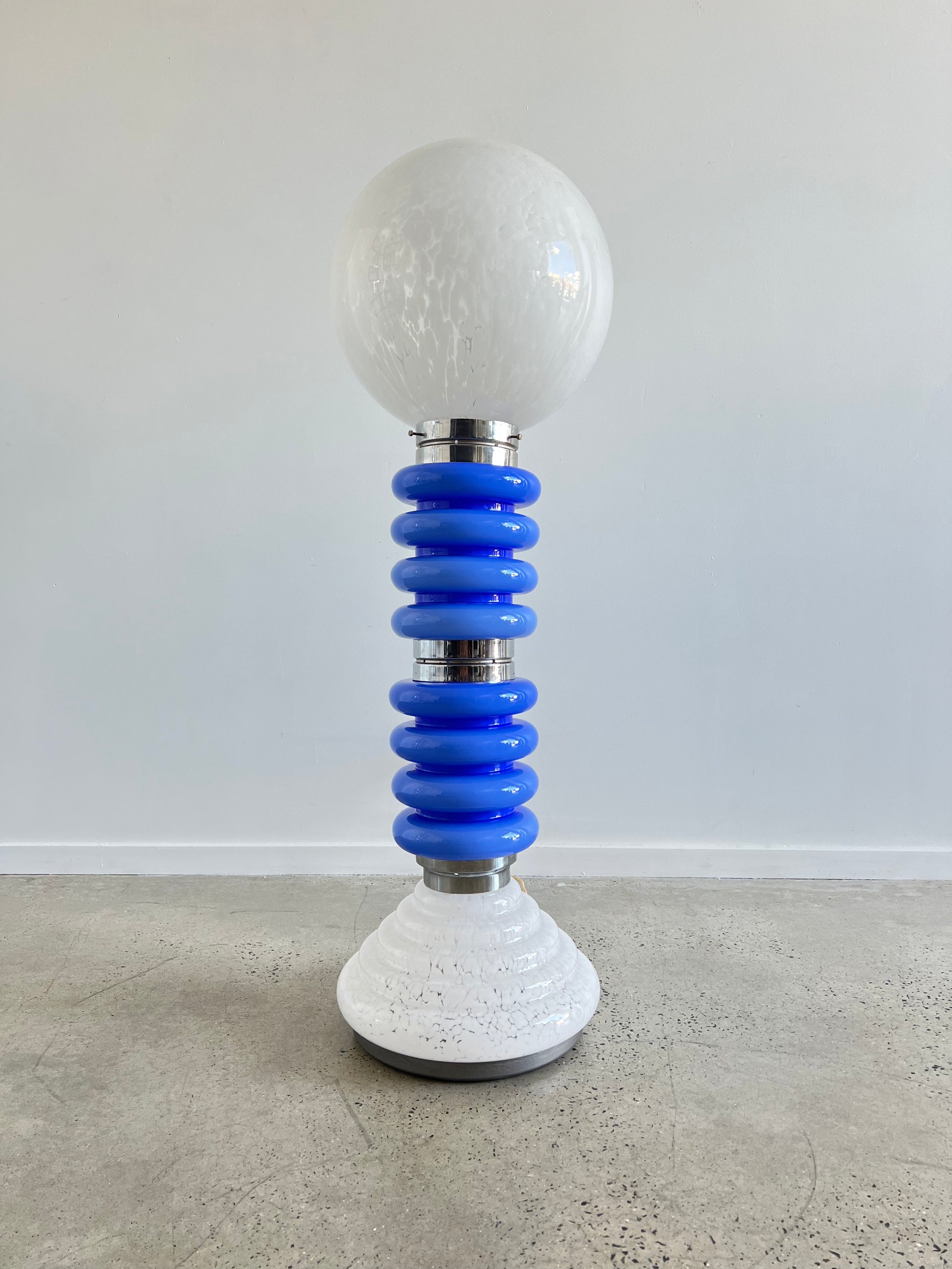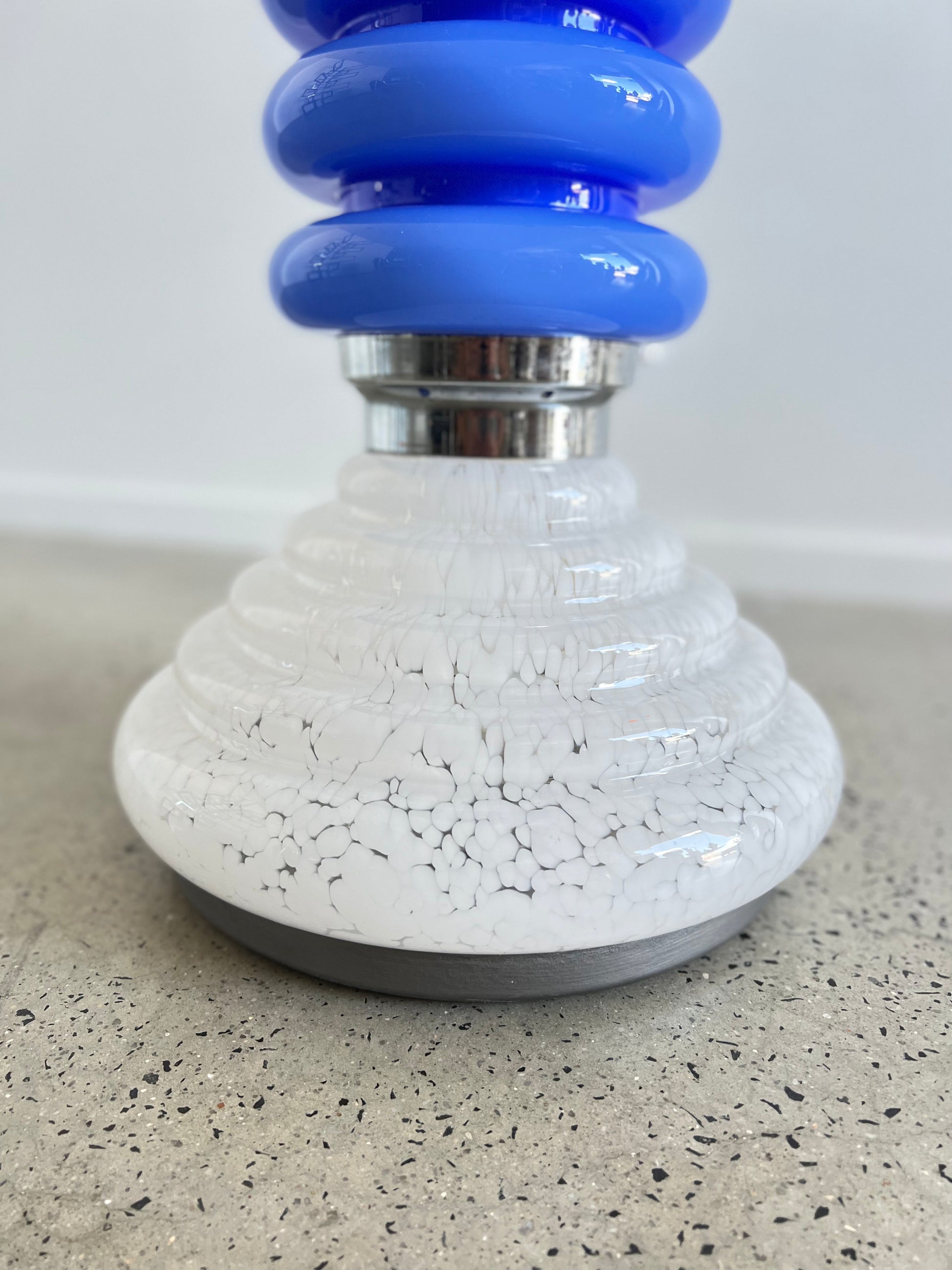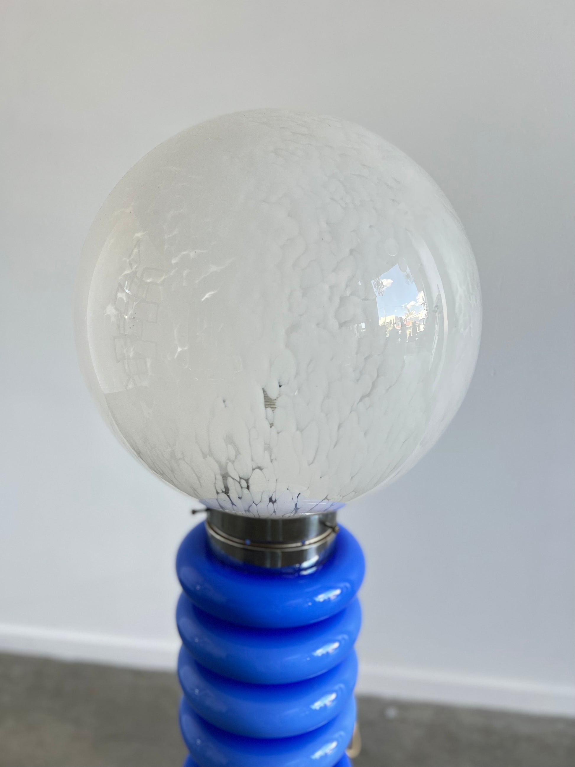 The lamp features a sleek, modern design that is typical of the Space Age style that was popular during the 1960s. The lamp is made entirely out of glass, with chromed center pieces that add a touch of contrast to the overall design. The blue color of the glass and the white Murano glass globe shade create a striking contrast that makes the lamp a standout piece in any room.
