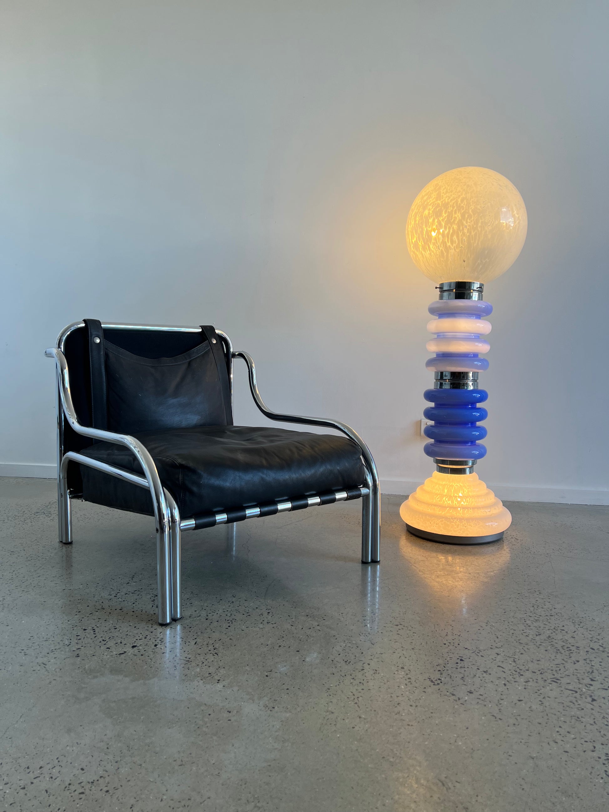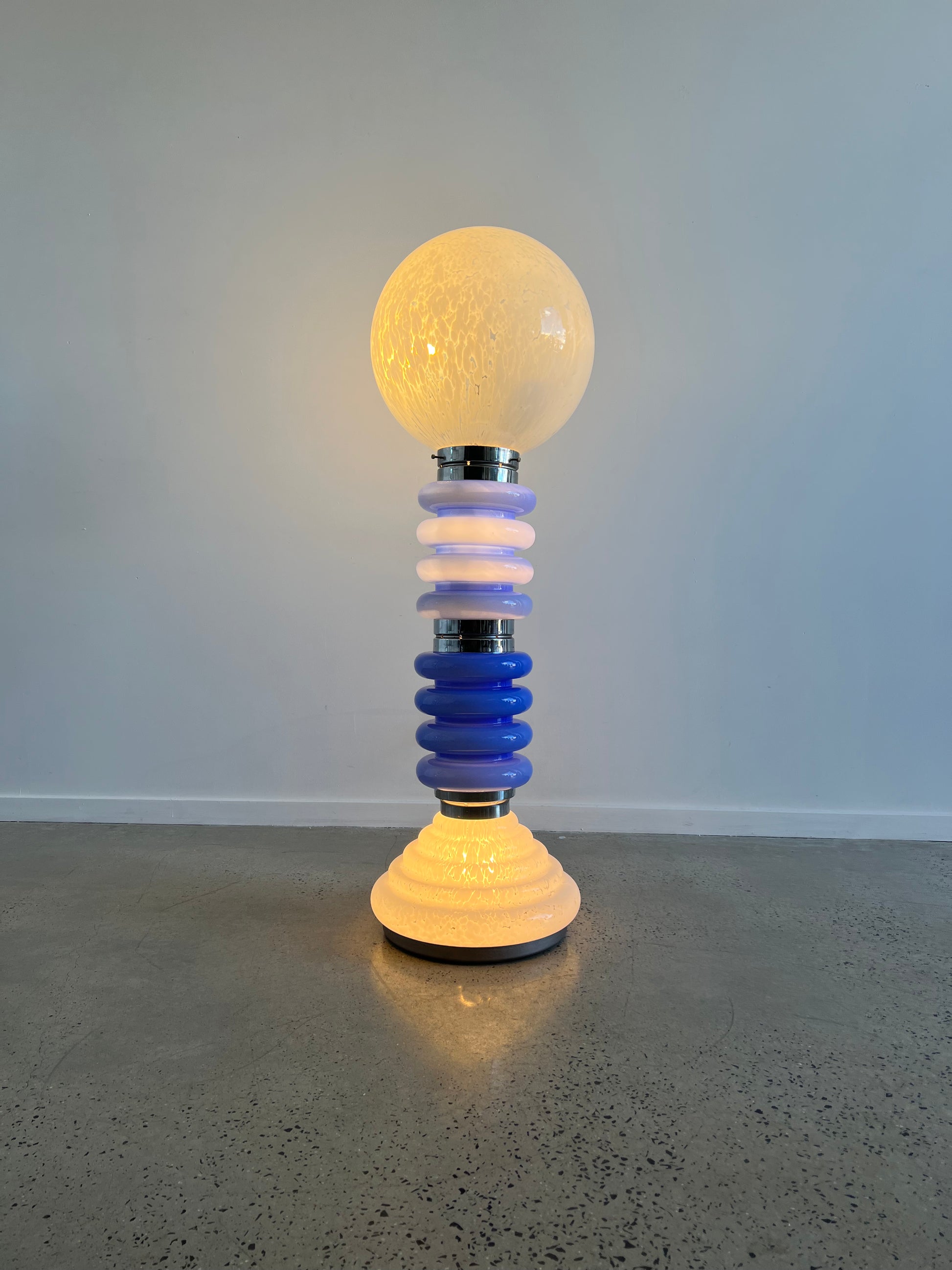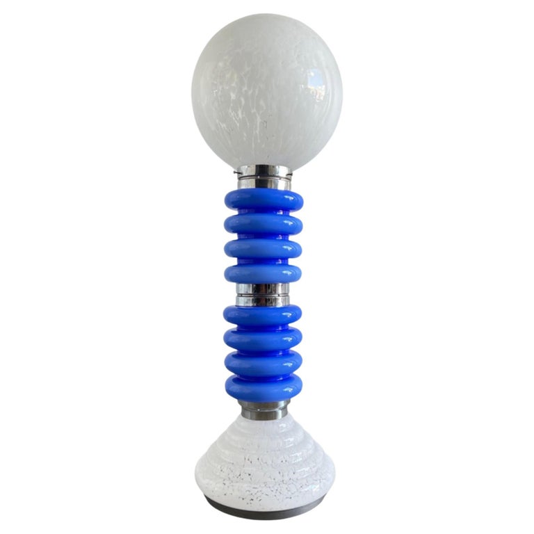 The lamp features a sleek, modern design that is typical of the Space Age style that was popular during the 1960s. The lamp is made entirely out of glass, with chromed center pieces that add a touch of contrast to the overall design. The blue color of the glass and the white Murano glass globe shade create a striking contrast that makes the lamp a standout piece in any room.
