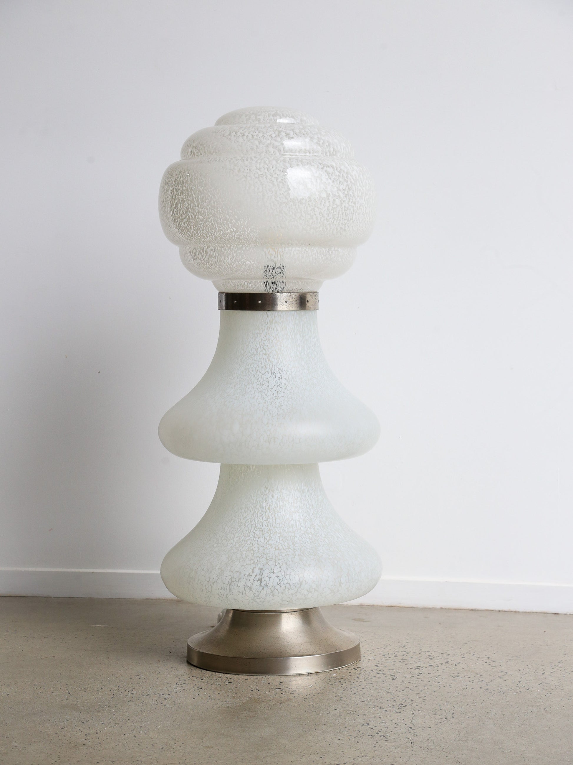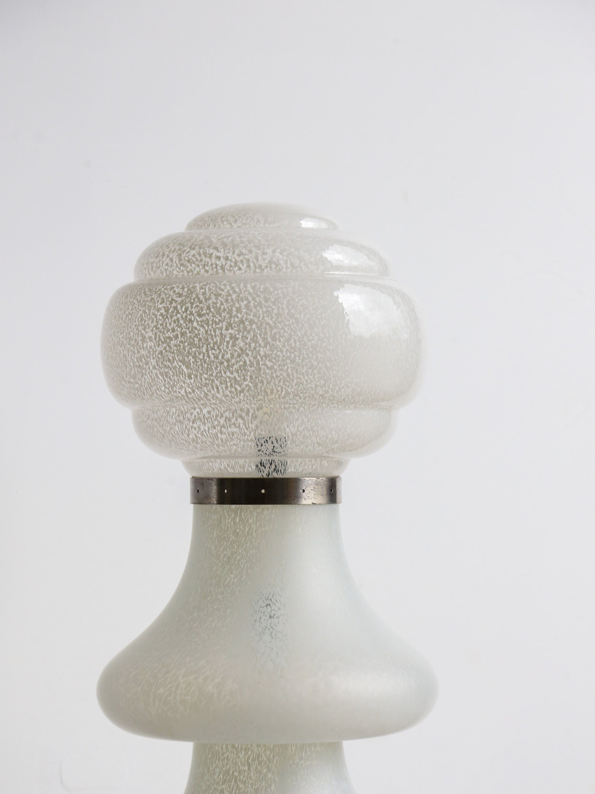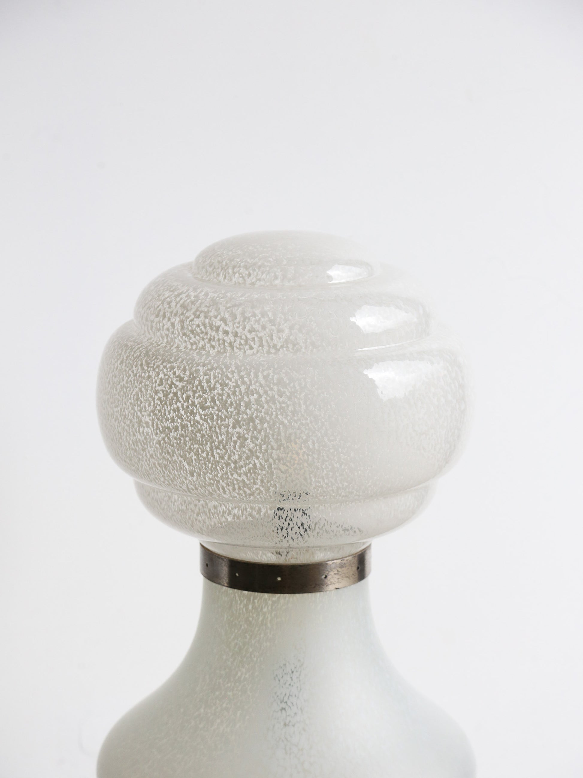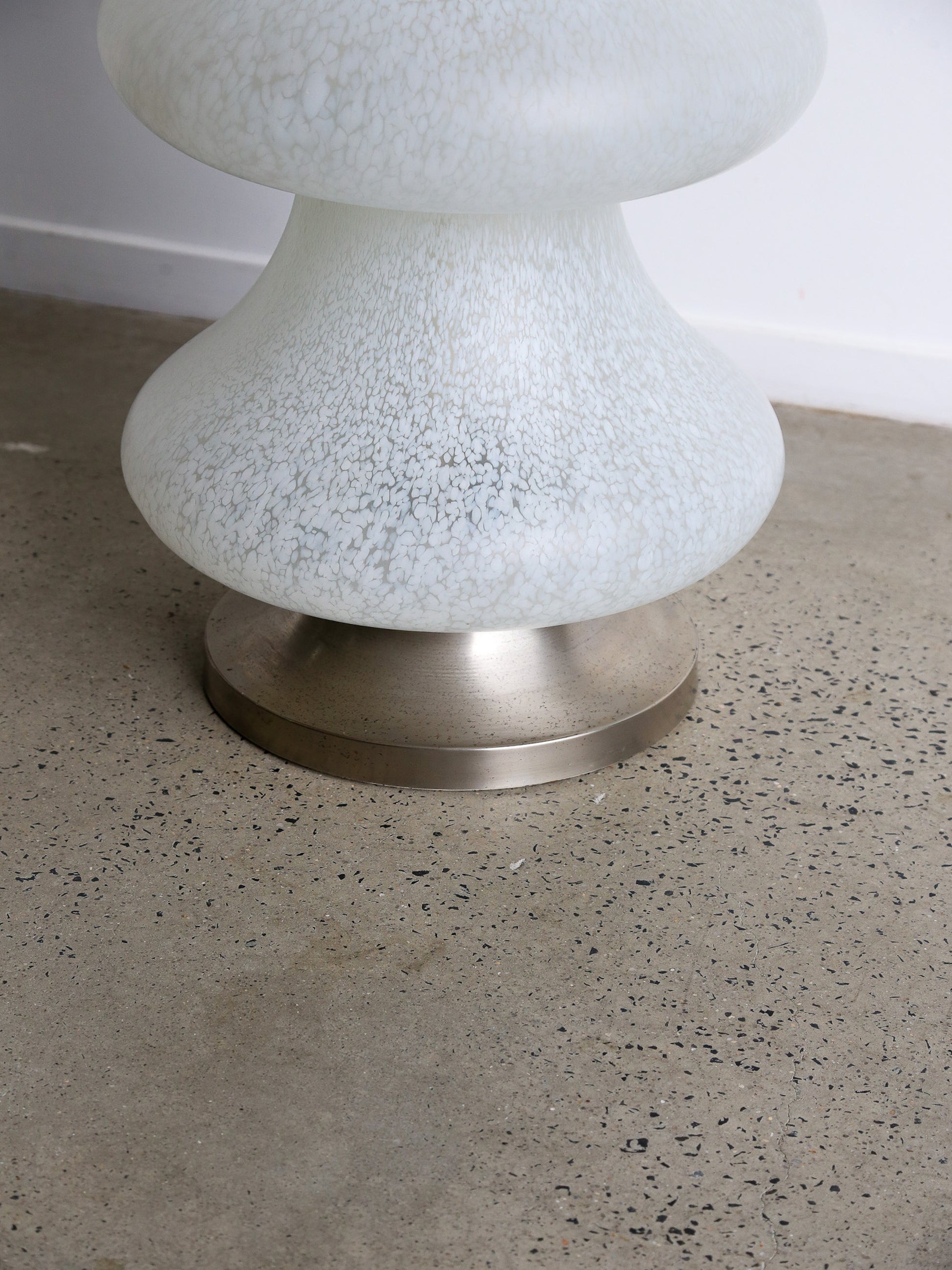 The lamp features a sleek, modern design that is typical of the Space Age style that was popular during the 1960s. The lamp is made entirely out of glass, with chromed base and center piece that add a touch of contrast to the overall design. The white Murano glass globe shade create a striking contrast that makes the lamp a standout piece in any room.
