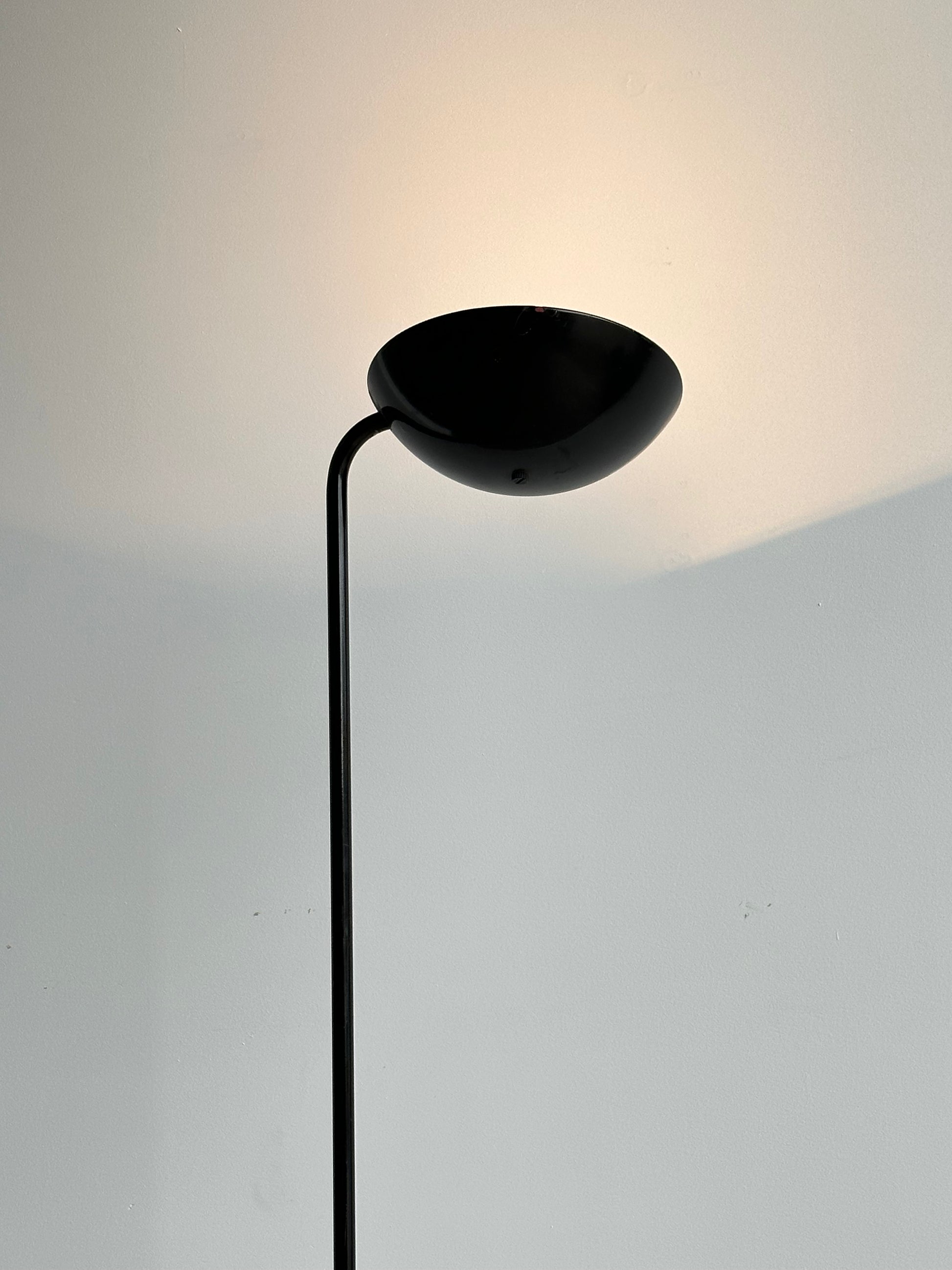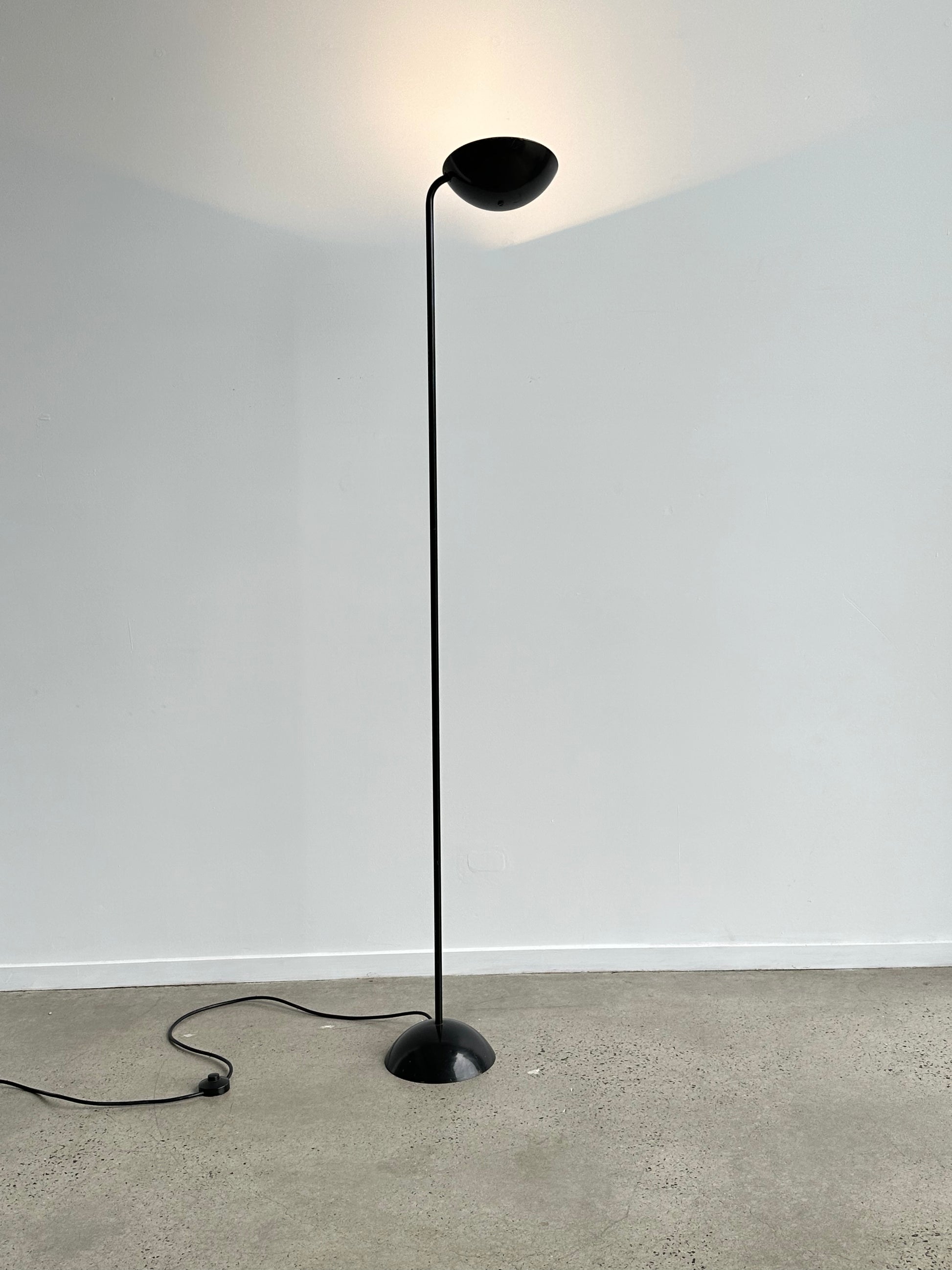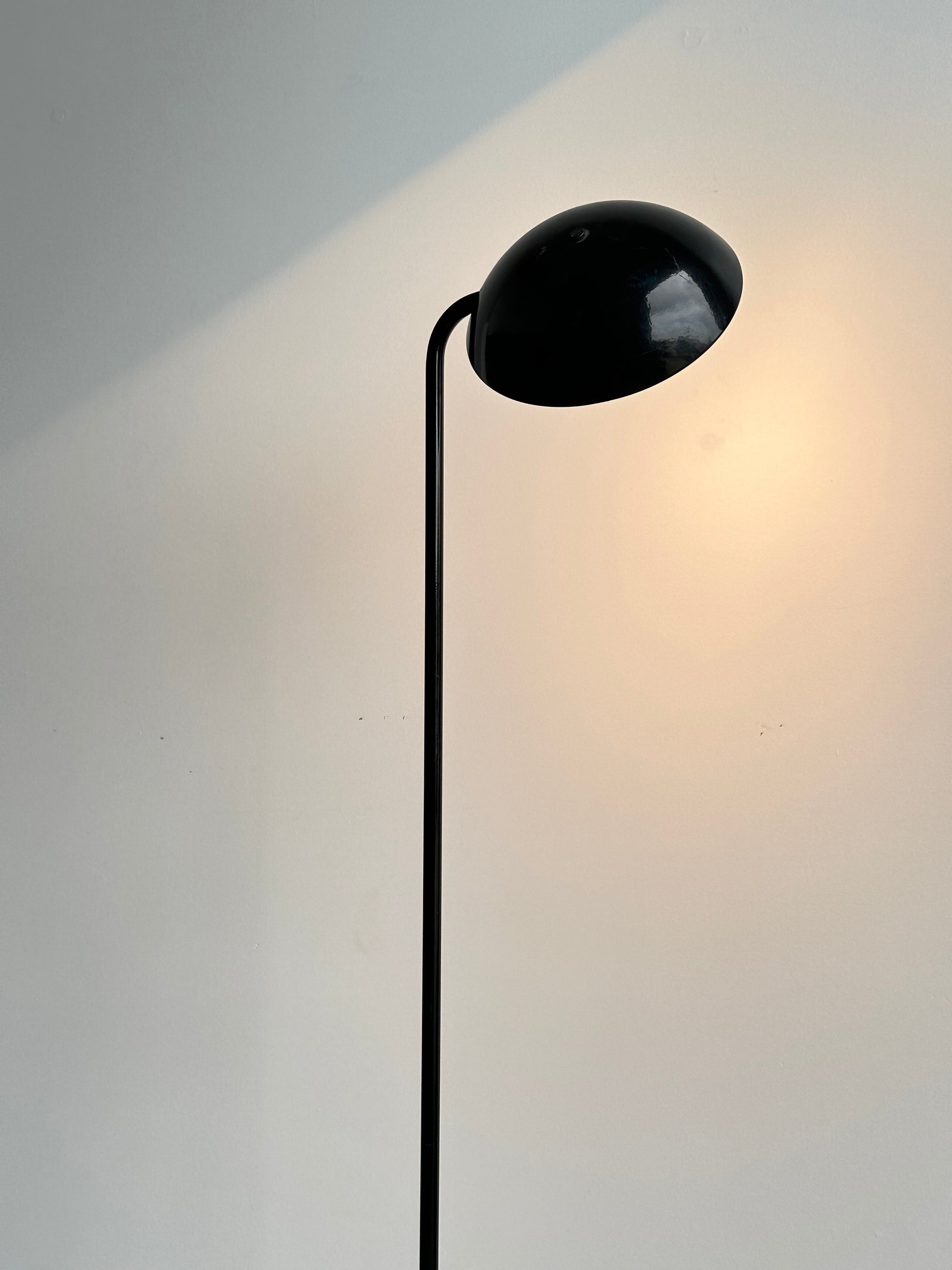The lamp features a slender upright stem balanced by a hemispherical base and a rounded head, creating a refined architectural form. The halogen bulb provides bright yet soft illumination, making it perfect for reading corners, living spaces, or as a decorative feature. The minimalist profile allows it to integrate seamlessly into contemporary settings while retaining its 1970s modernist character.