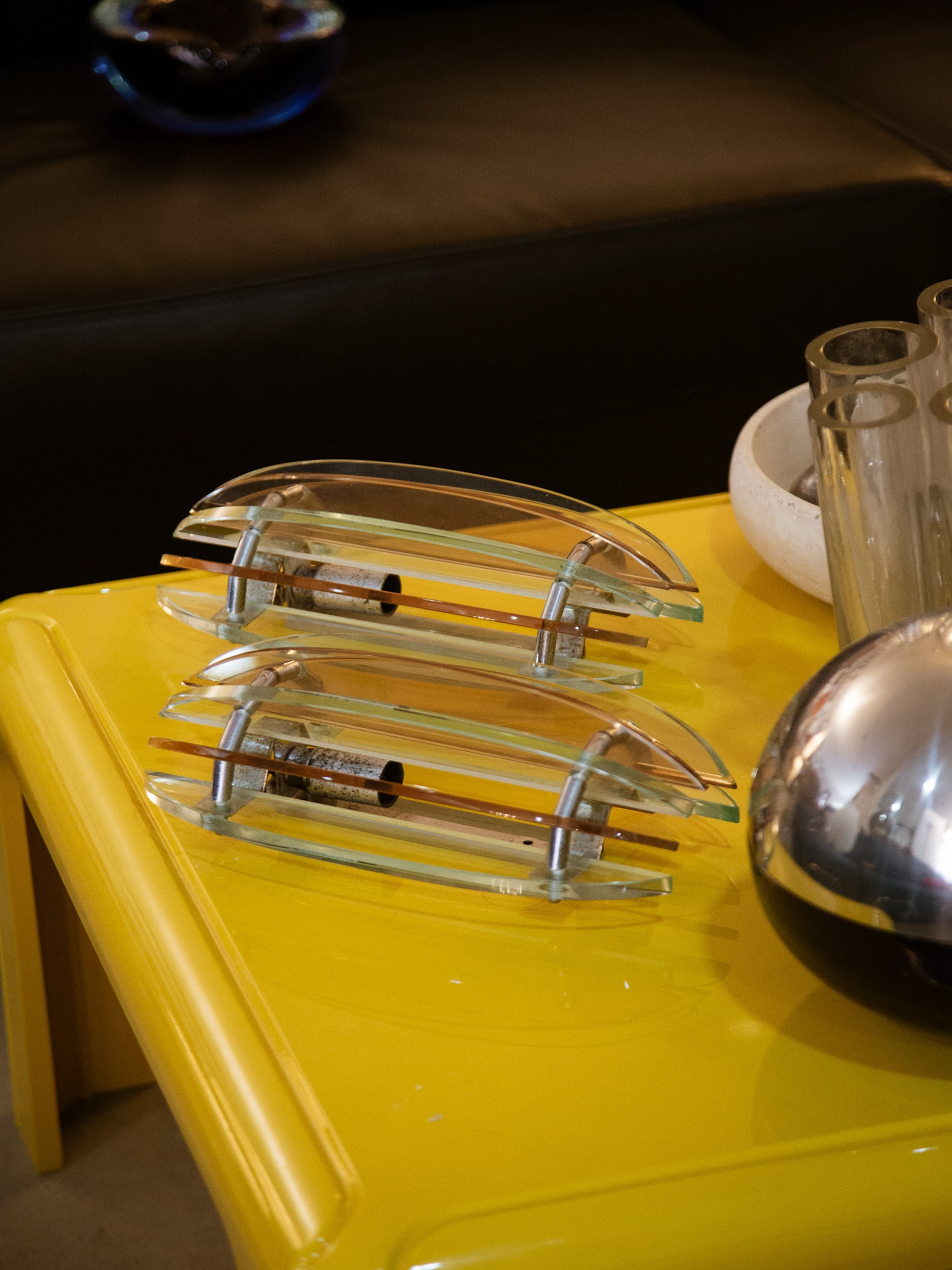 This complete bathroom set was produced by Fontana Arte in Italy during the 1970s, showcasing the brand’s mastery of glass, light, and modernist design. Rarely found as a full ensemble, the set includes a large illuminated mirror, wall sconces, wall-mounted accessories, and complementary glass fittings, making it a comprehensive interior solution for collectors of Italian modernism.