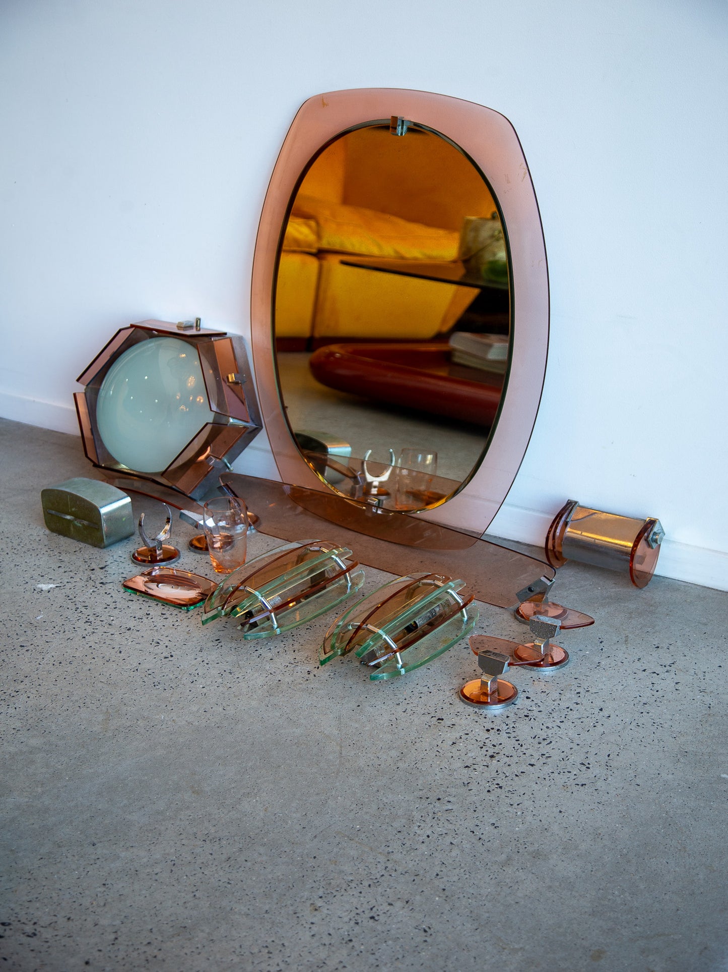The set features smoked pink and green glass panels combined with chrome details, creating a cohesive and futuristic aesthetic. The illuminated mirror acts as the centerpiece, radiating warm light, while the sconces and glass accessories enhance functionality without compromising style. This ensemble demonstrates how Fontana Arte extended its expertise beyond decorative lighting into complete interior environments.