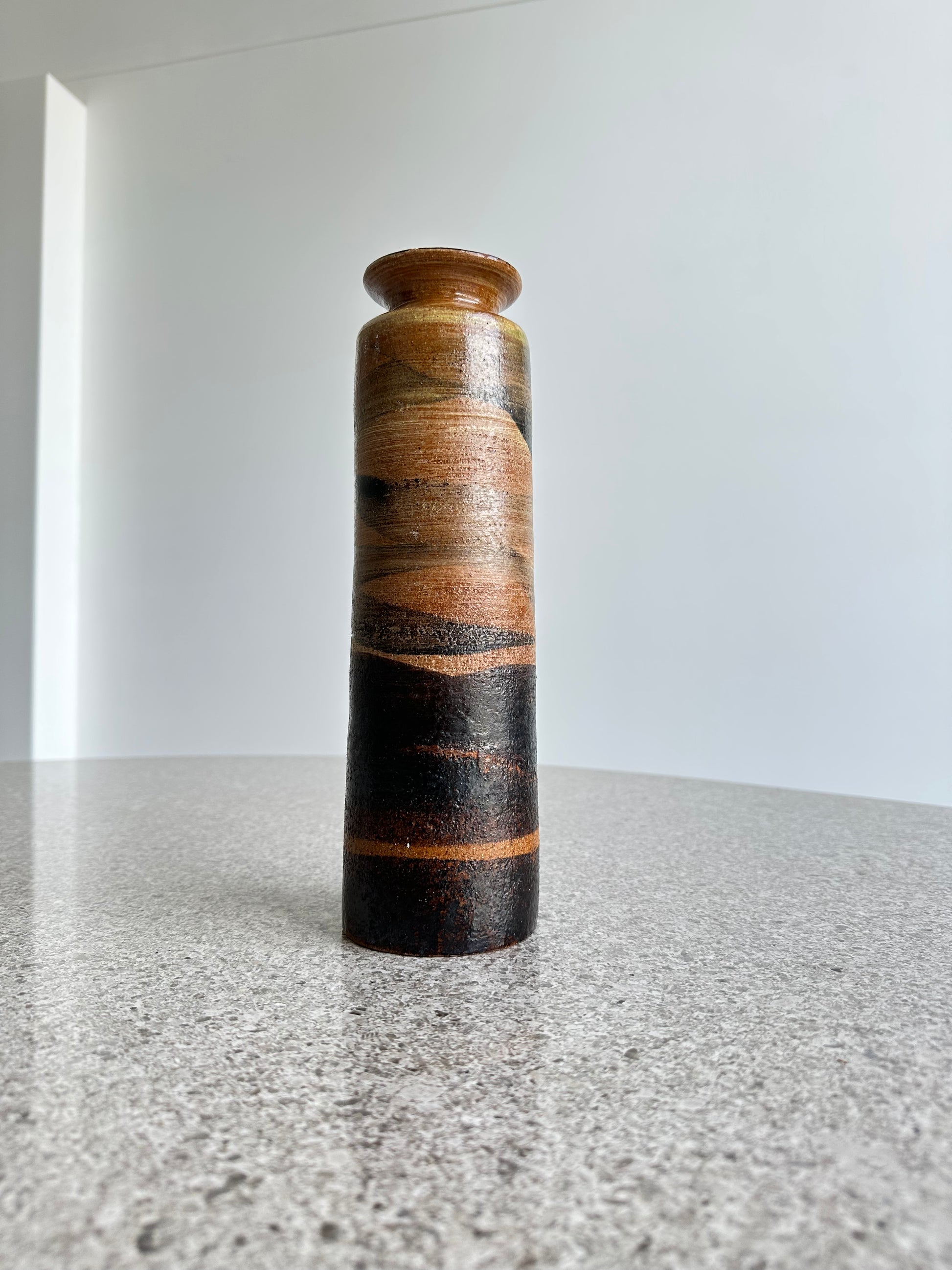 The vase’s cylindrical silhouette and subtle curvature give it a sculptural presence, perfect for display as a decorative object or flower vessel. Its warm palette and handcrafted finish make it an ideal accent for modern, wabi-sabi, or mid-century interiors.
