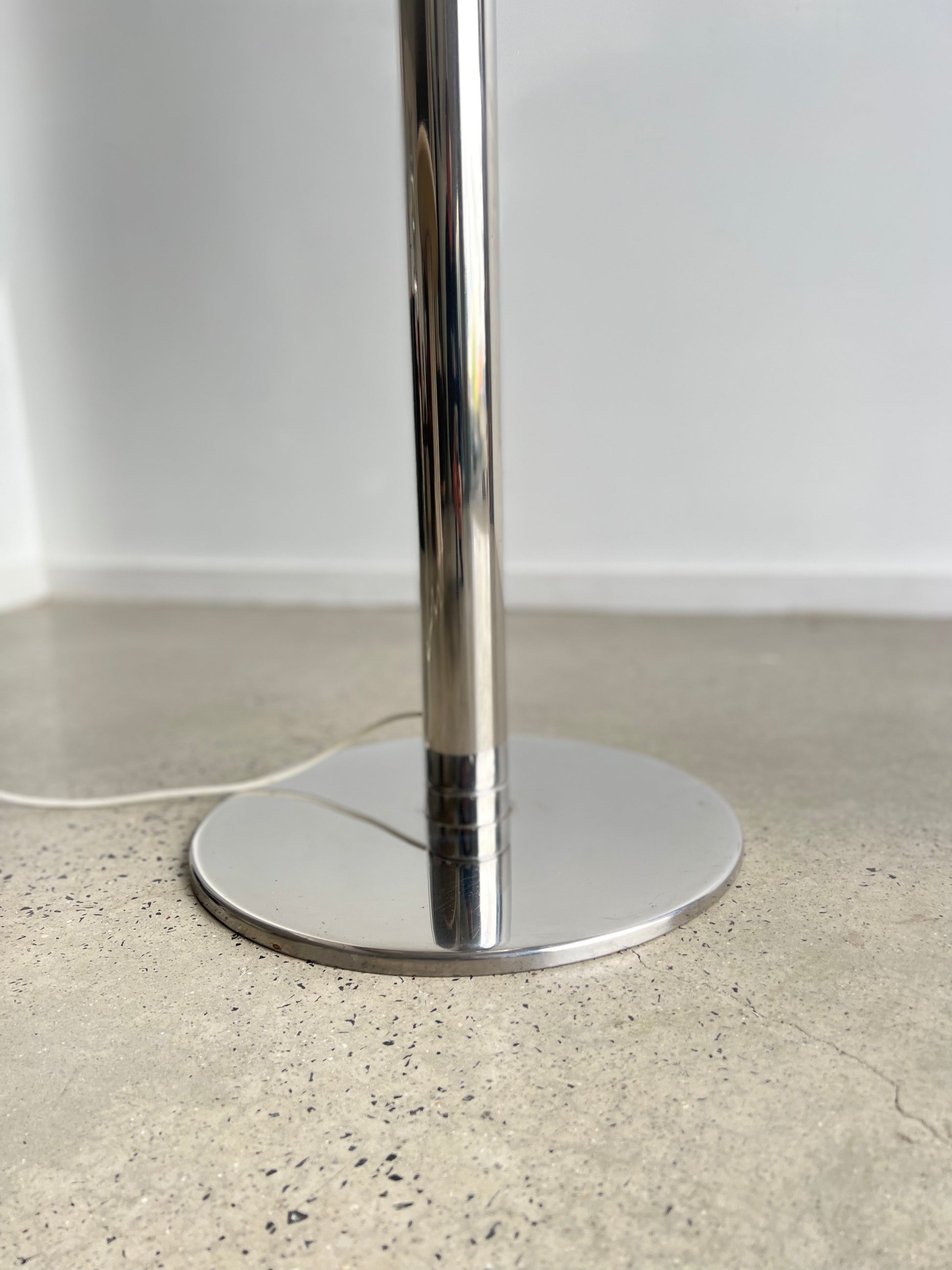 This glass sphere floor lamp designed by Pia Guidetti for Luci Milano in 1970 exemplifies the refined elegance of Italian mid-century modern lighting. The lamp features a large Murano opaline glass globe mounted on a polished chrome base, producing a soft, diffused glow that elevates any interior.