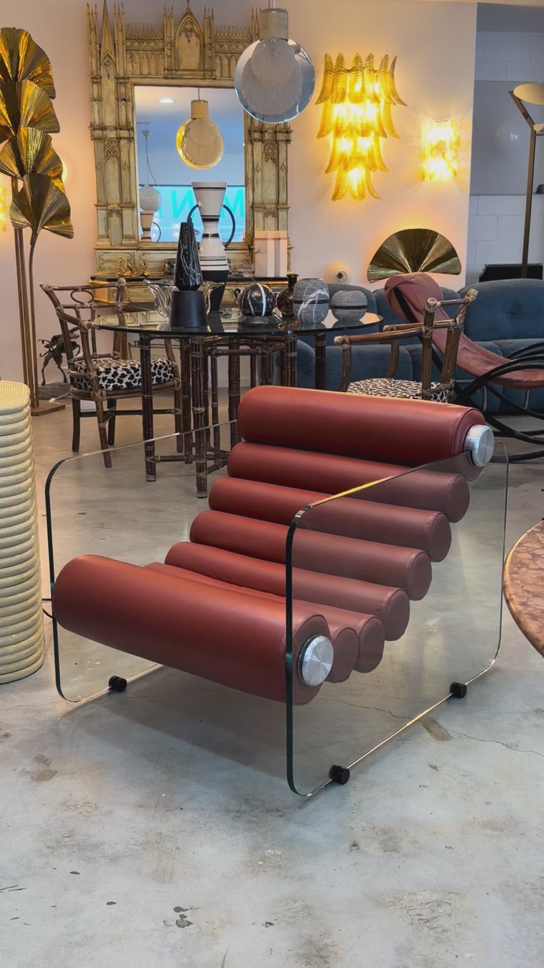 The interconnected black leather rolls are anchored at the base but remain adjustable at the top, sliding along the edge of the glass to alter the seating position. This creates a highly flexible structure, blending comfort with visual lightness. The contrast between the substantial leather bolsters and the transparent glass sides produces a floating effect, an illusion of suspension that defines the bold futuristic aesthetic of the era.