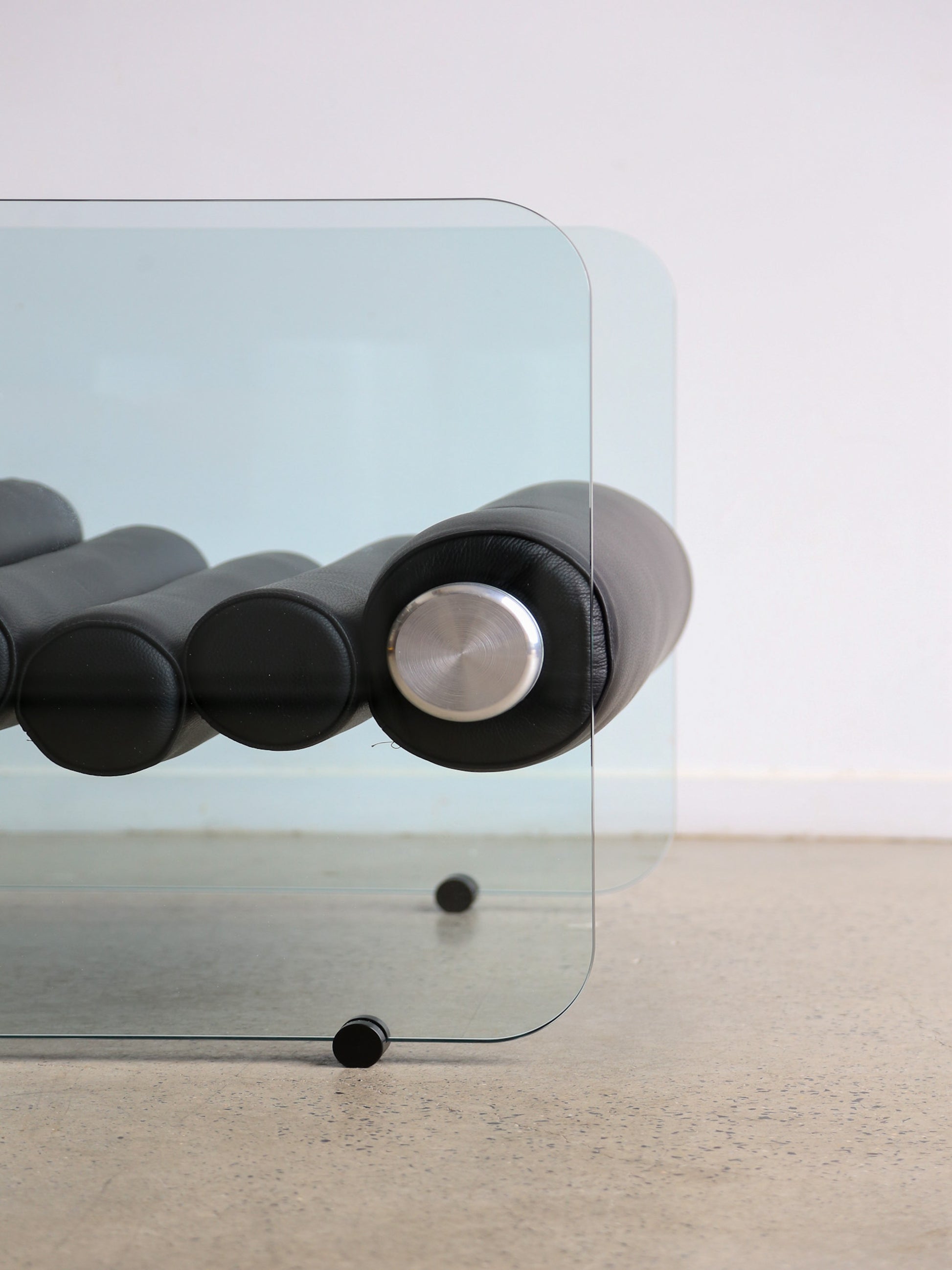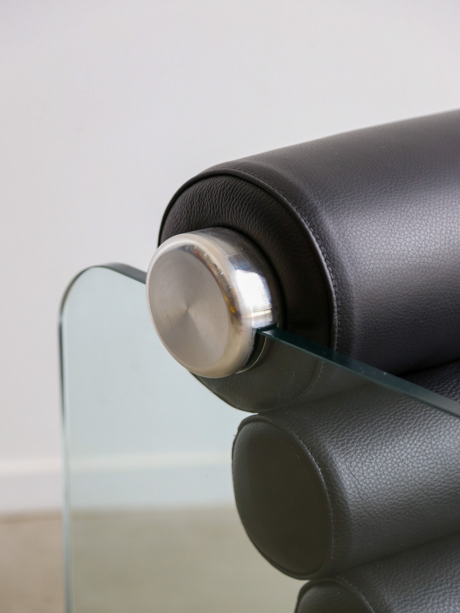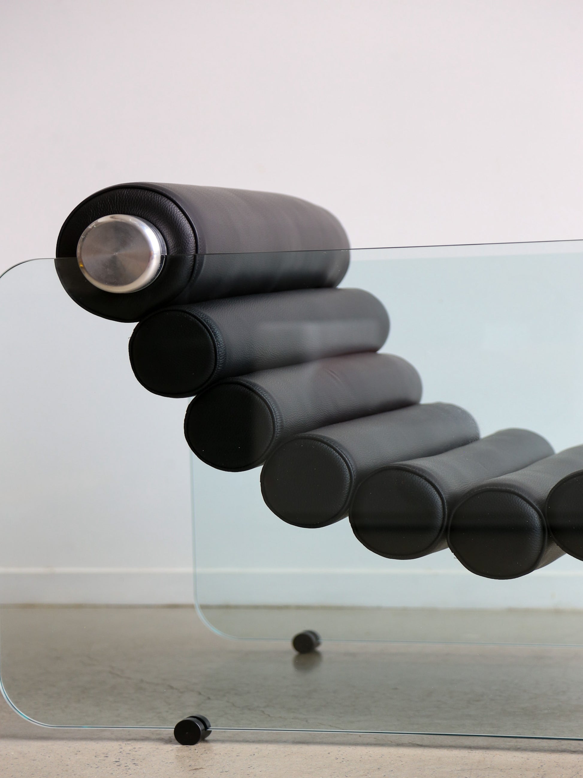 The interconnected black leather rolls are anchored at the base but remain adjustable at the top, sliding along the edge of the glass to alter the seating position. This creates a highly flexible structure, blending comfort with visual lightness. The contrast between the substantial leather bolsters and the transparent glass sides produces a floating effect, an illusion of suspension that defines the bold futuristic aesthetic of the era.