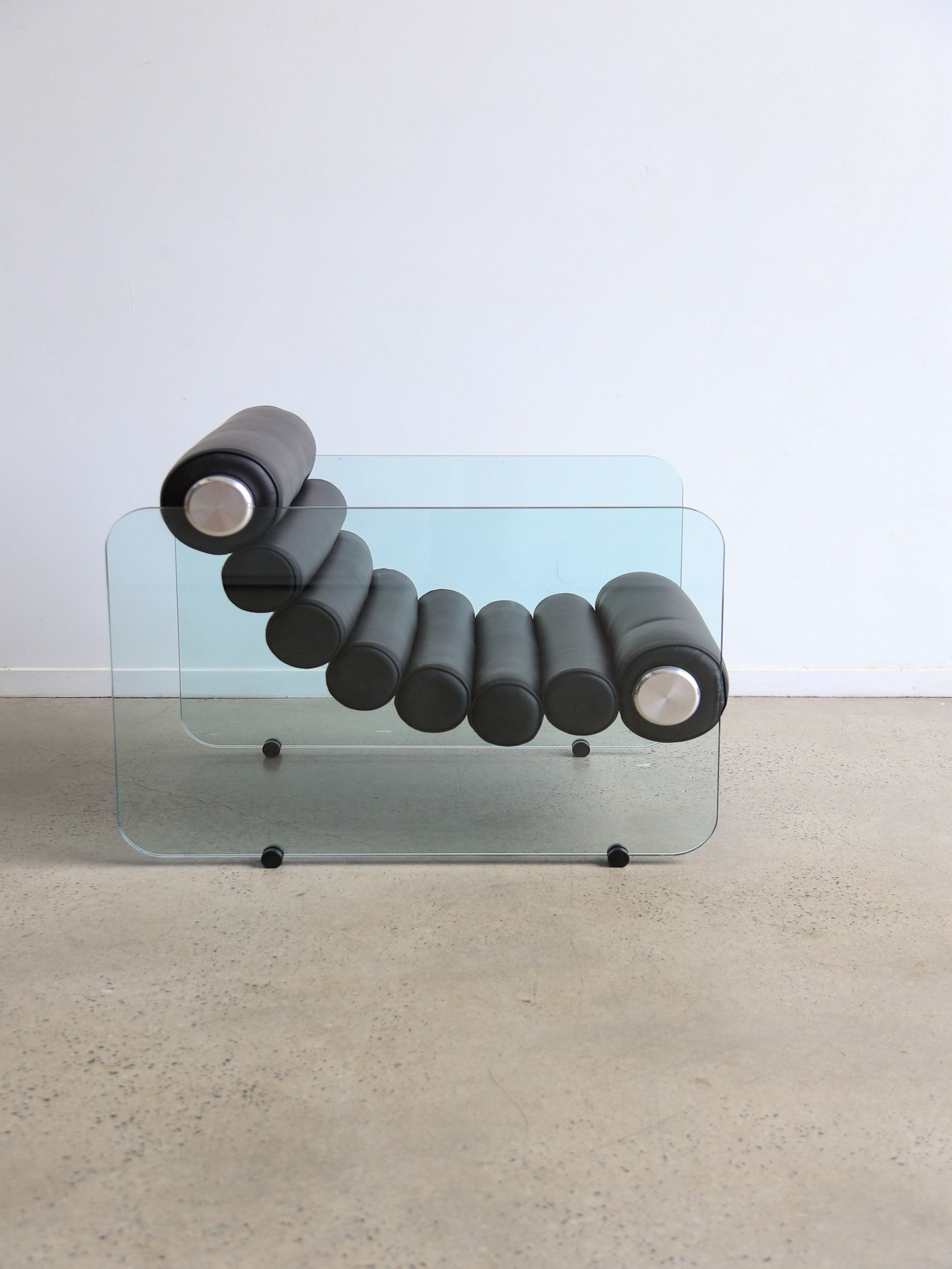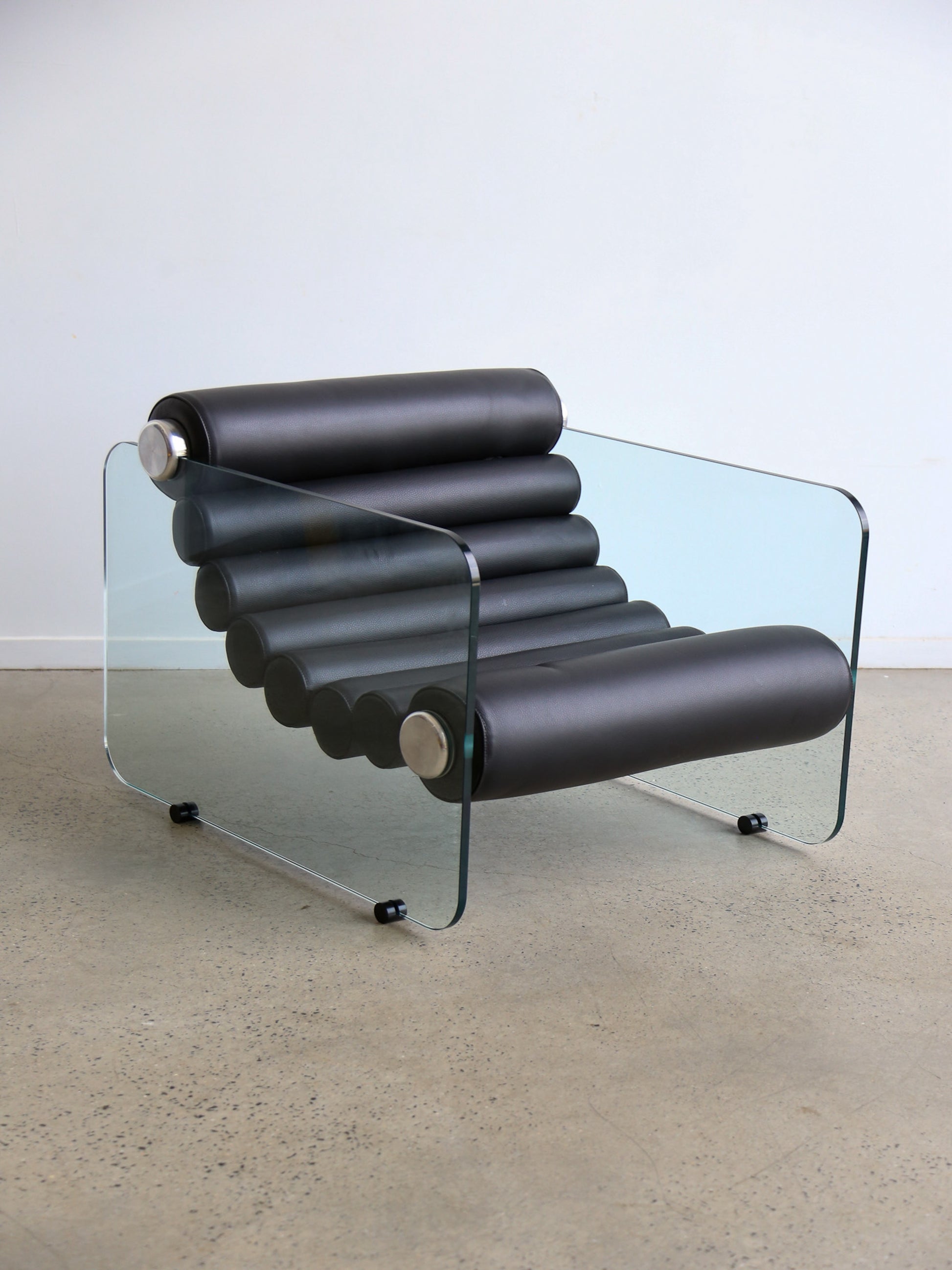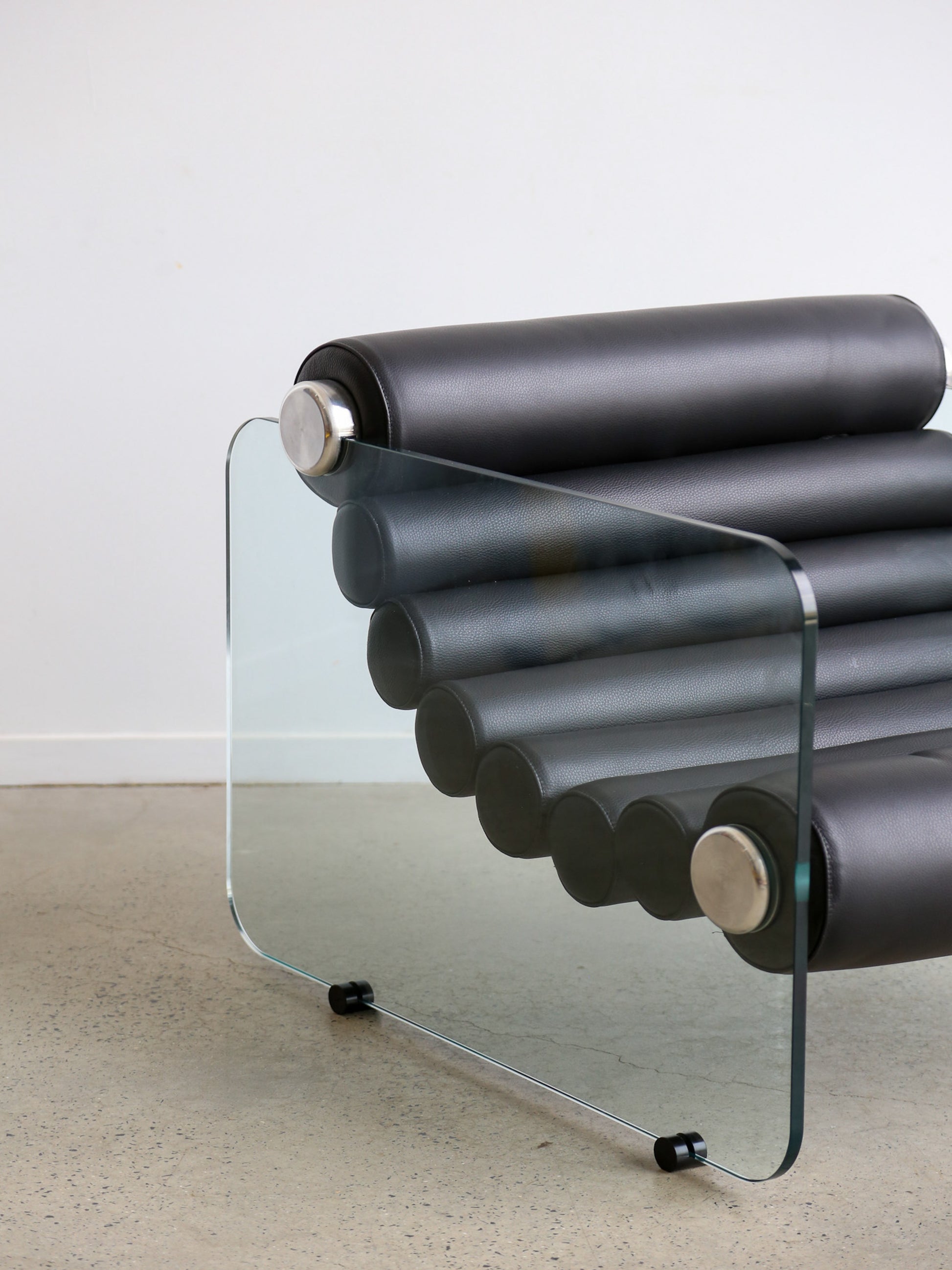 The interconnected black leather rolls are anchored at the base but remain adjustable at the top, sliding along the edge of the glass to alter the seating position. This creates a highly flexible structure, blending comfort with visual lightness. The contrast between the substantial leather bolsters and the transparent glass sides produces a floating effect, an illusion of suspension that defines the bold futuristic aesthetic of the era.