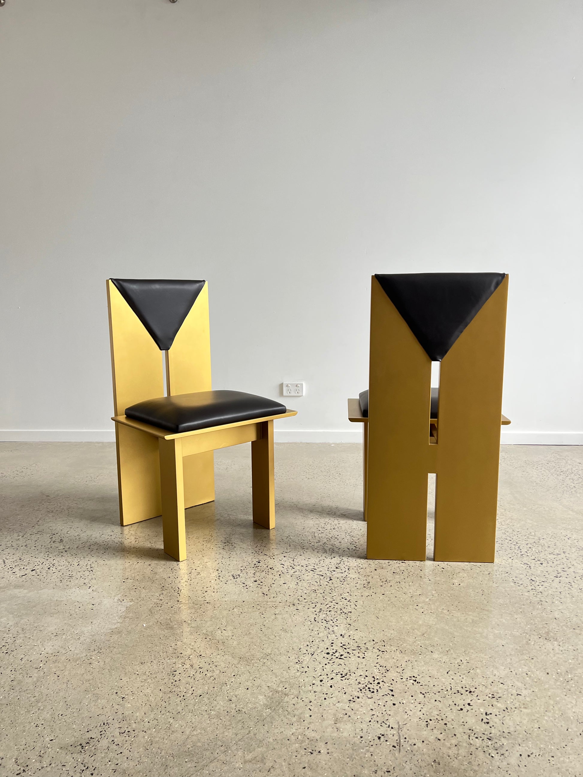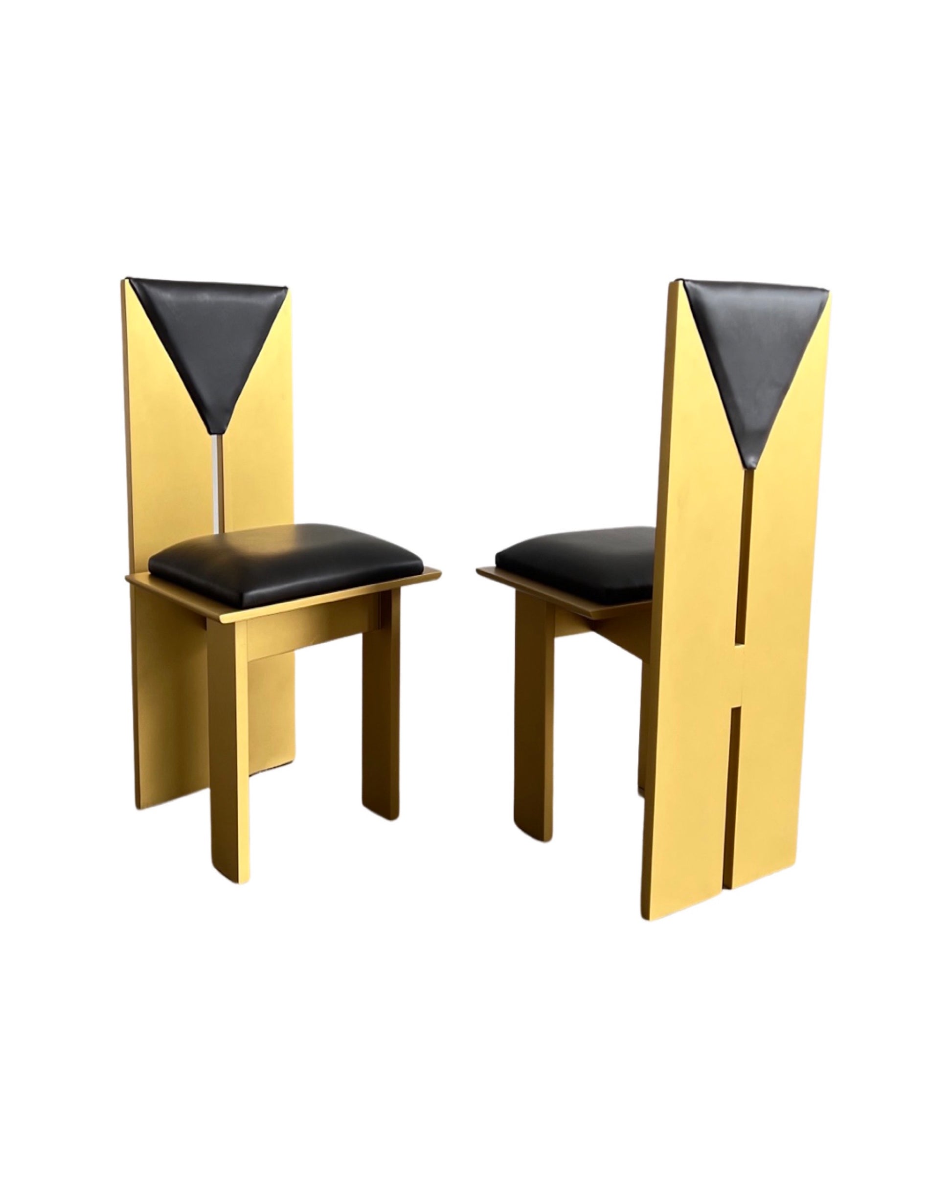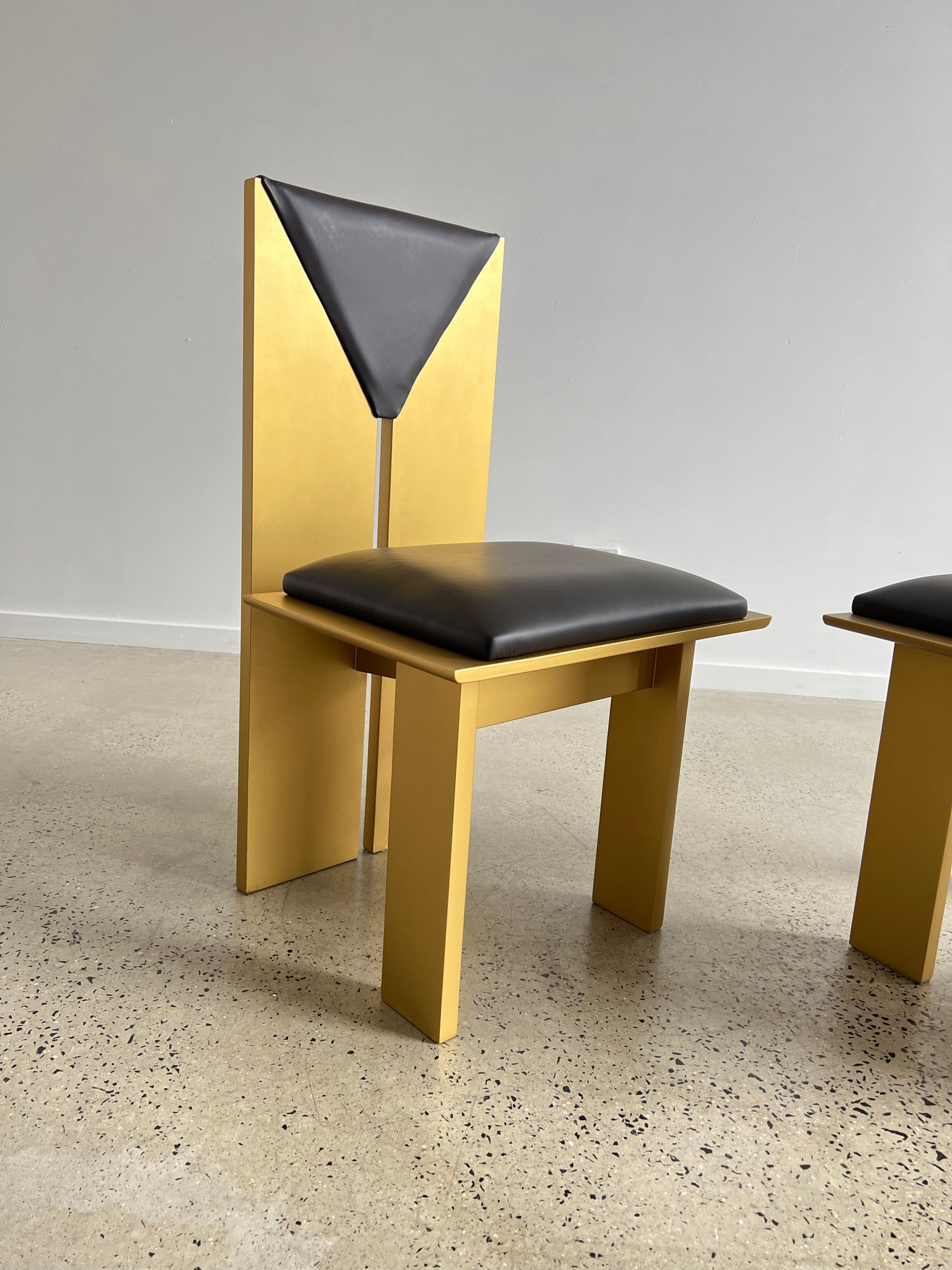 The pair of Italian dining chairs from the 1980s are a striking example of Art Deco design. The chairs feature a bold and geometric design, with a unique combination of materials that creates a luxurious and sophisticated look. The gold lacquered wood frame provides a warm and elegant touch, while the black leather upholstery adds a sense of refinement and comfort.