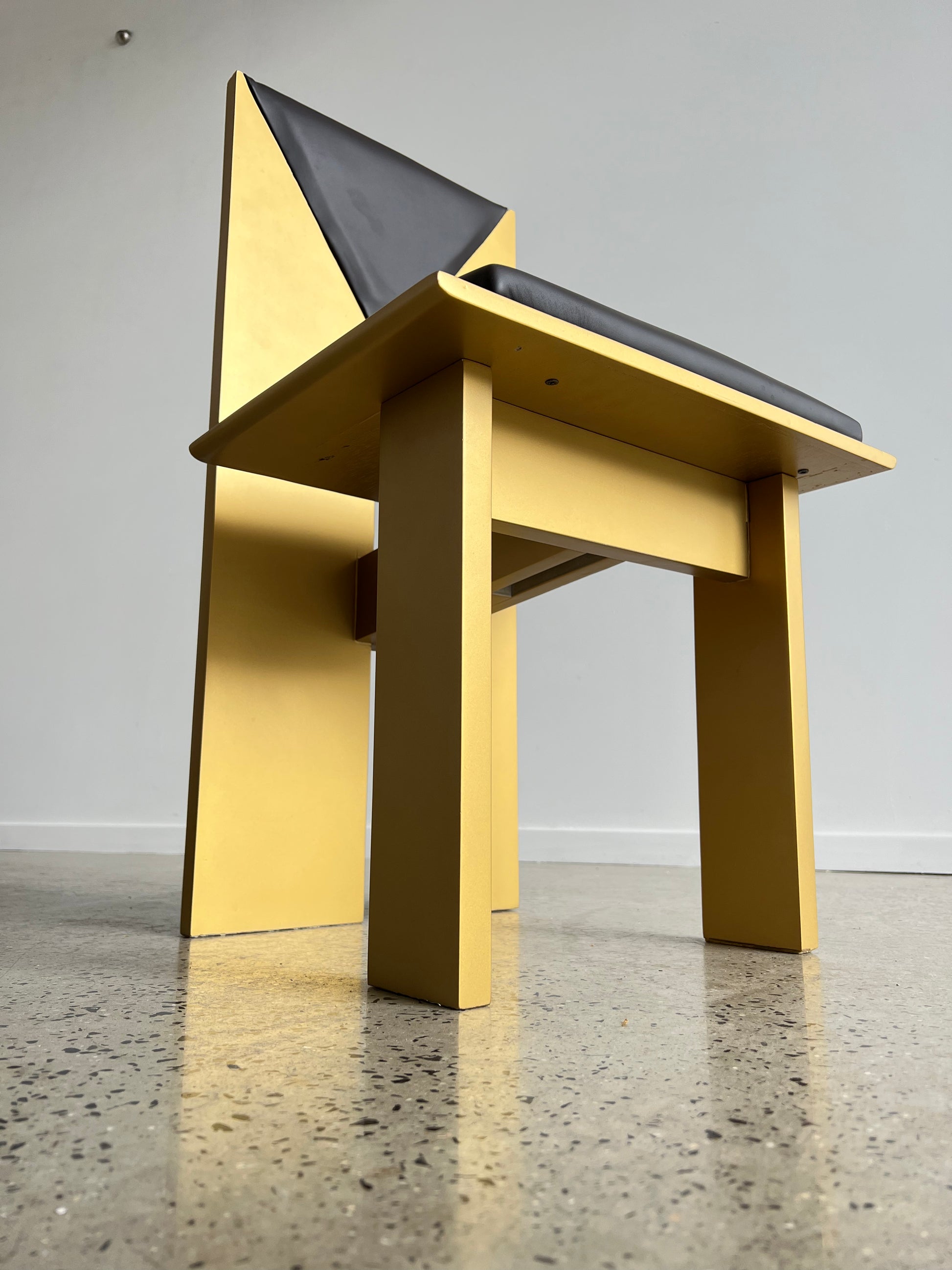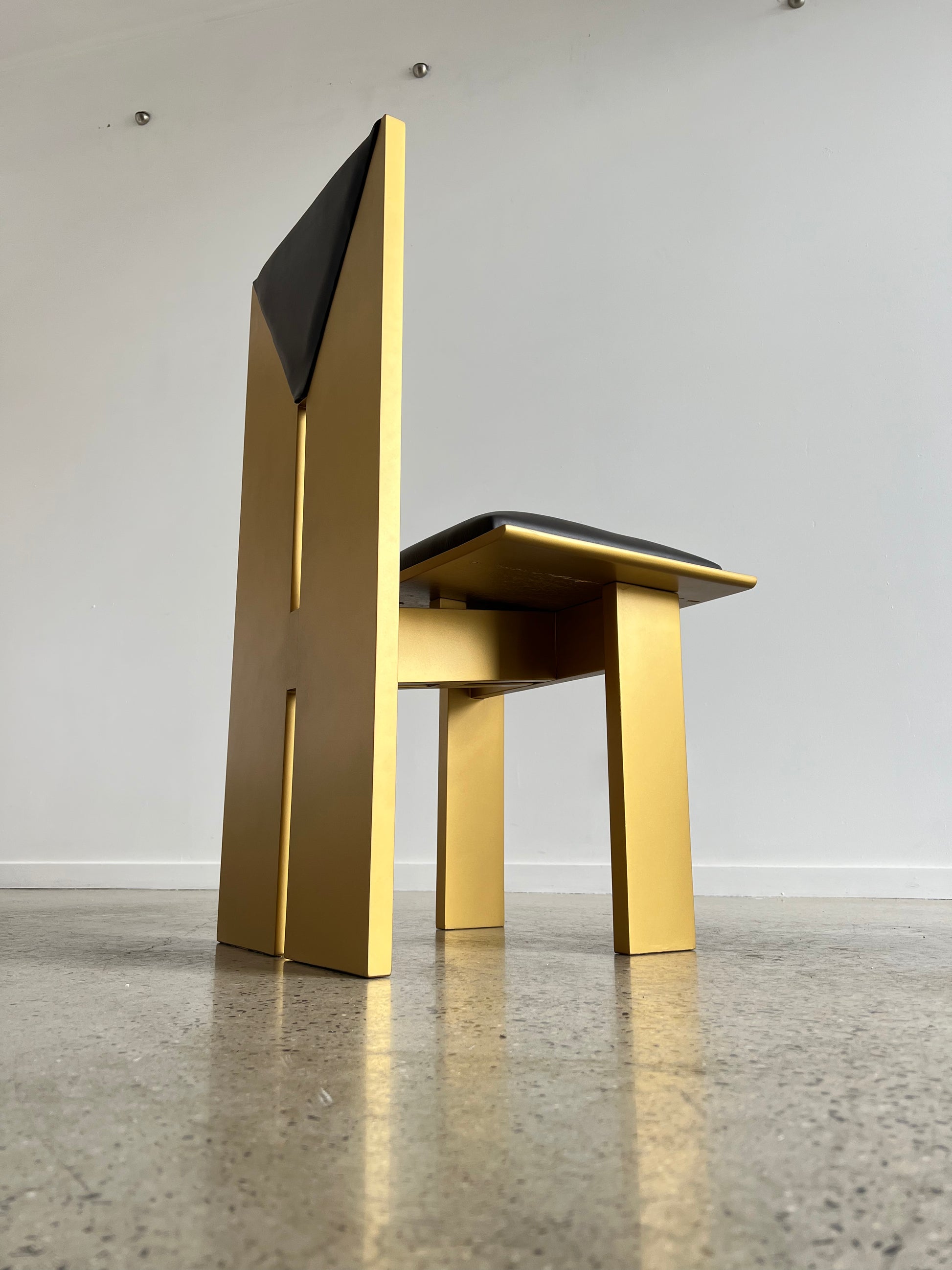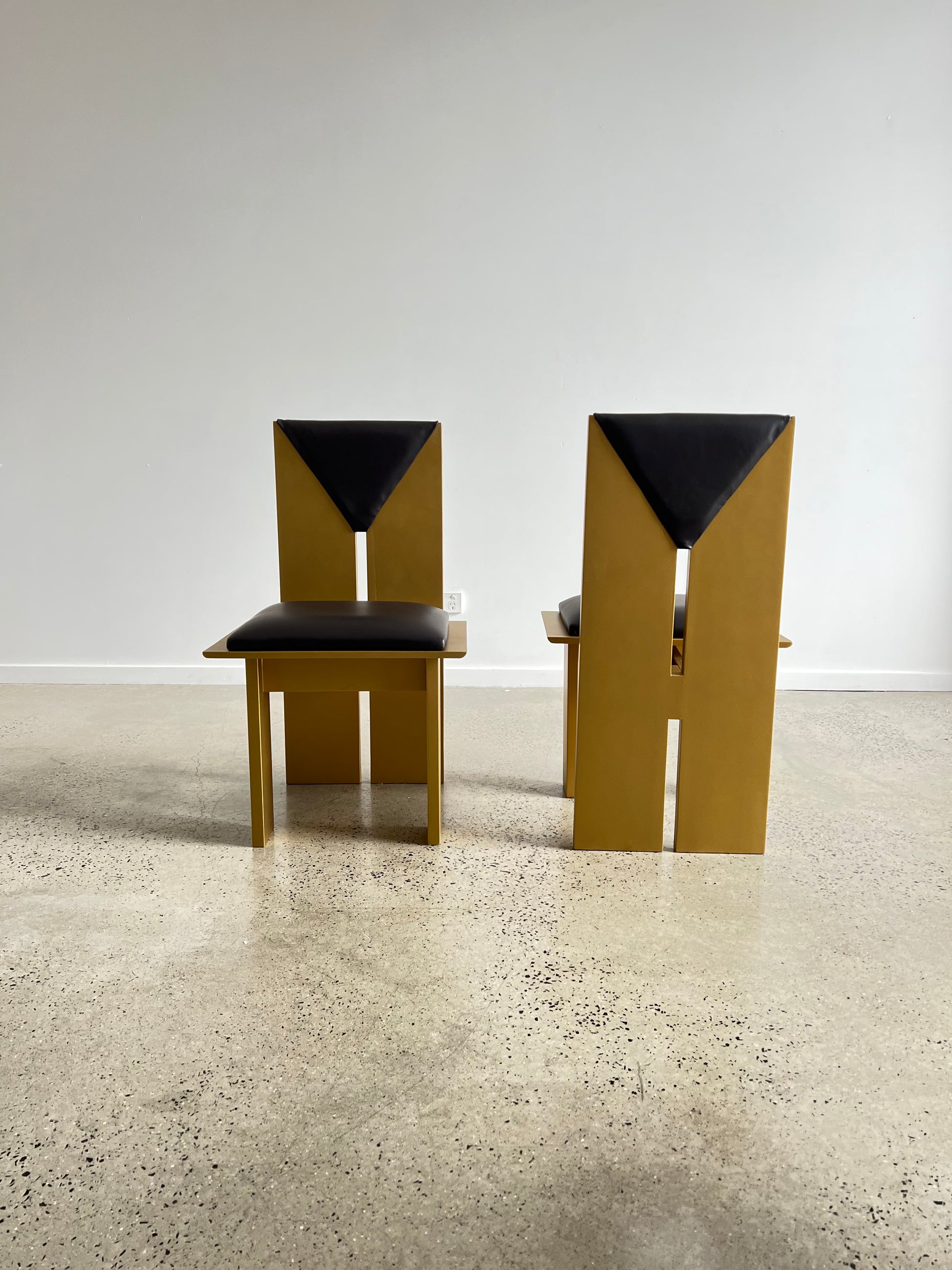 The pair of Italian dining chairs from the 1980s are a striking example of Art Deco design. The chairs feature a bold and geometric design, with a unique combination of materials that creates a luxurious and sophisticated look. The gold lacquered wood frame provides a warm and elegant touch, while the black leather upholstery adds a sense of refinement and comfort.