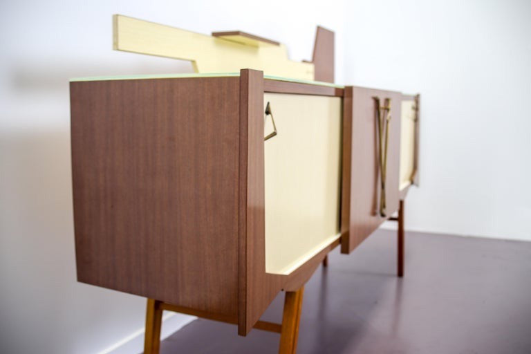 The sideboard’s clean lines, asymmetrical structure, and mix of wood, glass, and brass highlight the creative Italian approach to mid-century modern design. Its functional layout offers both storage and entertainment value, with the illuminated bar area doubling as a conversation piece.