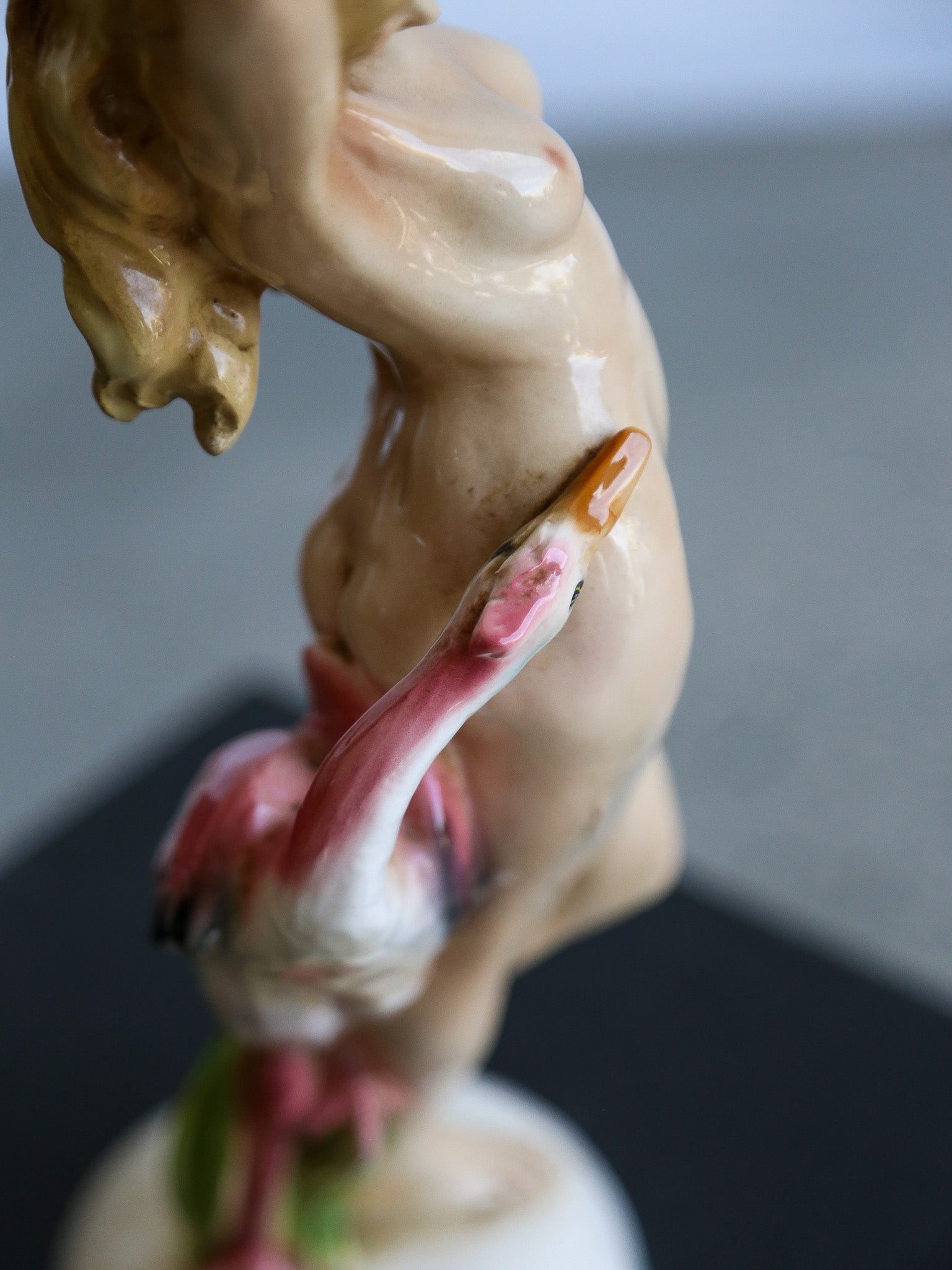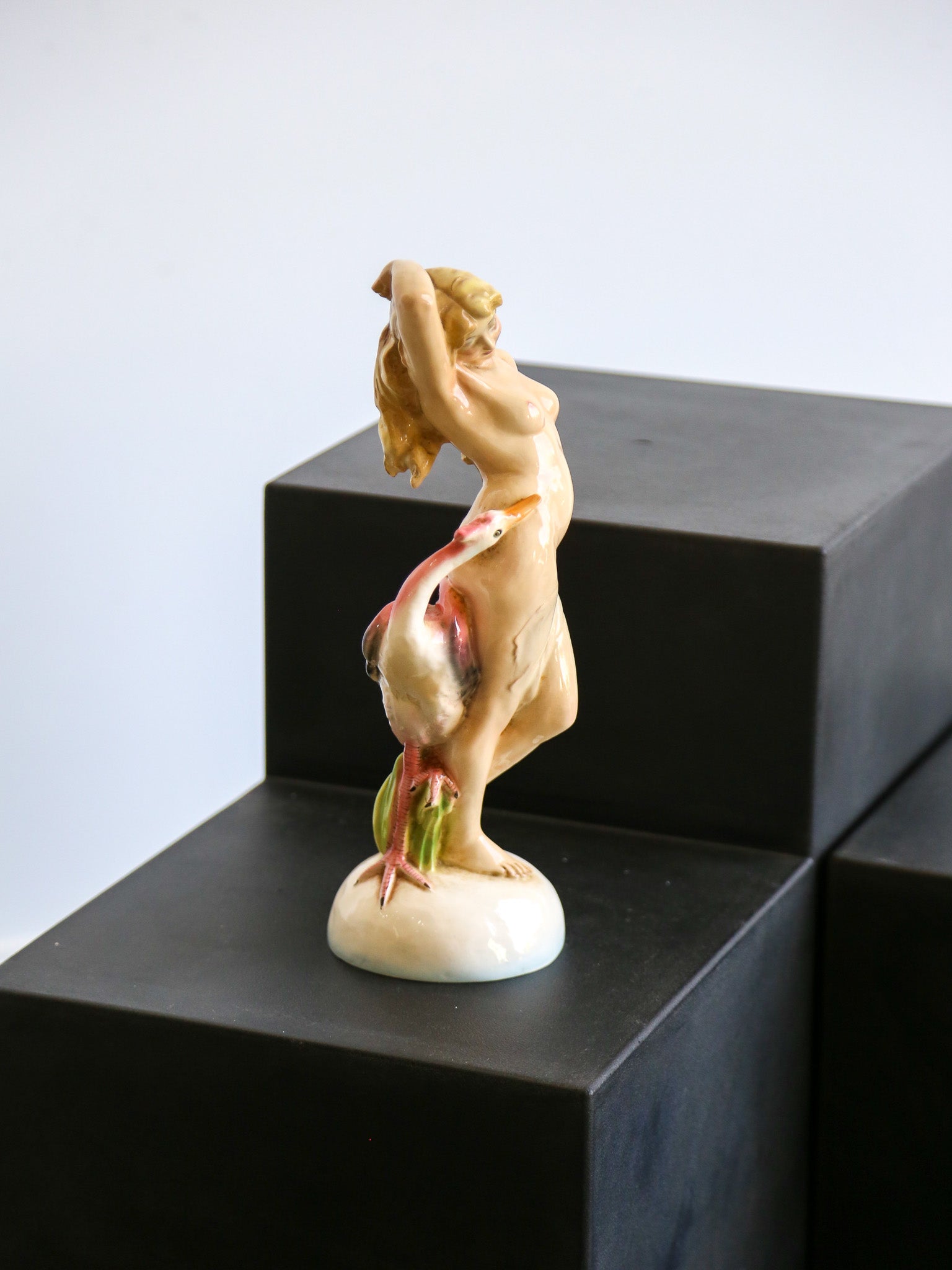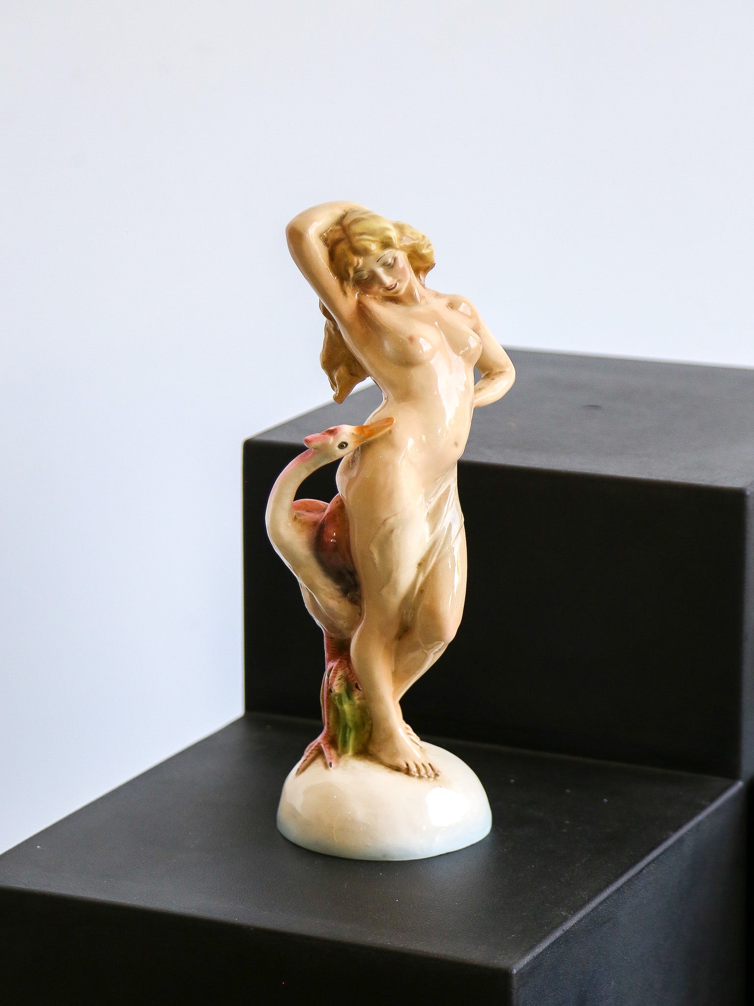 This Italian hand-painted ceramic sculpture from the 1950s beautifully captures the sensual elegance and craftsmanship of Mid-Century Modern Italian artistry. The piece depicts a graceful nude female figureaccompanied by a crane, symbolising beauty and harmony. Its delicate hand-painted glaze brings warmth and movement to the soft pastel tones, creating a refined decorative object full of expression and charm.