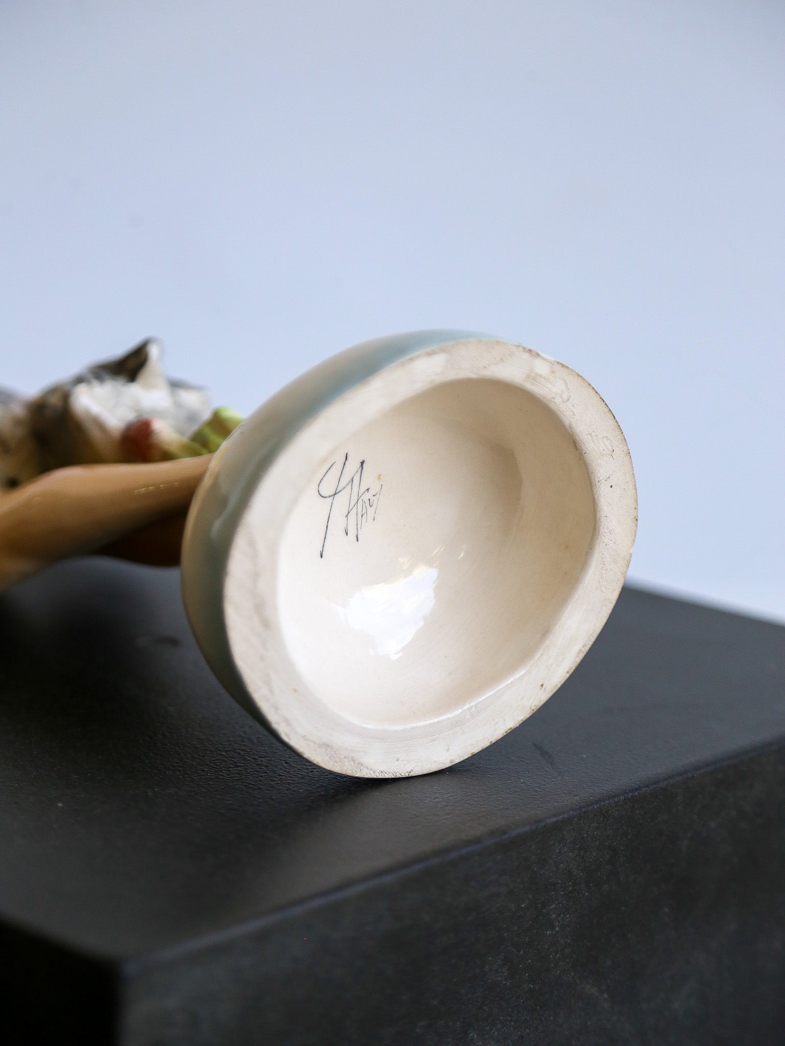 Carefully modelled with refined contours and expressive posture, the sculpture reflects the postwar Italian fascination with organic form and human expression. The smooth ceramic surface enhances the tactile appeal of the piece, while the soft glaze tones—creamy ivory, blush pink, and muted greens—imbue it with timeless allure.