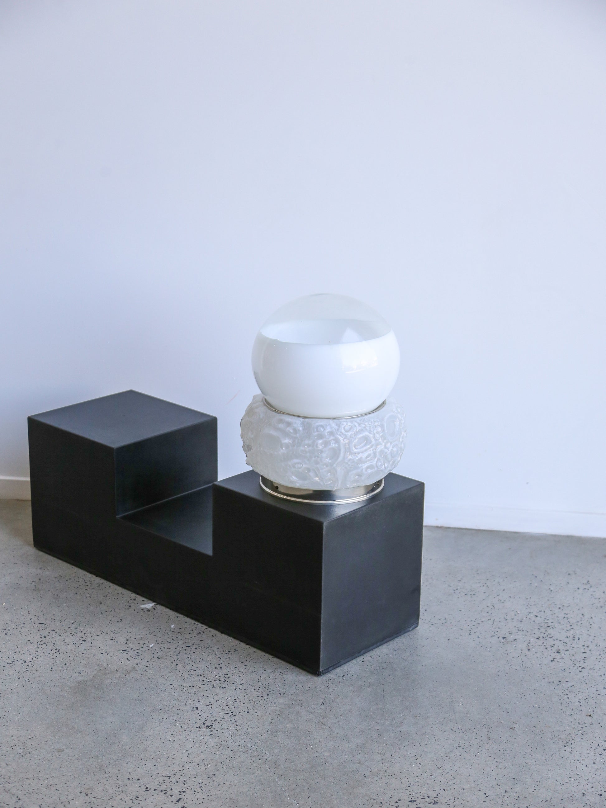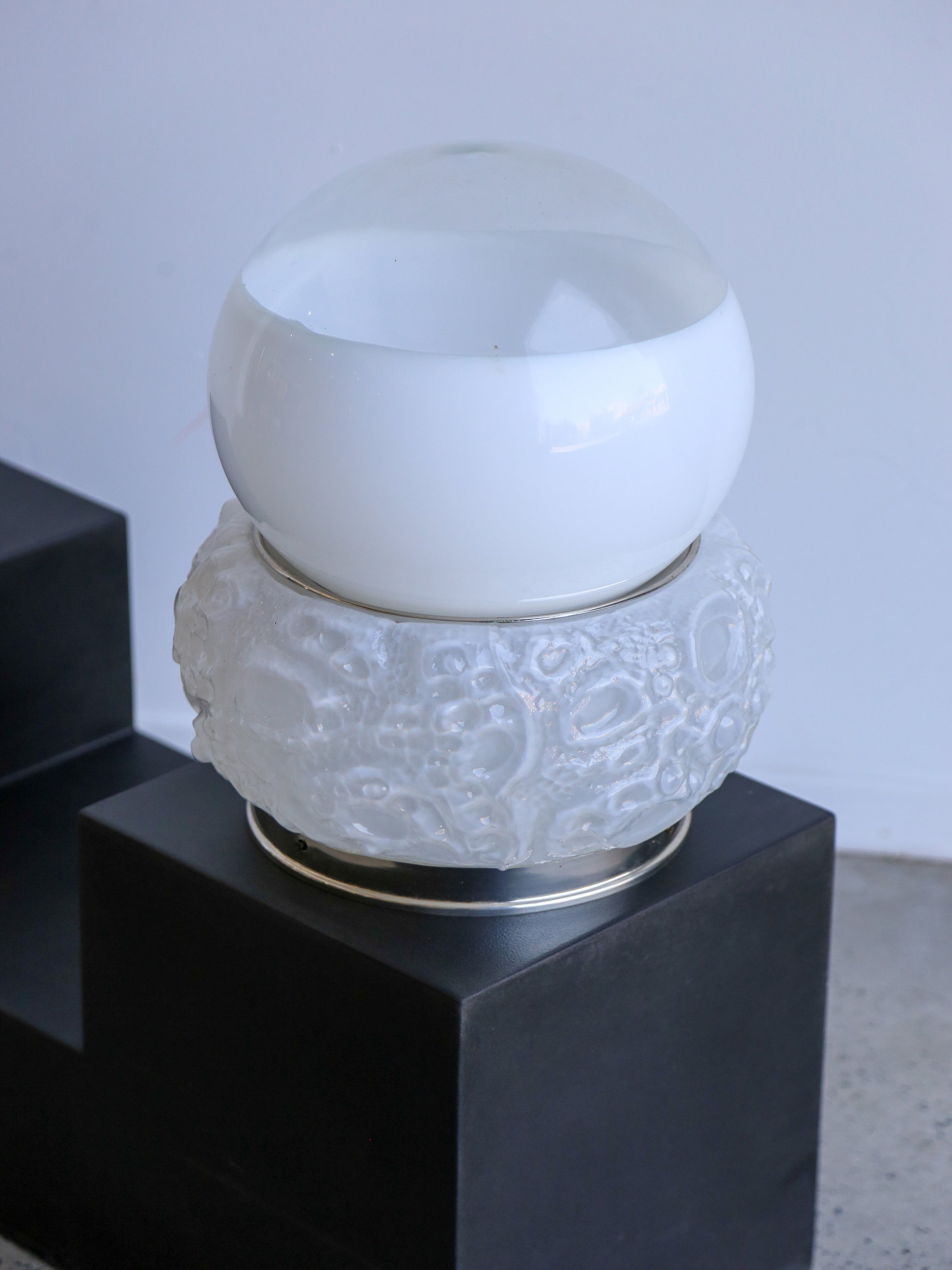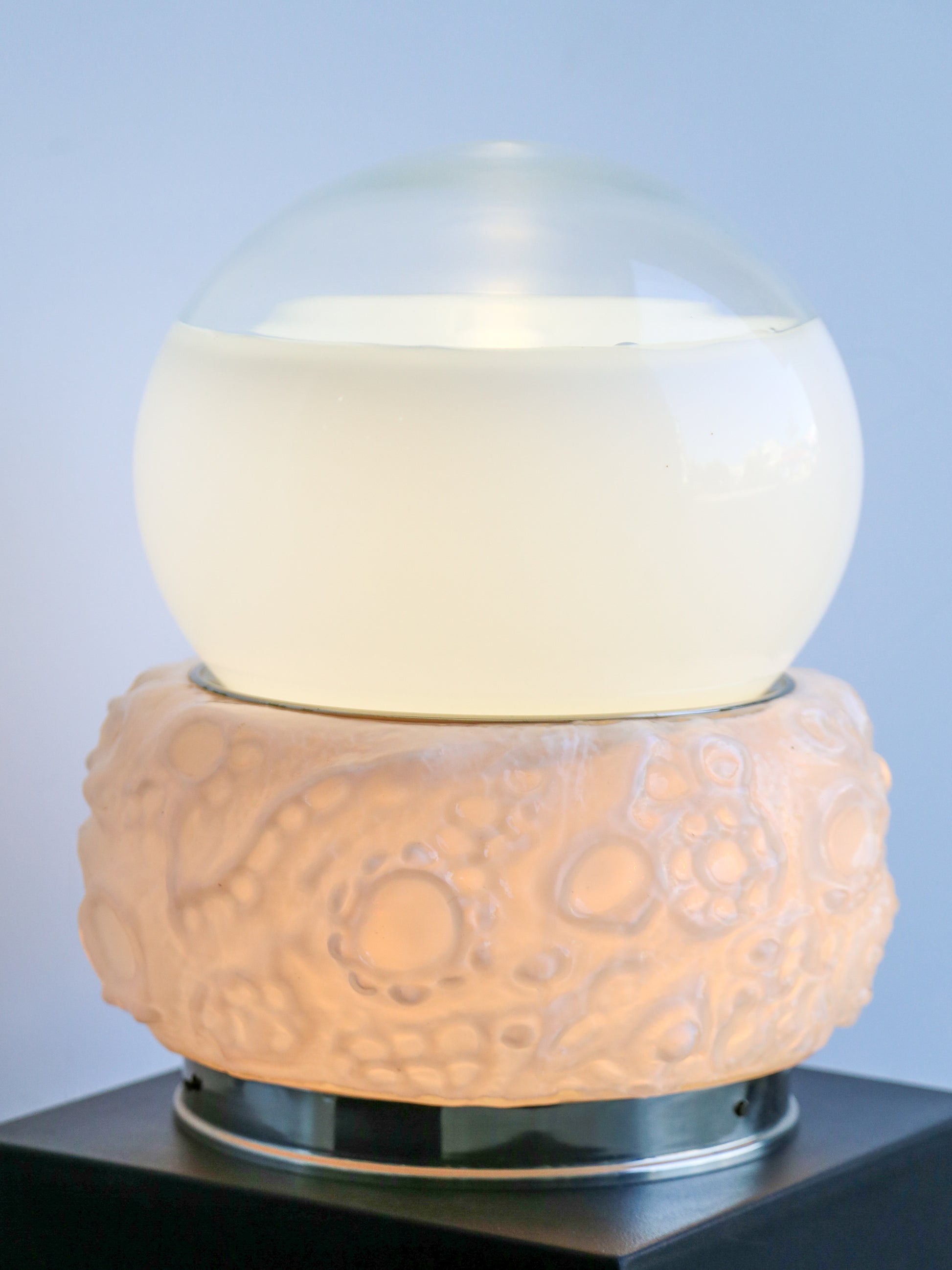 The lamp’s base features cratered details reminiscent of lunar surfaces, hand-crafted in Murano glass with subtle variations that emphasize its artisanal quality. The frosted glass globe diffuser provides a warm, even light, adding atmosphere to any space.