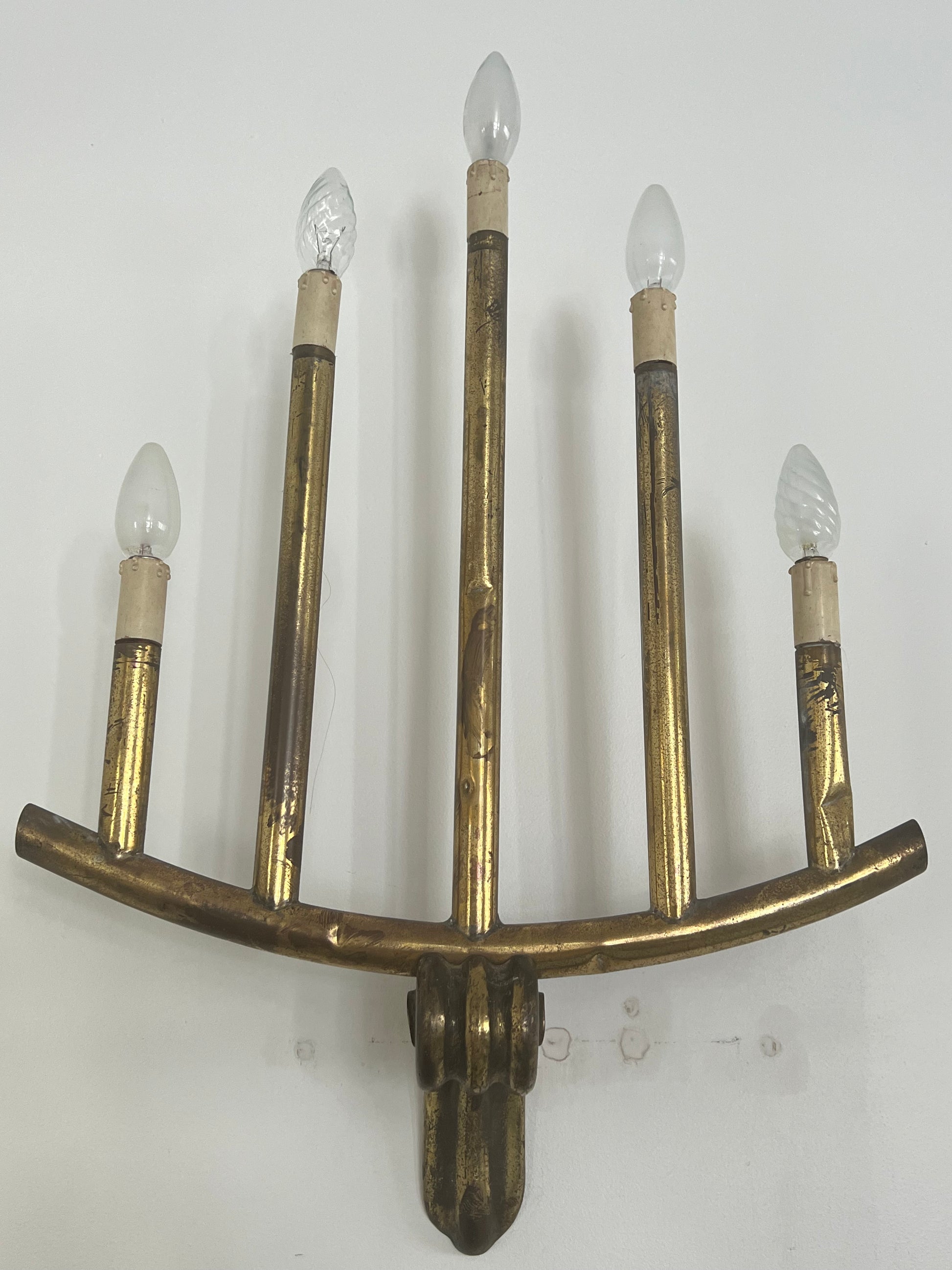 Crafted in hand-worked brass, the sconce features five elongated arms that rise gracefully to hold light bulbs, creating a dramatic upward rhythm. The curved base adds balance, highlighting the piece’s bold and geometric silhouette.