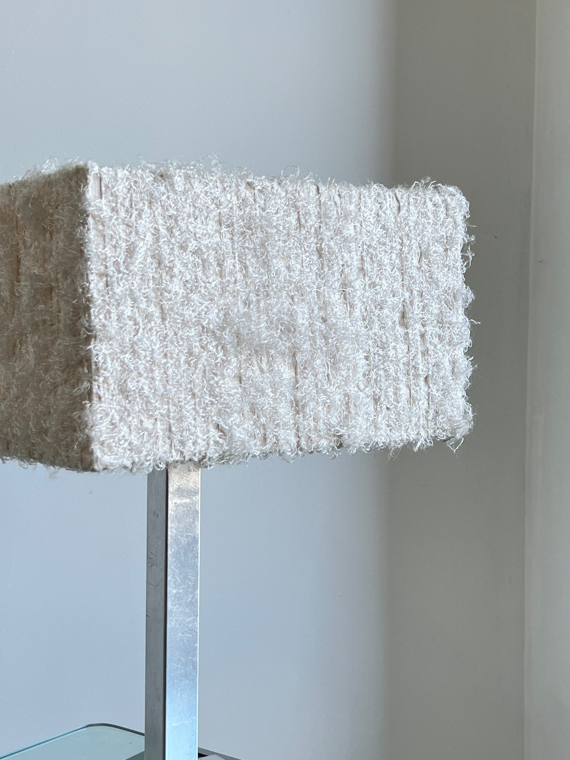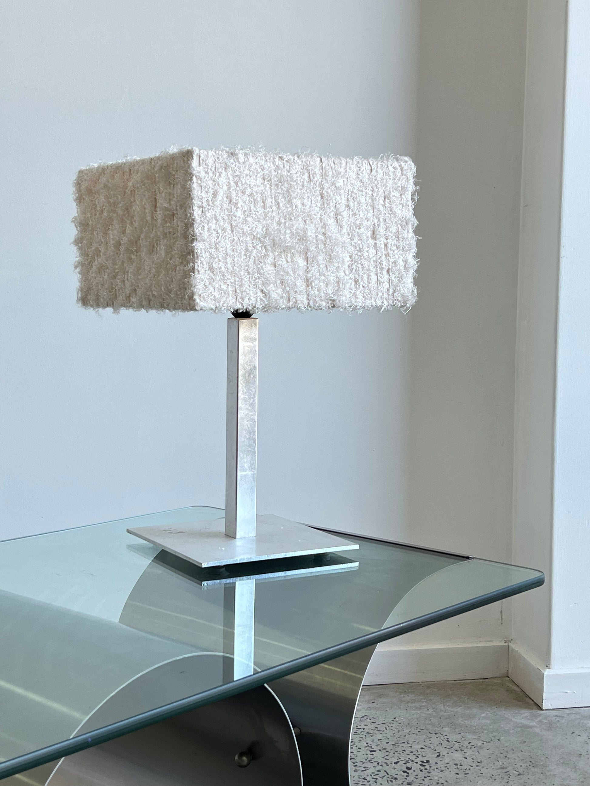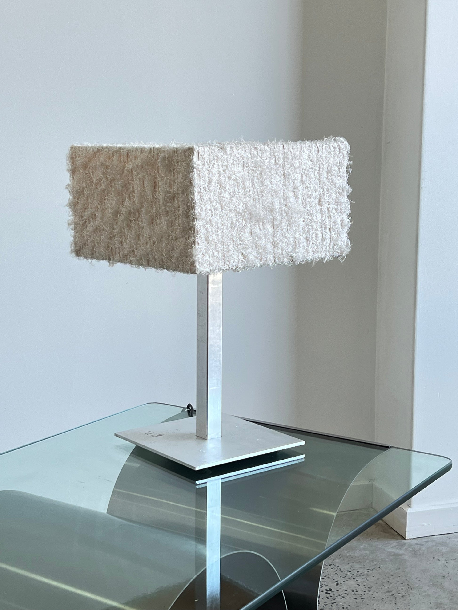 The square-shaped shade is made from a synthetic material that has a fluffy and textured appearance. This creates a unique and visually appealing look that is both modern and elegant. The lamp's square shape also adds to its overall contemporary design and makes it a standout piece of lighting.