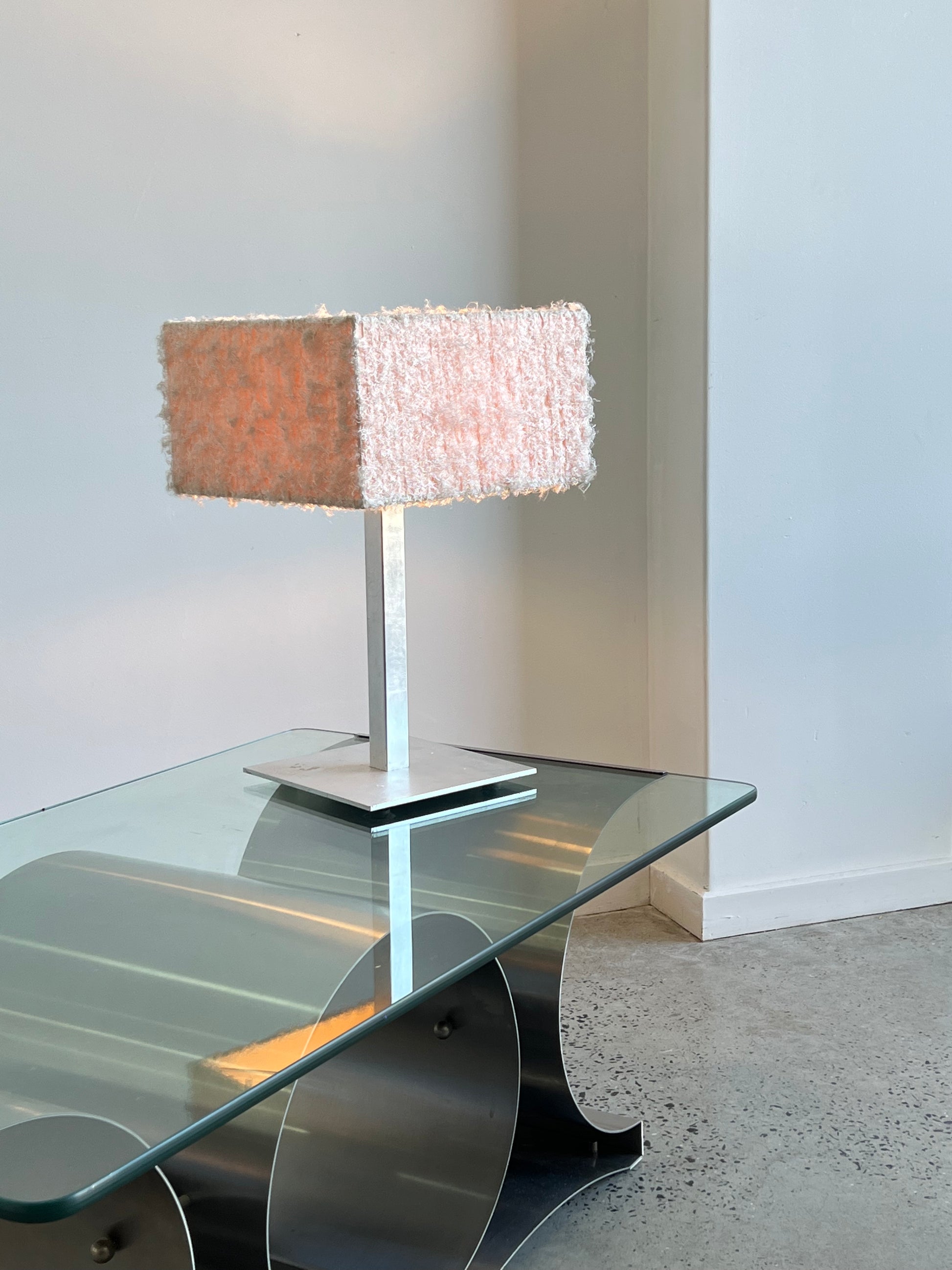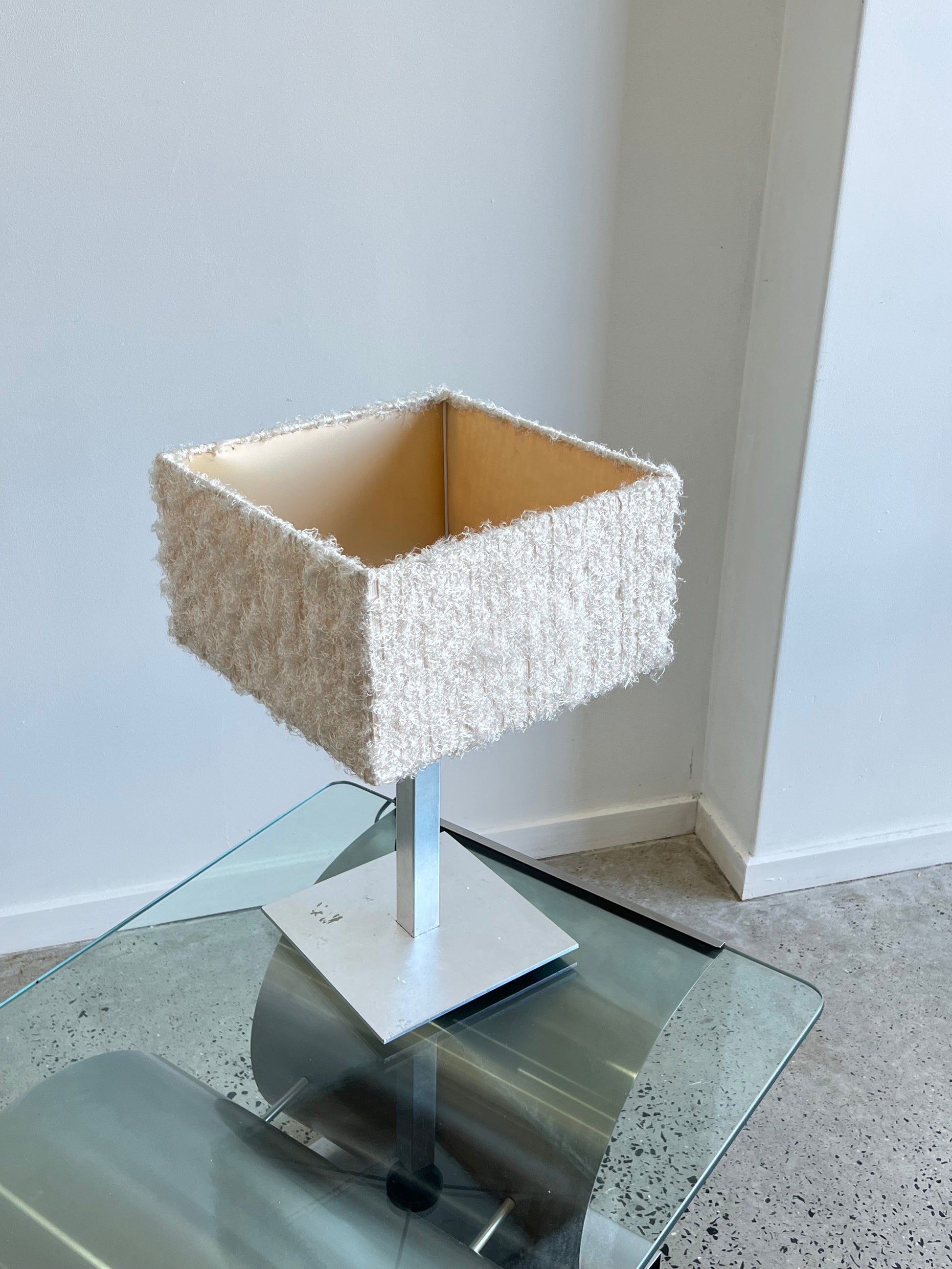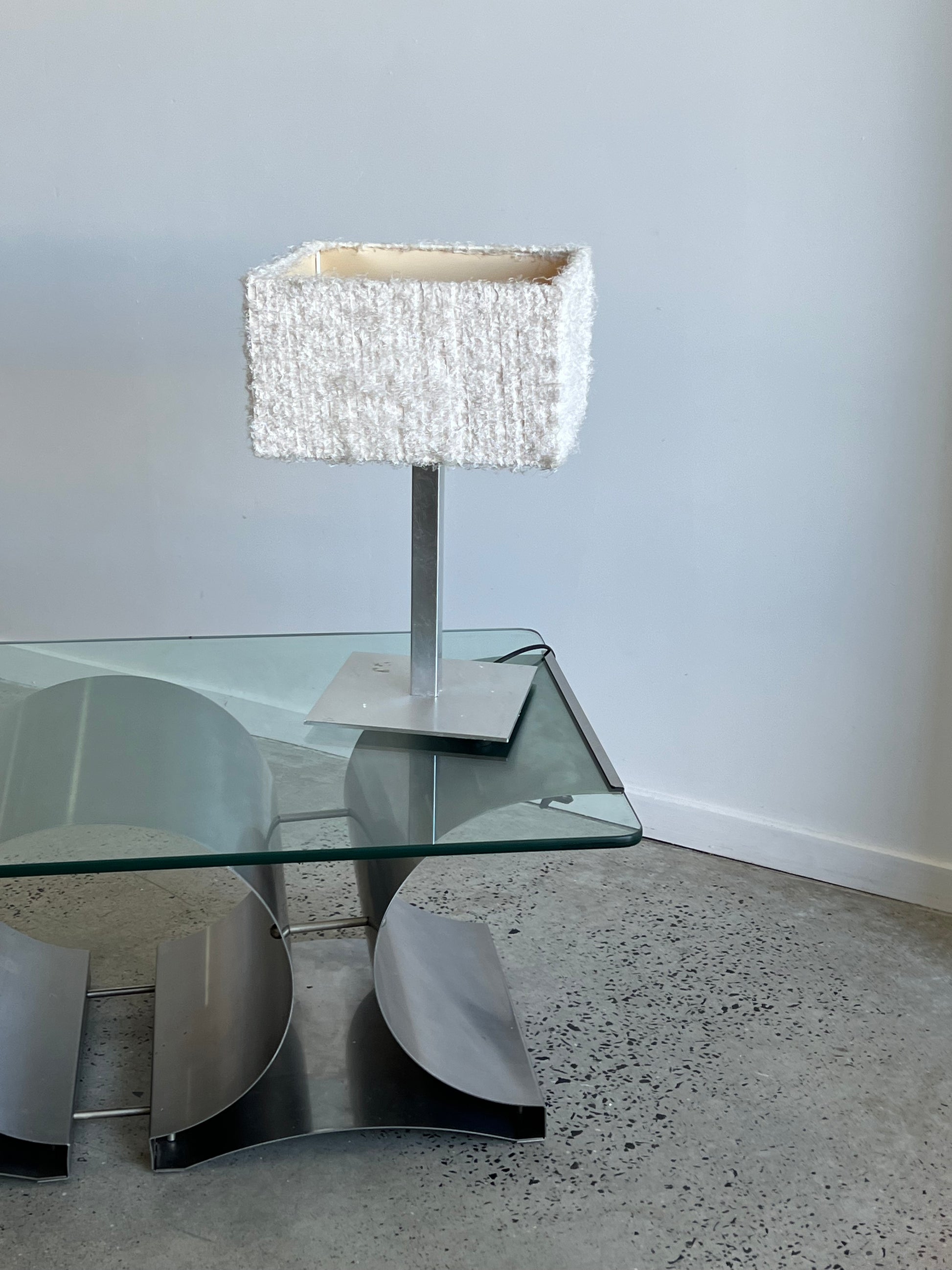 This Italian Square 1980s Steel Base Table Lamp is a unique and stylish piece of vintage lighting that is perfect for adding a touch of sophistication to any interior space. The lamp features a sturdy steel base that provides a stable and secure foundation for the lamp.