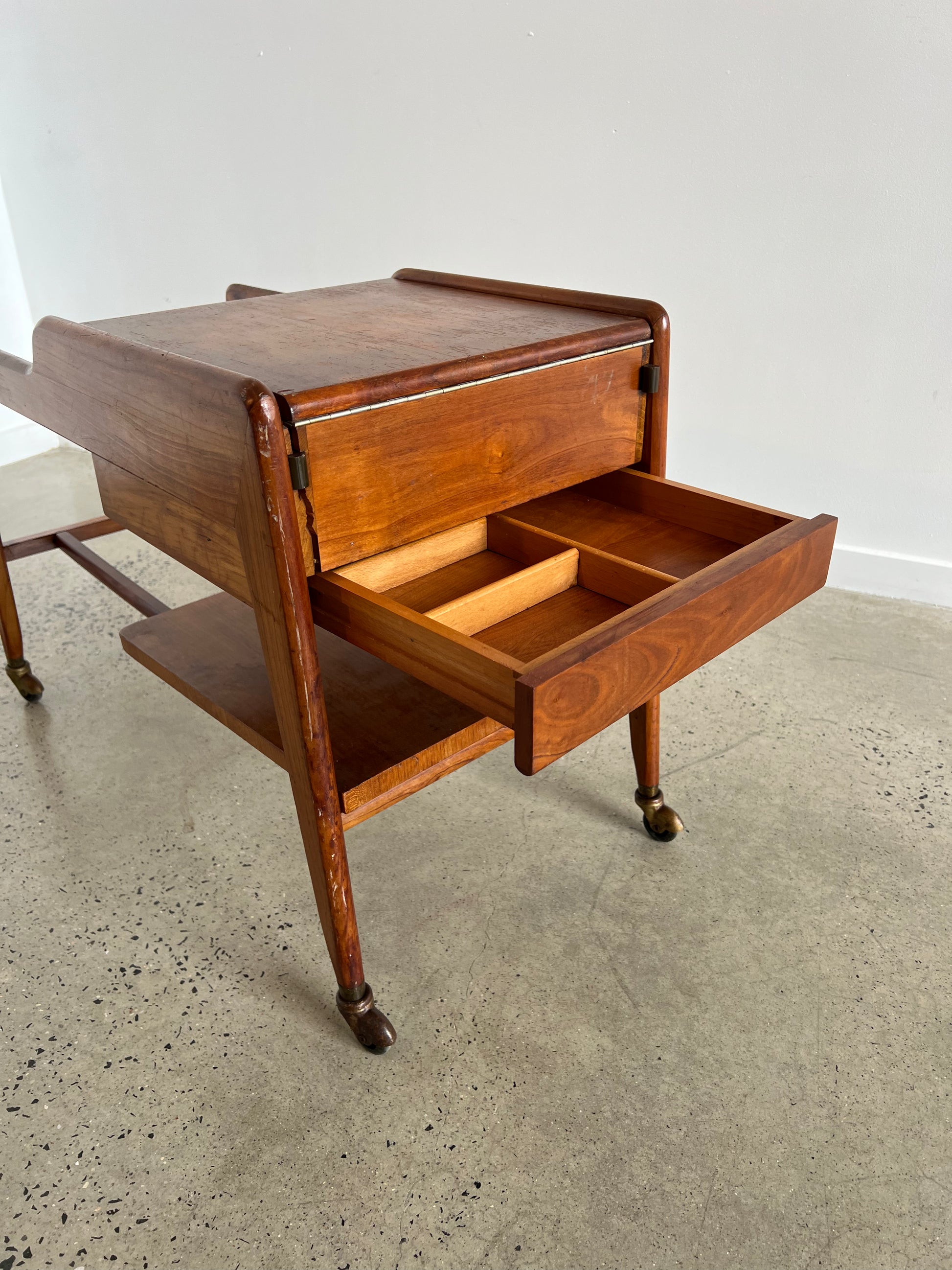 The trolley stands on four wheels, ensuring mobility and adaptability within interiors. A small crack is present next to the drawer, but it does not affect functionality, preserving the integrity of this collectible mid-century piece. The refined proportions and thoughtful storage make it equally useful as a drinks trolley or side serving cart.