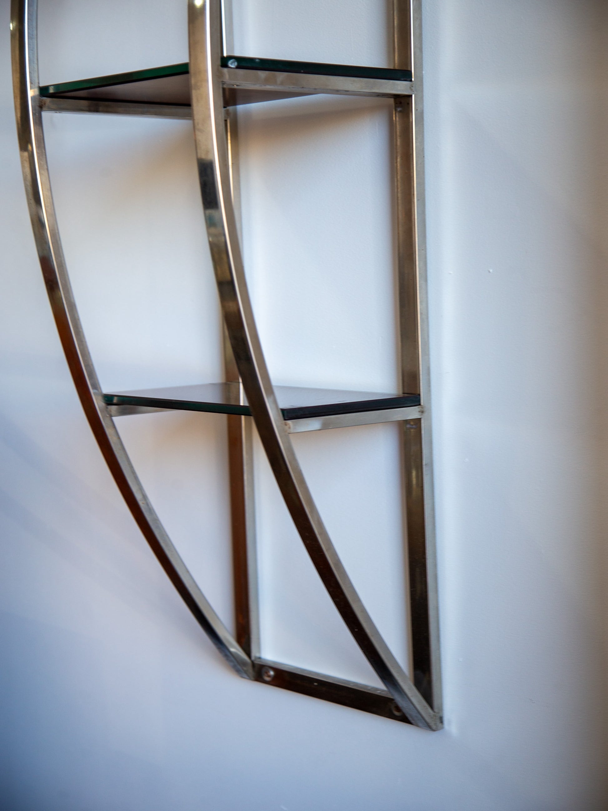 During the 1970s, materials like chrome and tempered glass became essential to the vocabulary of Italian modernism, embraced by pioneering architects and designers for their reflective surfaces, clean lines, and futuristic appeal. This shelf exemplifies the era's shift toward sleek, industrial materials that embodied both form and function-ideal for interiors seeking bold elegance with a modernist edge.